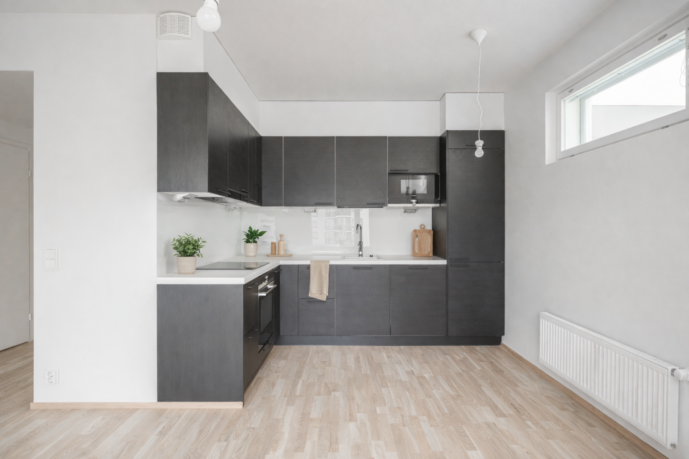Kodin sydän on avara ja tyylikäs tummasävyinen keittiö, jossa laadukkaat materiaalit ja ajaton ilme luovat näyttävän kokonaisuuden. Suuret ikkunat tuovat runsaasti luonnonvaloa ja korostavat avaraa tunnelmaa.