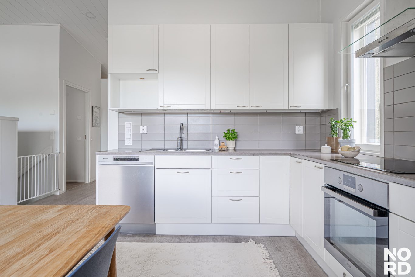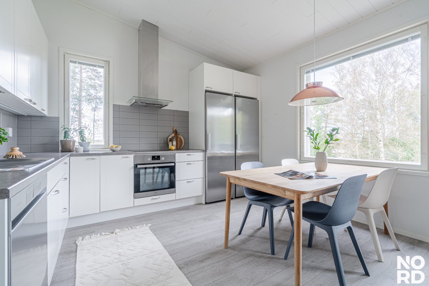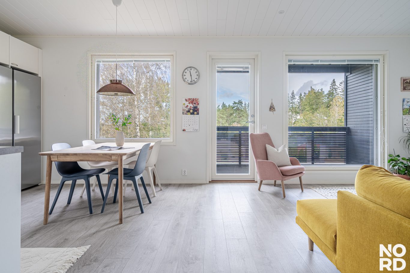 Korkea huonetila yhdistää olohuoneen ja keittiön upeaksi kokonaisuudeksi, jossa valo tulvii sisään suurista ikkunoista. Tämä avara tila muodostaa kodin sydämen täydellisen paikan yhteisiin hetkiin ja yhdessäoloon. Keittiö on varusteltu perhearkeen sopivilla kodinkoneilla, mm. uusitulla hiljaisella astianpesukoneella (2025). Keittiön yhteydessä on tilaa suurelle ruokailuryhmälle.