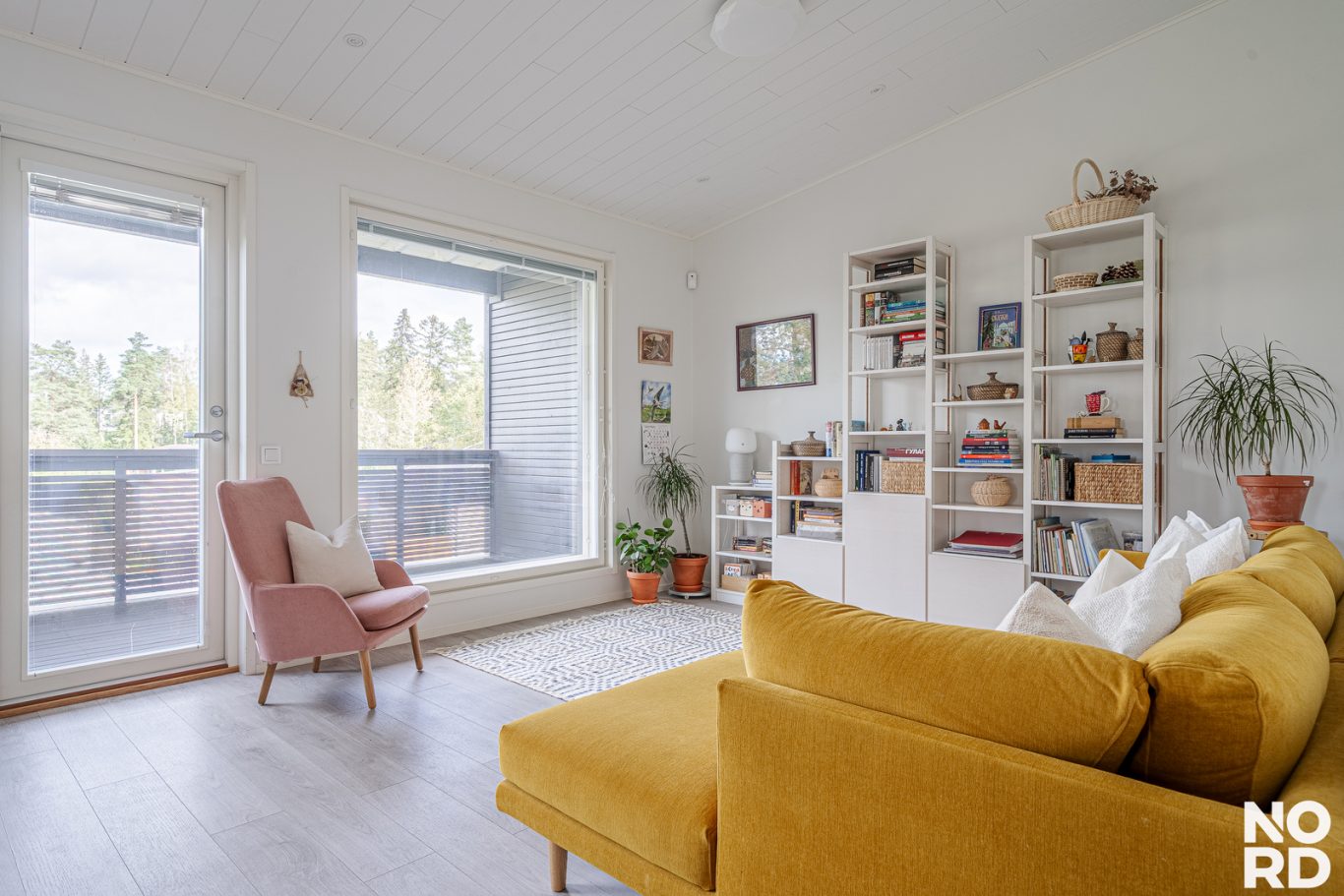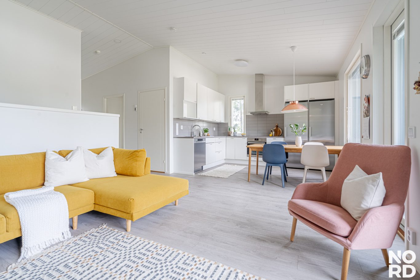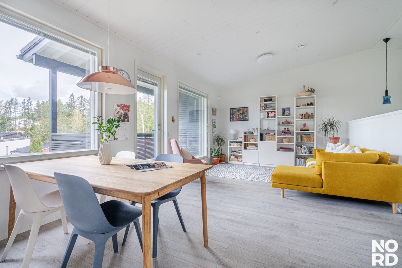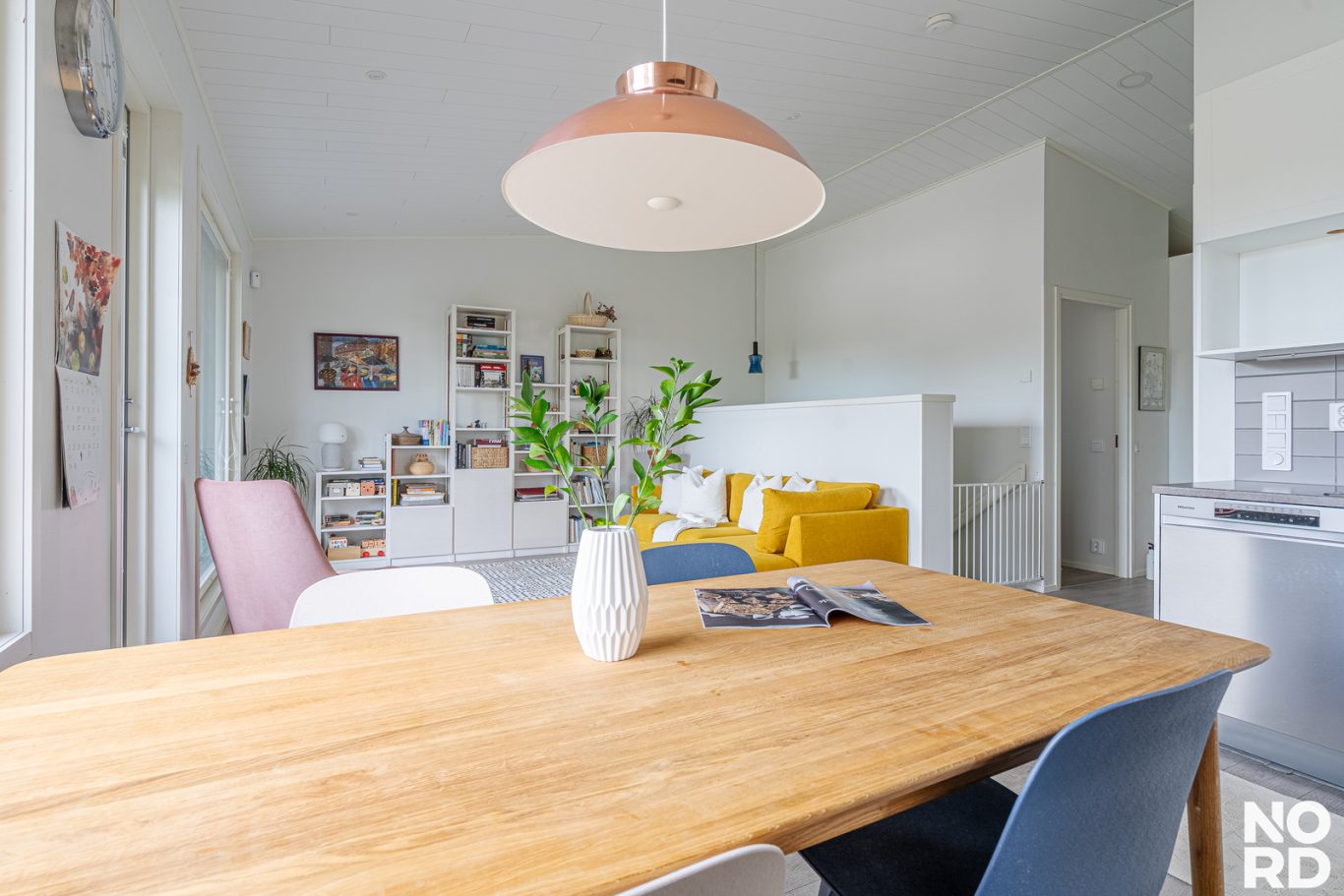 Korkea huonetila yhdistää olohuoneen ja keittiön upeaksi kokonaisuudeksi, jossa valo tulvii sisään suurista ikkunoista. Tämä avara tila muodostaa kodin sydämen täydellisen paikan yhteisiin hetkiin ja yhdessäoloon. Keittiö on varusteltu perhearkeen sopivilla kodinkoneilla, mm. uusitulla hiljaisella astianpesukoneella (2025). Keittiön yhteydessä on tilaa suurelle ruokailuryhmälle.