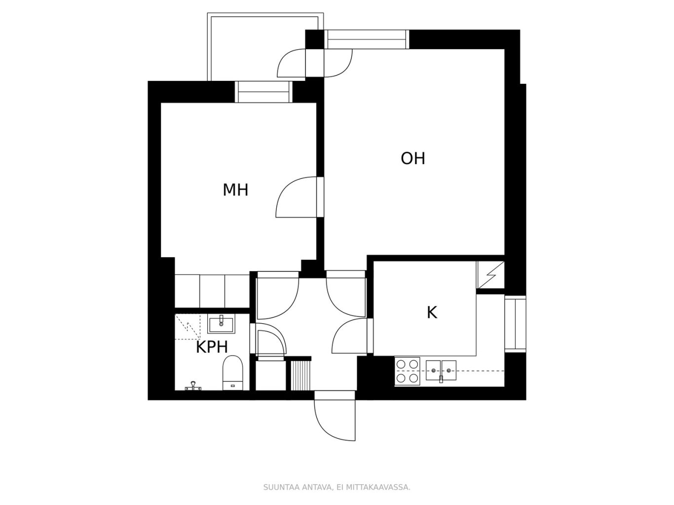 Hyvä pohjaratkaisu, erillinen keittiö, olohuoneesta ja eteisestä käynti makuuhuoneeseen, tilava kylpyhuone ja pieni parveke.