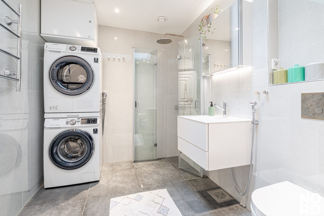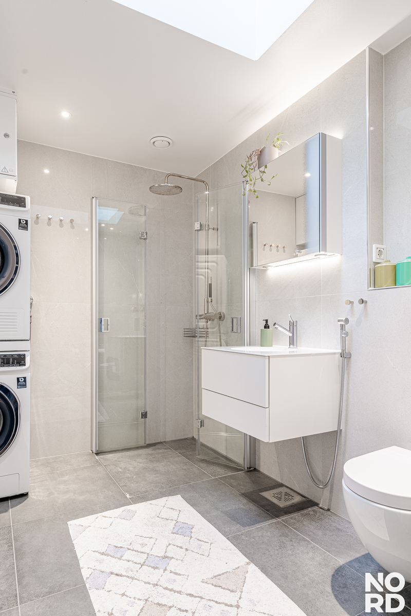 Tilavassa ja tyylikkäästi remontoidussa kylpyhuone/wc:ssä hoituu sujuvasti niin peseytyminen kuin kodinhoitoaskareetkin. Kylpyhuoneessa on kattoikkuna kohti taivasta.