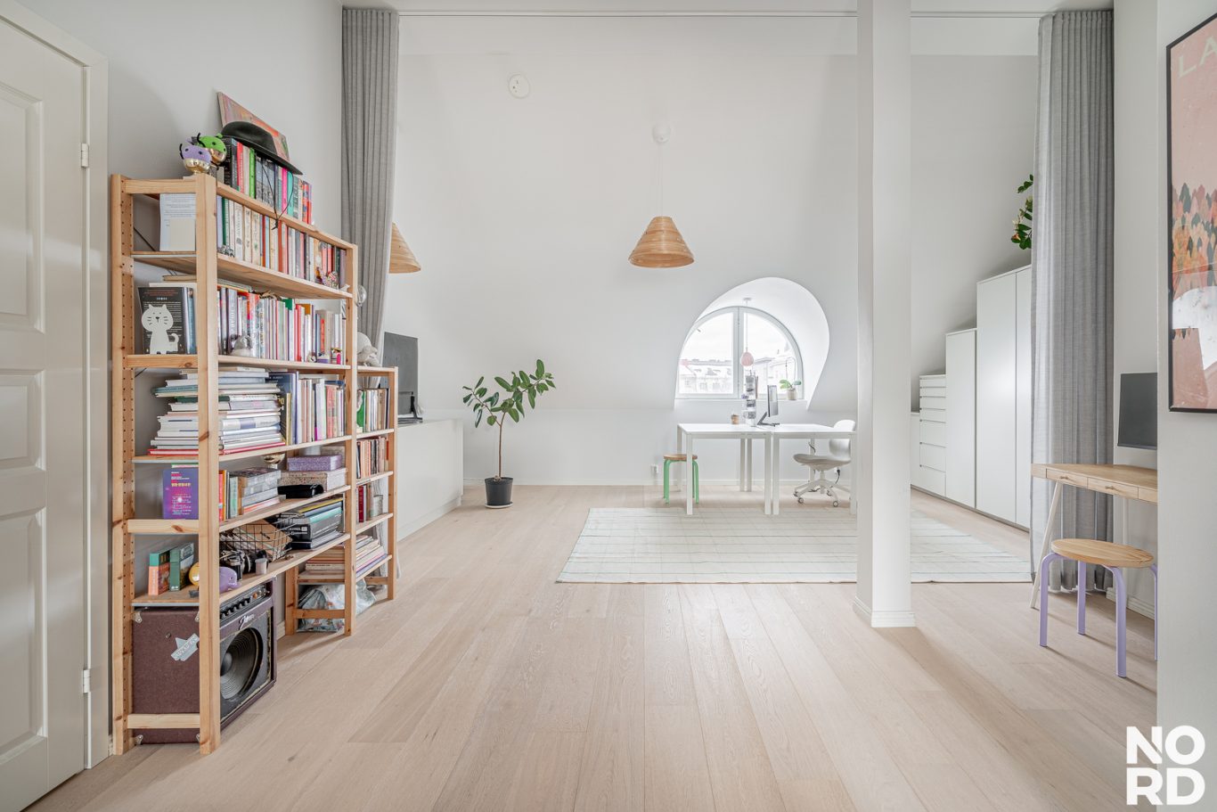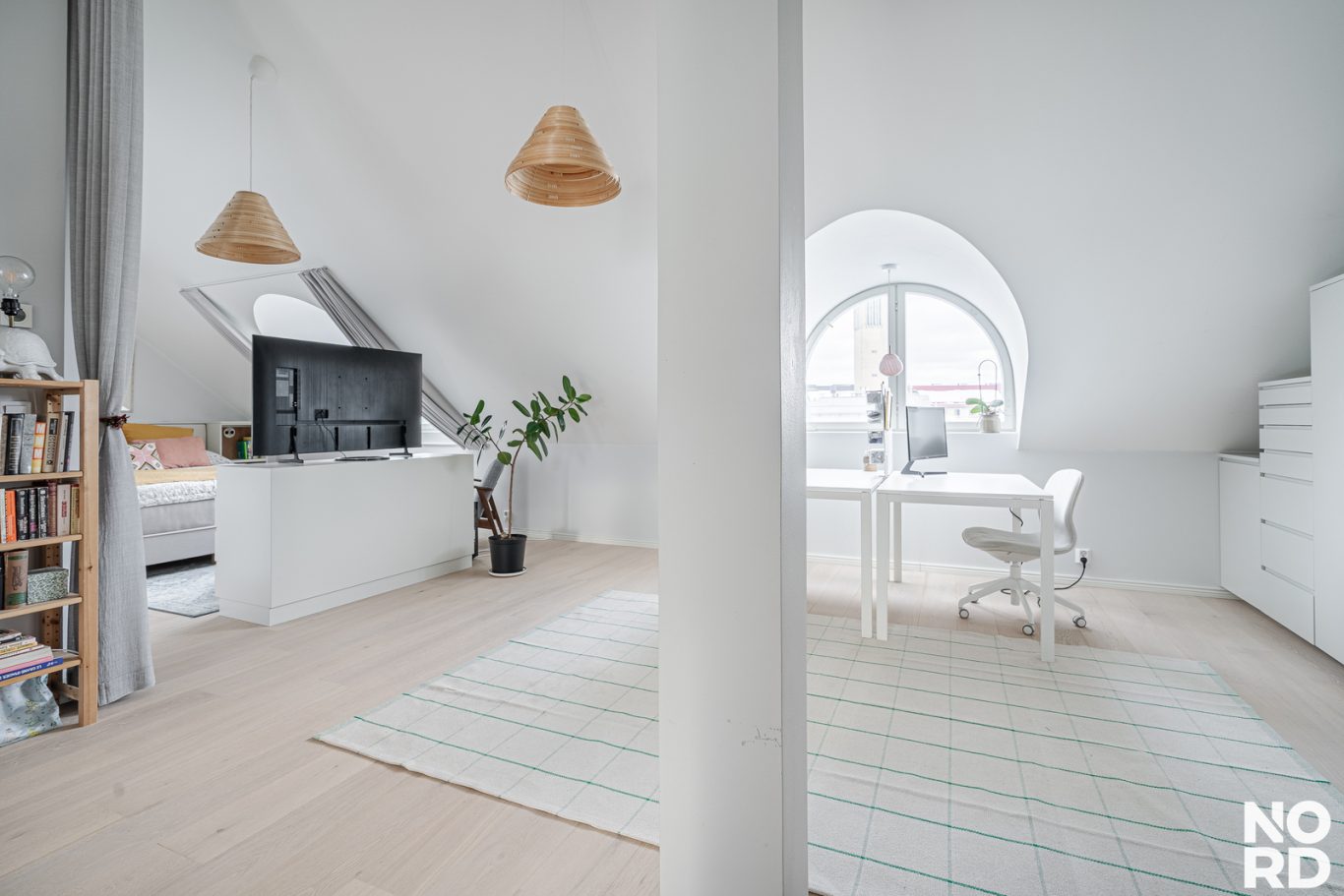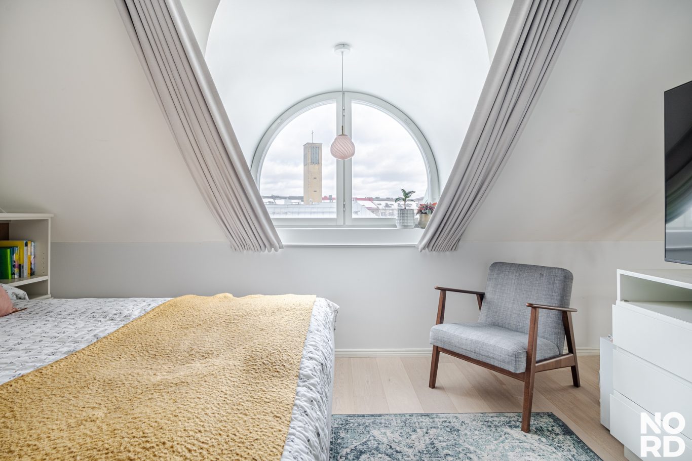 Olohuone on avointa isoa yhtenäistä tilaa makuuhuonepäädyn kanssa. Kauniit kaarevat ikkunat tekevät tilasta erityisen hienostuneen. Olohuoneeseen mahtuu isojakin kalusteita. Tilaa on myös etätyöpisteelle.