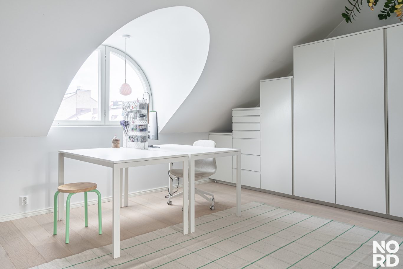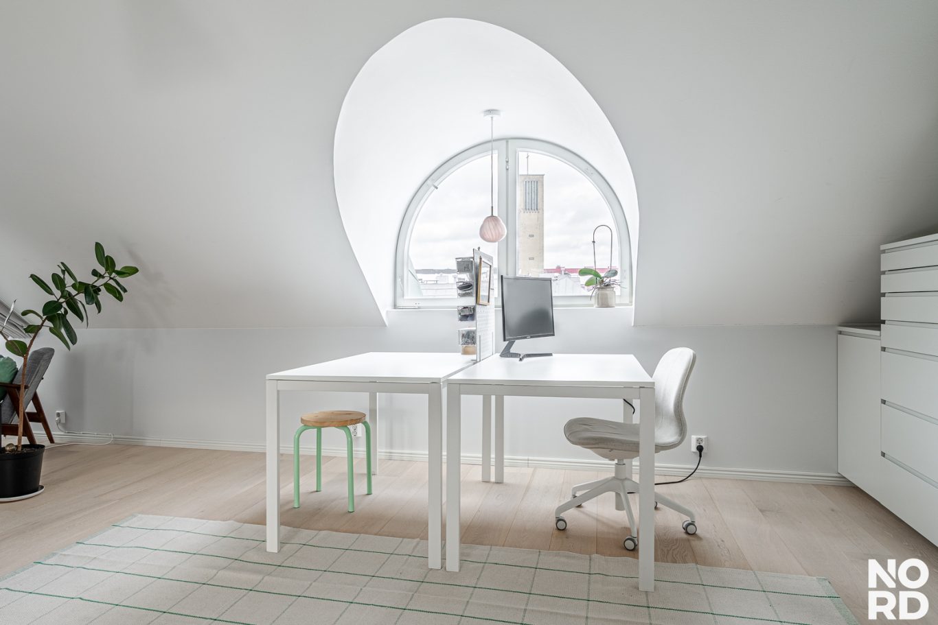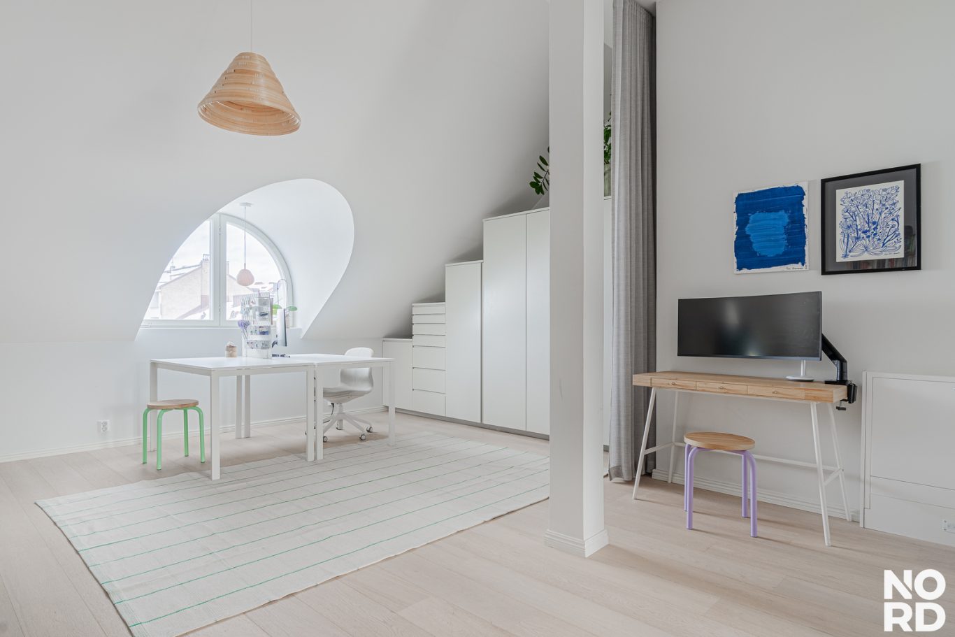 Olohuone on avointa isoa yhtenäistä tilaa makuuhuonepäädyn kanssa. Kauniit kaarevat ikkunat tekevät tilasta erityisen hienostuneen. Olohuoneeseen mahtuu isojakin kalusteita. Tilaa on myös etätyöpisteelle.