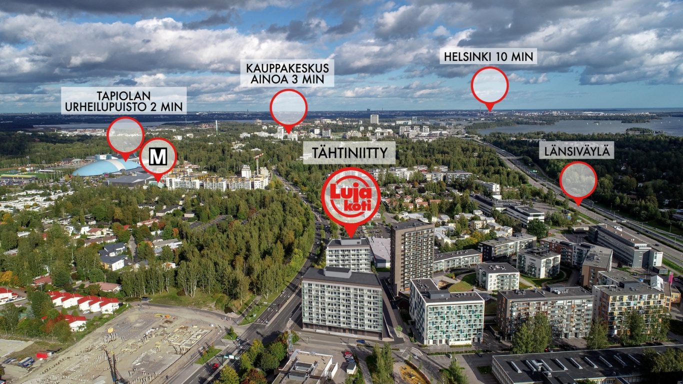Loistavat liikenneyhteydet, metro 500 m päässä ja bussipysäkiltä on suora kävely-yhteys pihakannelle.