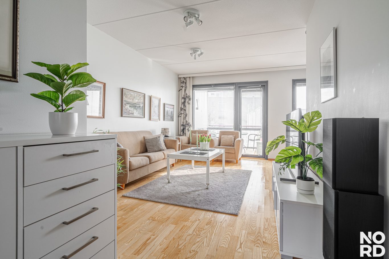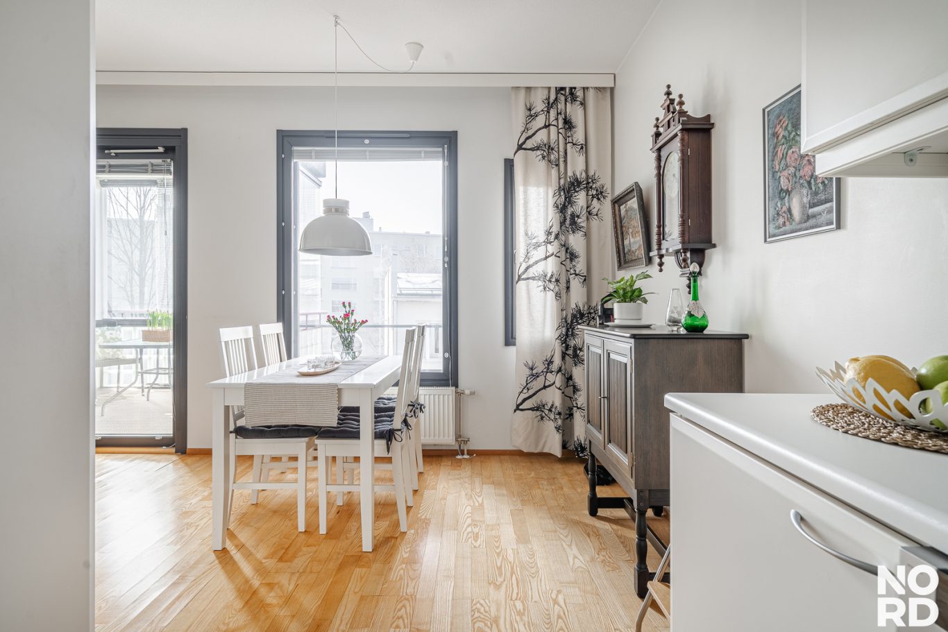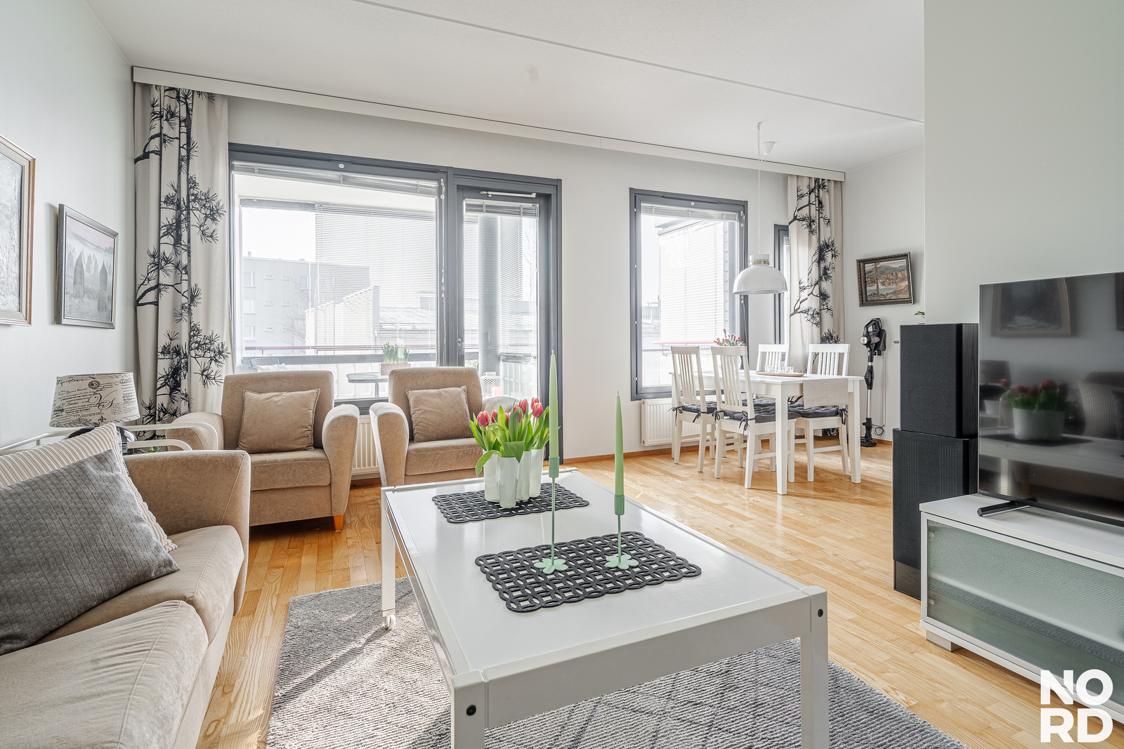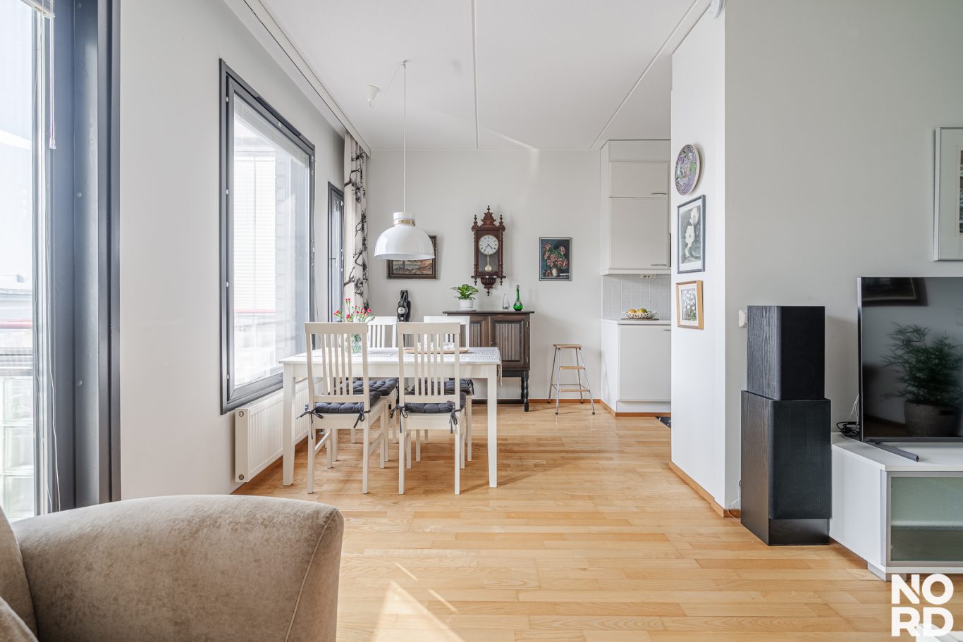 Huoneiston toimiva pohjaratkaisu tekee arjesta sujuvaa. Avara olohuone avautuu lasitetulle länsiparvekkeelle, jossa voit nauttia ilta-auringosta. Keittiön yhteydessä on ruokailutila.