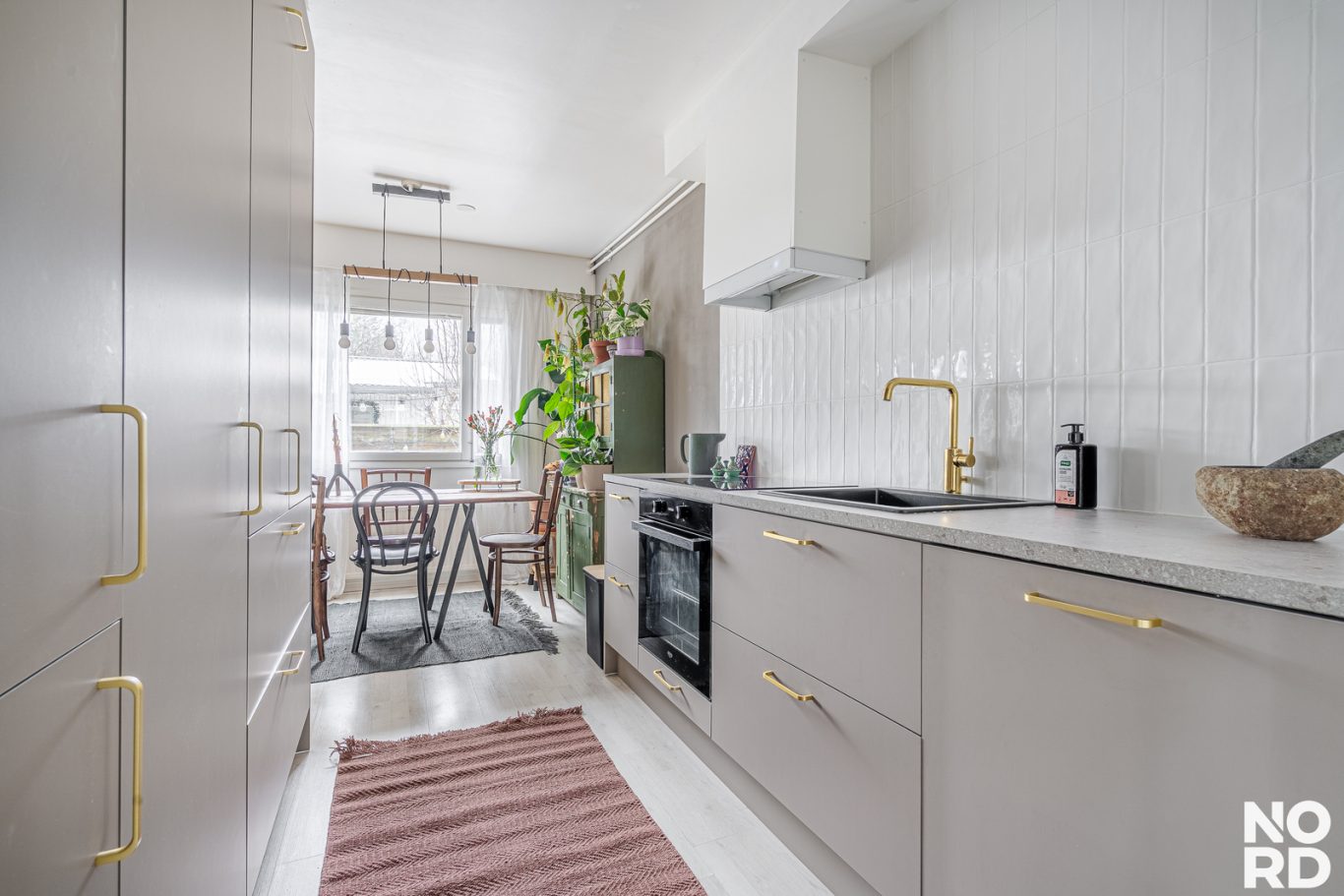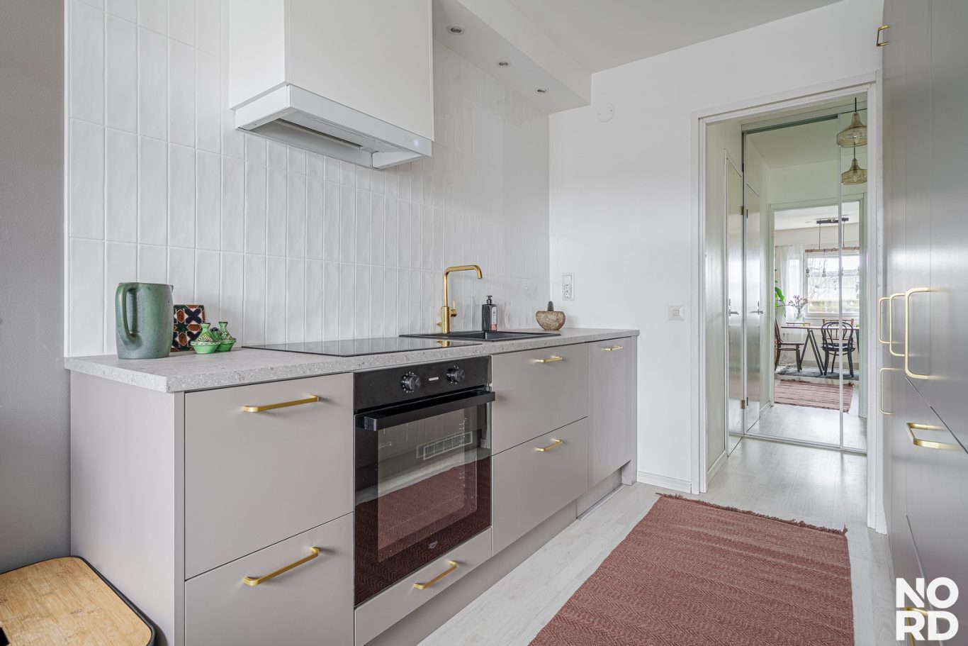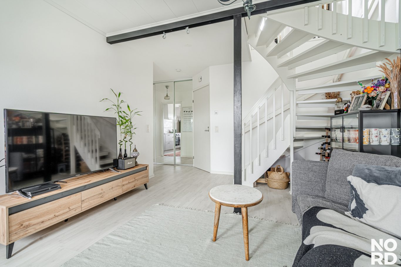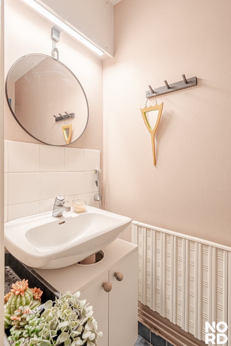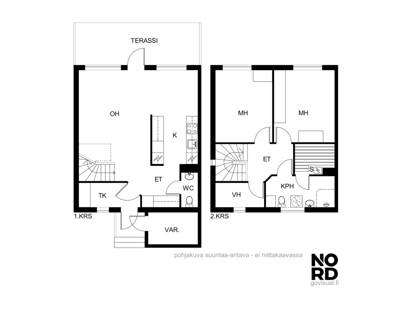 Huoneiston asuintilat sijaitsevat kahdessa kerroksessa. Sisääntulokerroksessa sijaitsevat keittiö, ruokailutila, olohuone sekä erillinen wc. Keittiö on remontoitu tyylikkäästi, hyvällä maulla 12/2025. Keittiössä on hyvin sekä kaappi- että laskutilaa. Aamiaiskaappi kuuluu myös varustukseen. Ruokailutila yhdistää kauniisti keittiön ja olohuoneen yhteen.