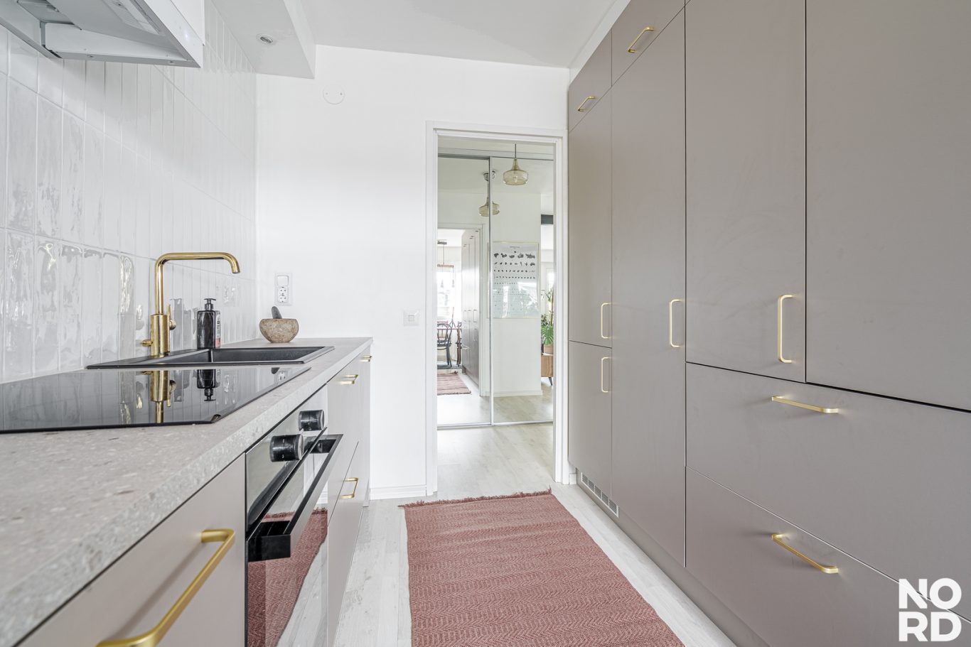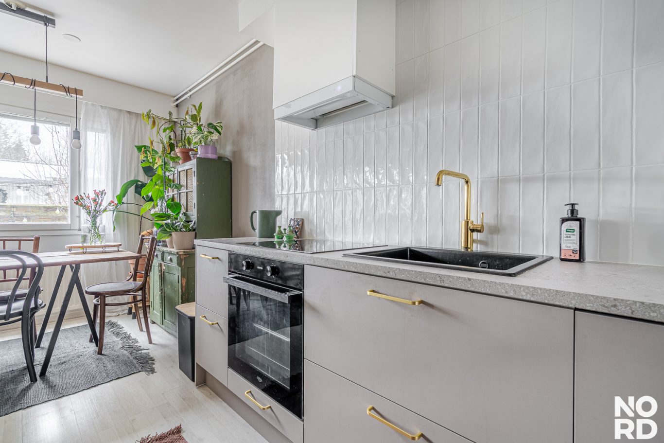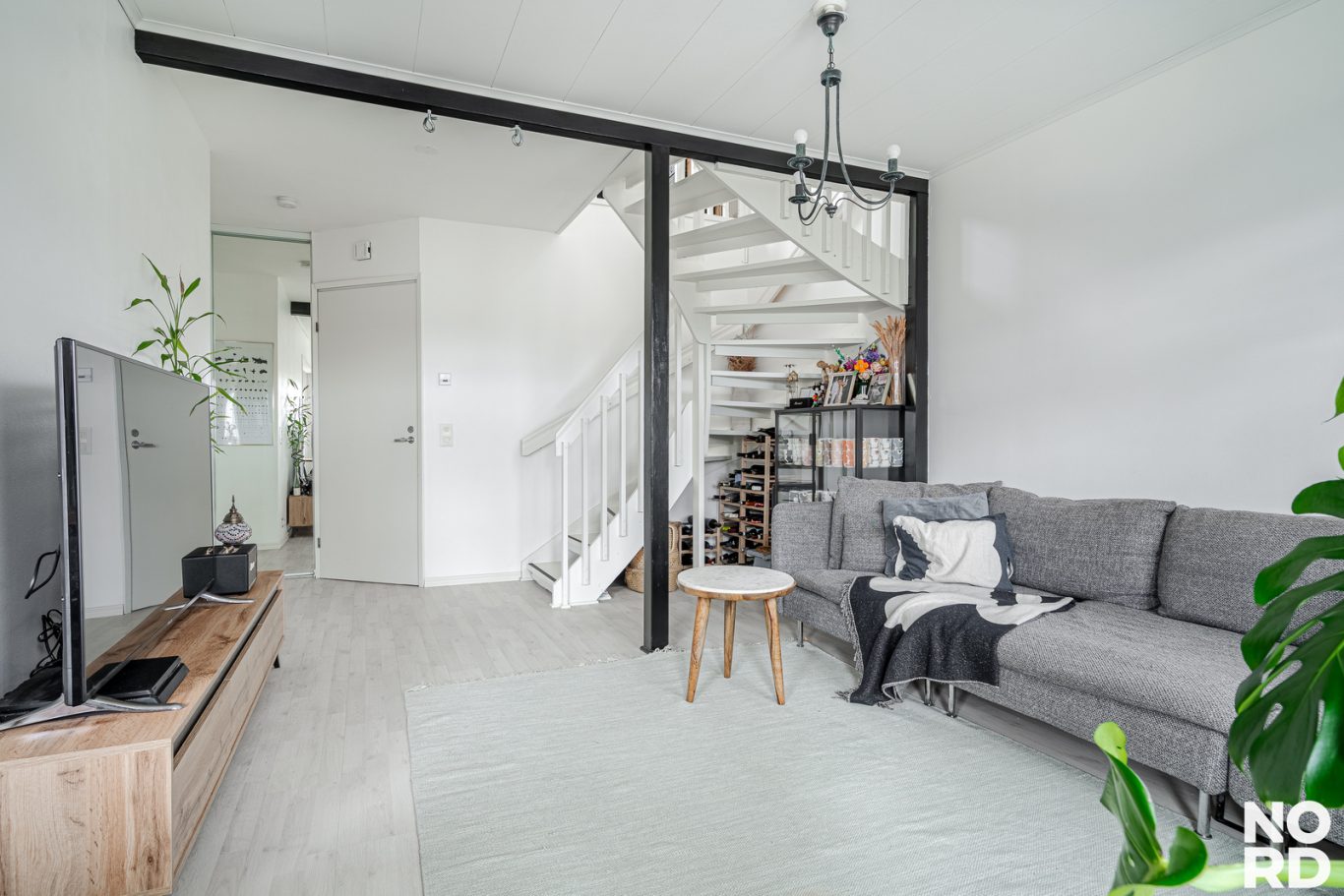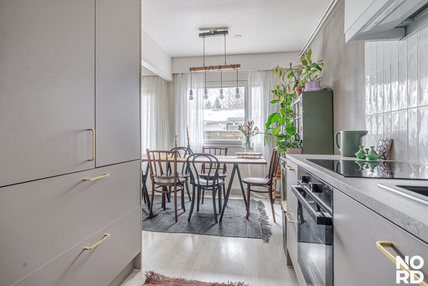 Huoneiston asuintilat sijaitsevat kahdessa kerroksessa. Sisääntulokerroksessa sijaitsevat keittiö, ruokailutila, olohuone sekä erillinen wc. Keittiö on remontoitu tyylikkäästi, hyvällä maulla 12/2025. Keittiössä on hyvin sekä kaappi- että laskutilaa. Aamiaiskaappi kuuluu myös varustukseen. Ruokailutila yhdistää kauniisti keittiön ja olohuoneen yhteen.