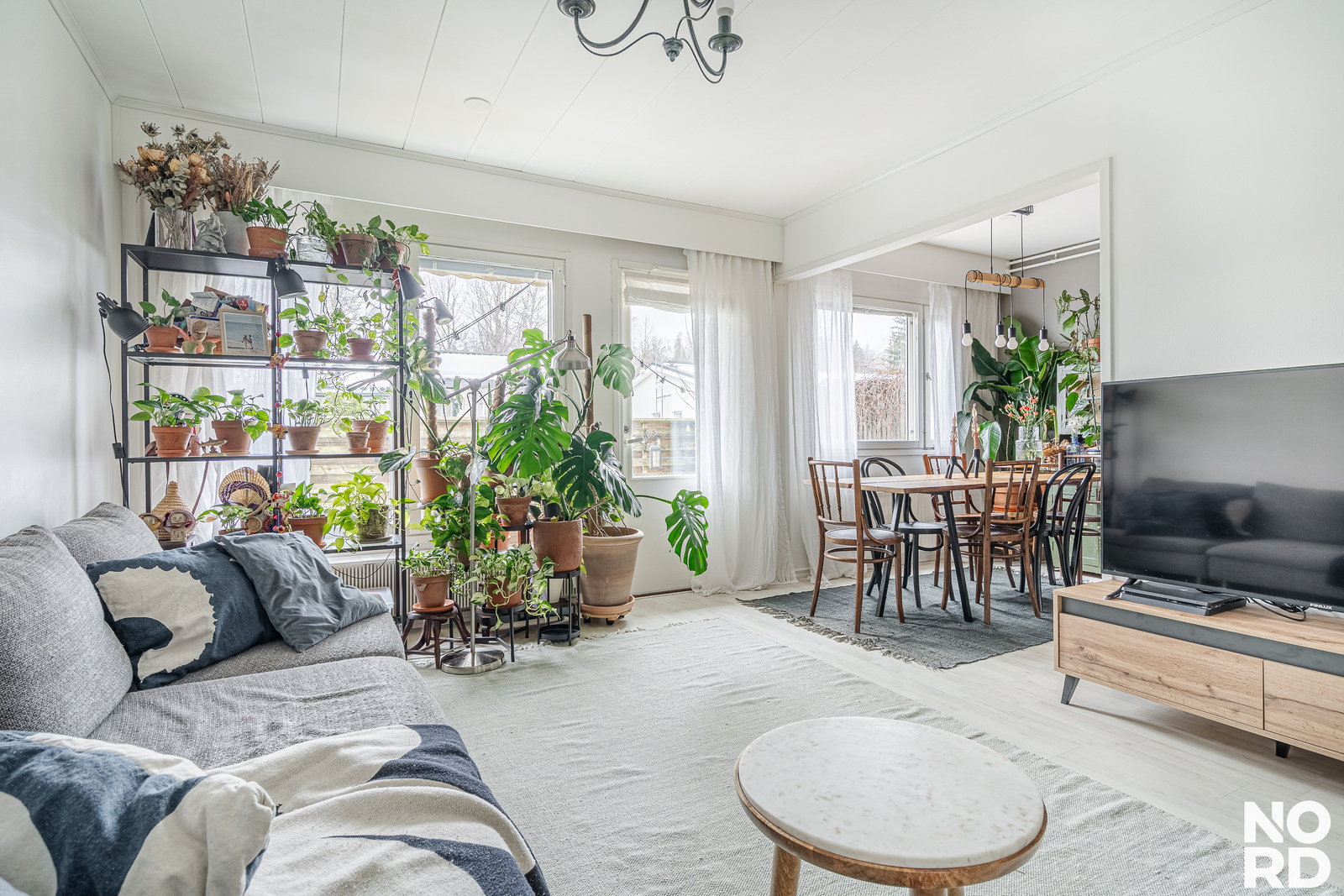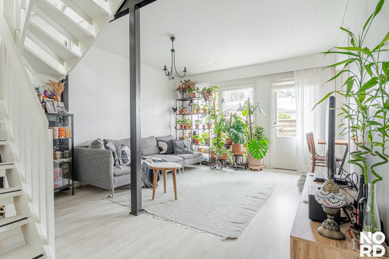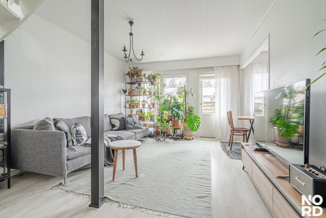 Olohuone on valoisa ja olohuoneesta on käynti tilavalle terassille, jonka laudoitus on uusittu 2022.