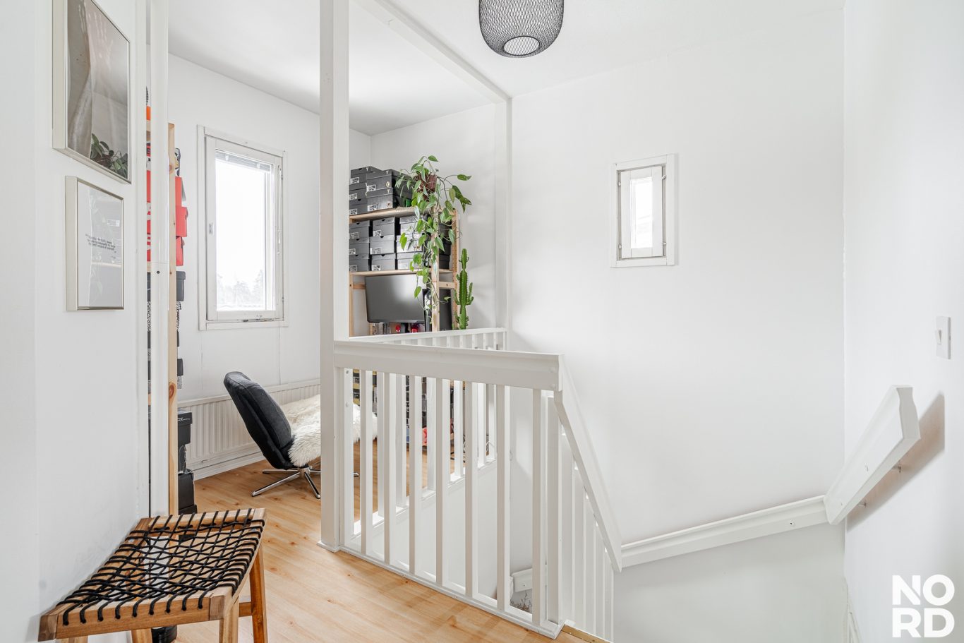 Makuuhuoneet sekä kylpyhuone ja sauna sijaitsevat yläkerrassa. Molemmat makuuhuoneet ovat hyvänkokoisia ja kaappitilaa on runsaasti. Yläkerran aulatilaan saa kätevästi sijoitettua työpisteen.