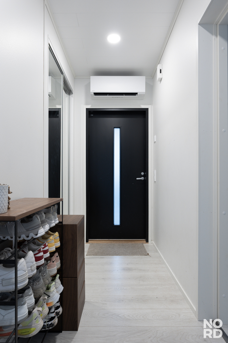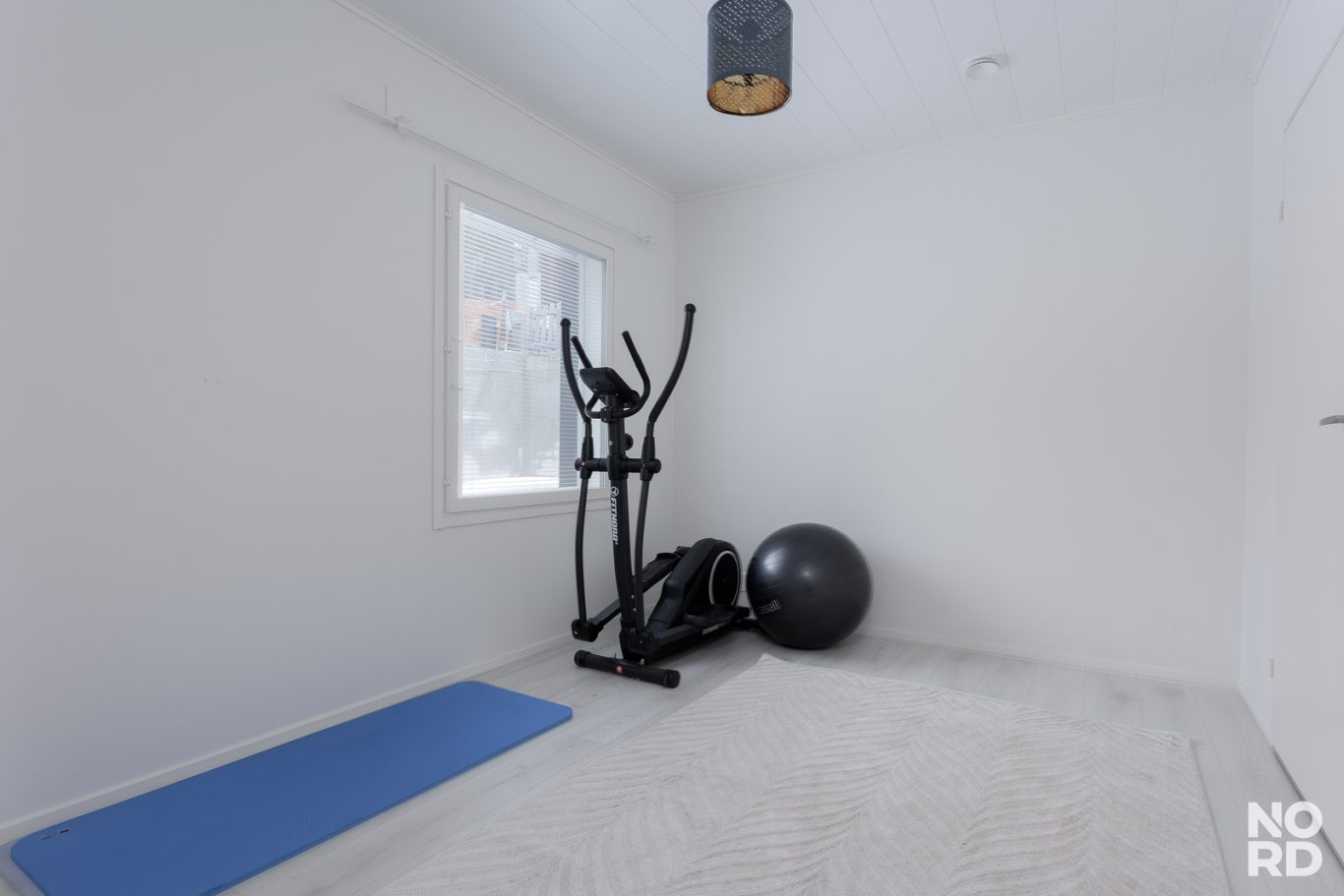 Pohjaratkaisu on toimiva ja neliöt käytetty tehokkaasti. Keittiö ja olohuone muodostavat yhtenäisen valoisan tilan. Olohuoneesta uloskäynti aidatulle takapihalle sekä käyttöullakko, jossa runsaasti lisää säilytystilaa tai mahdollisuus harrastetilaan.