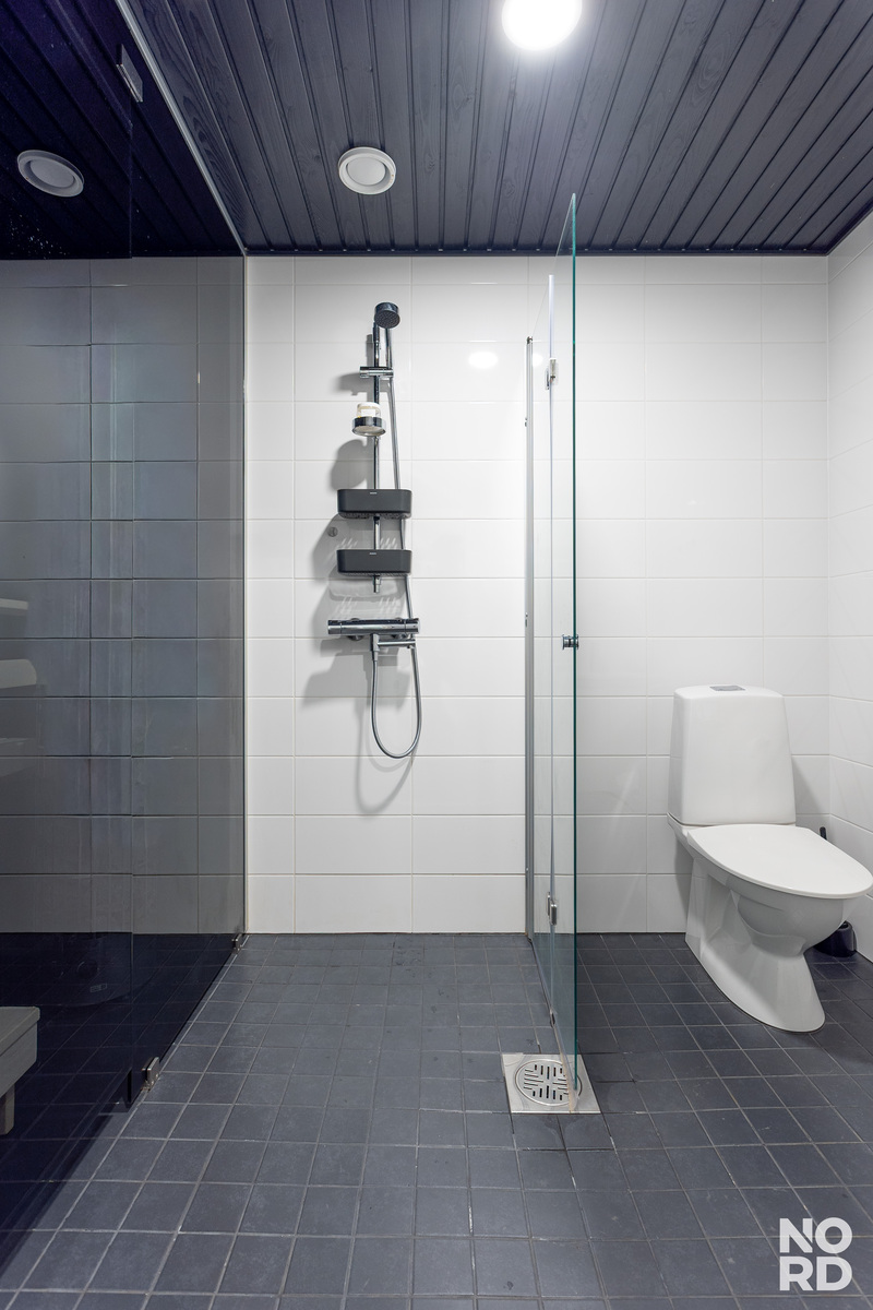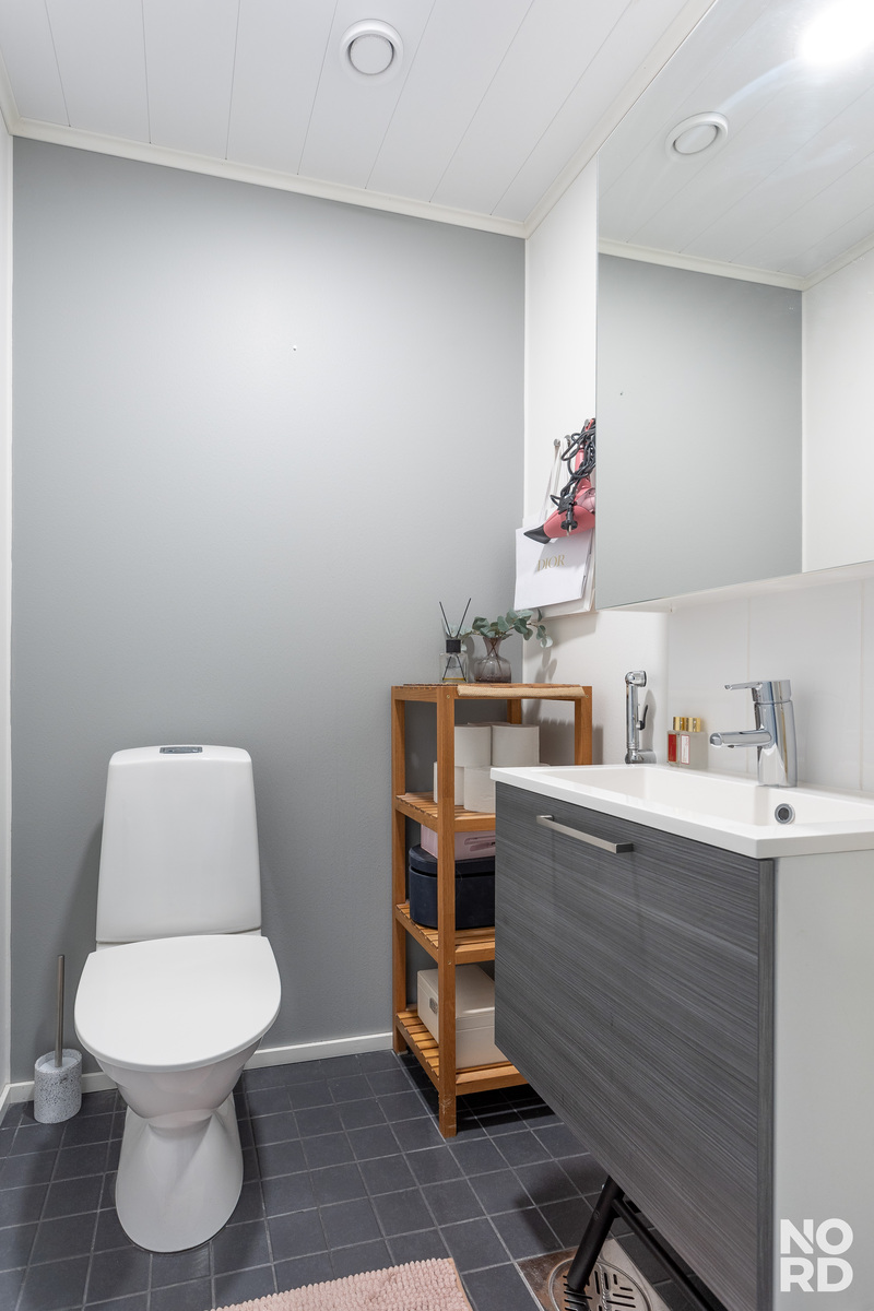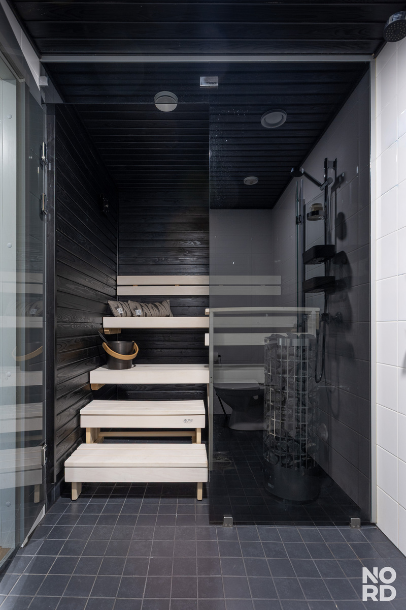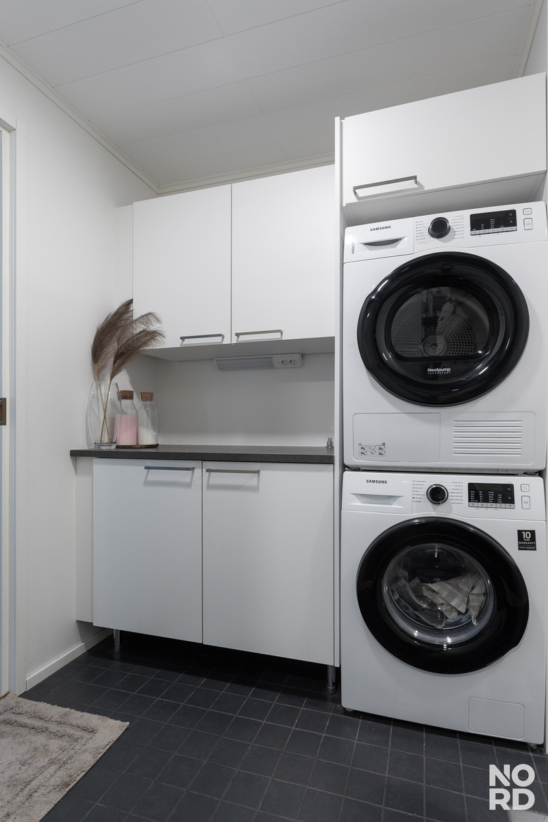 Kodinhoitohuoneessa tilaa pesutornille, hyvät kaapistot, allas ja pöytätaso. Sauna arjen rentoutukseen.