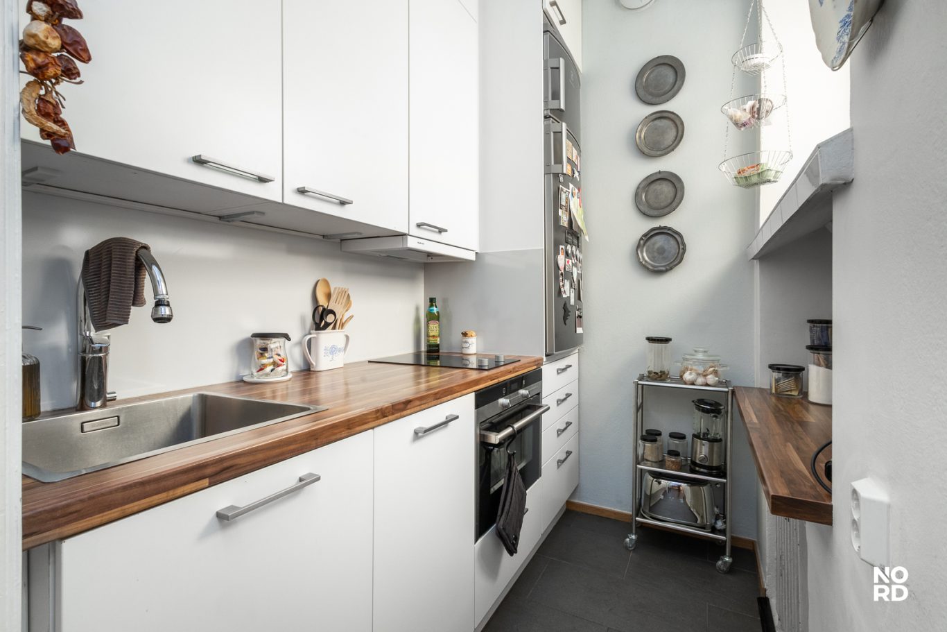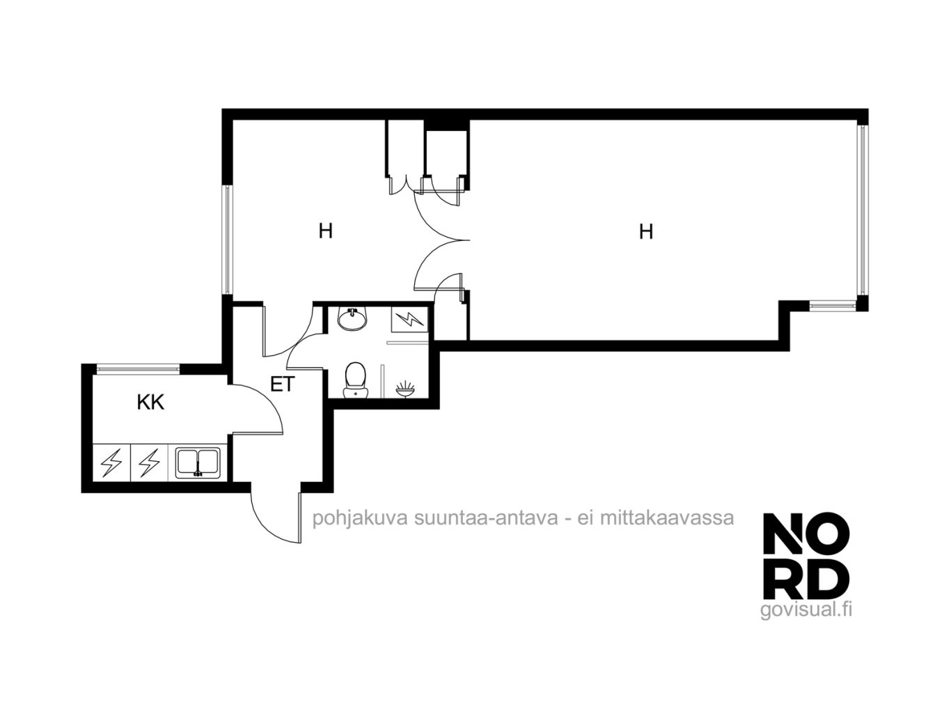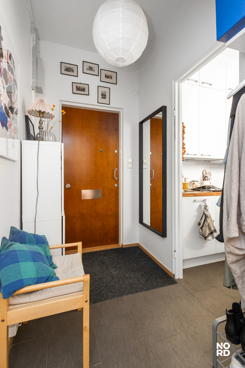 Asunnolla on läpitalon pohjaratkaisu, valoa tulvii olohuoneen isosta erkkeri-ikkunasta ja pihan puolelle saa tuuletuksen keittiöstä ja makuuhuonetilasta.