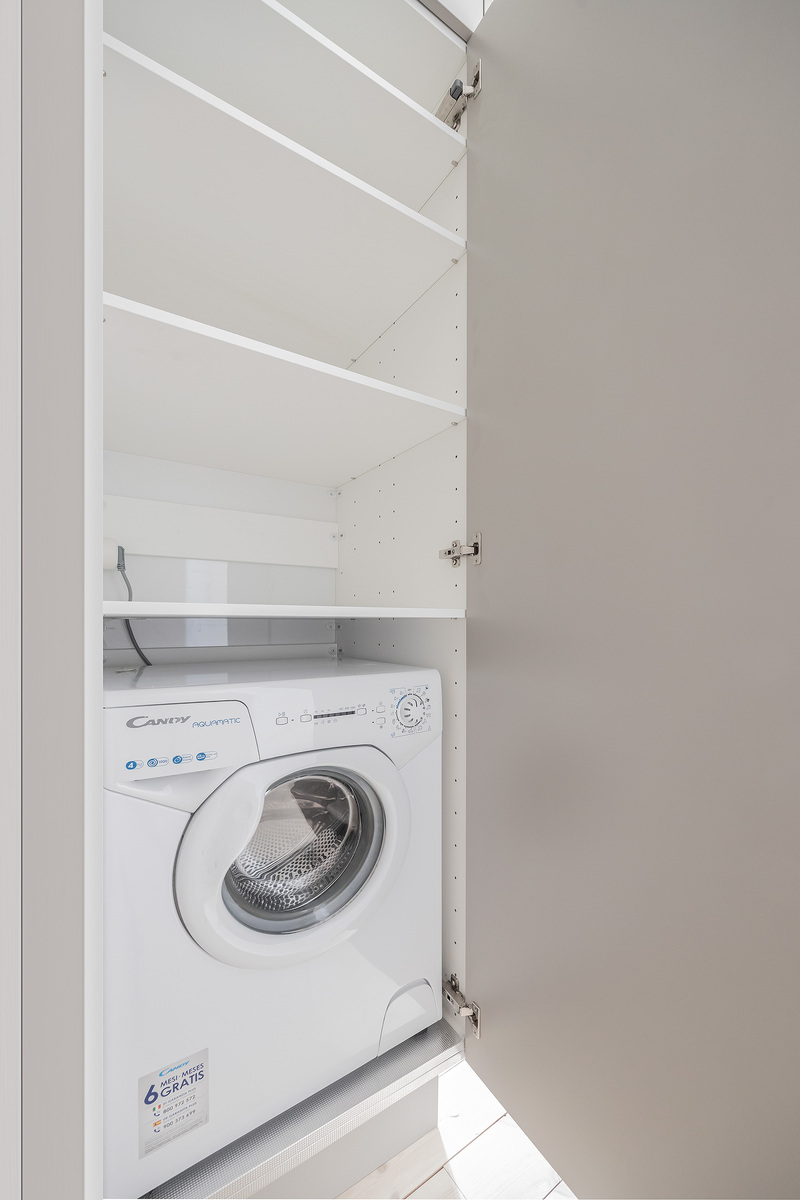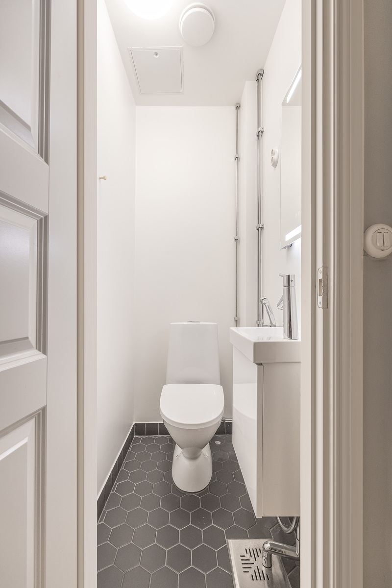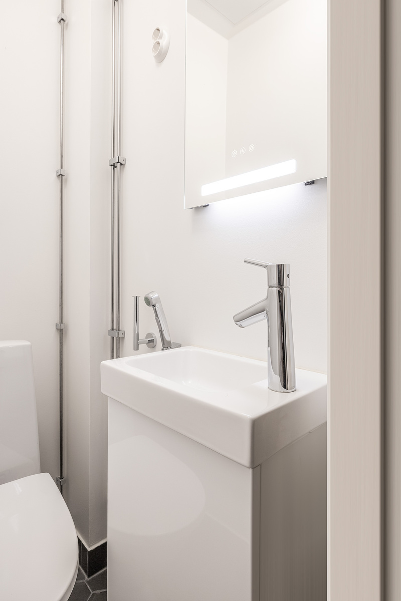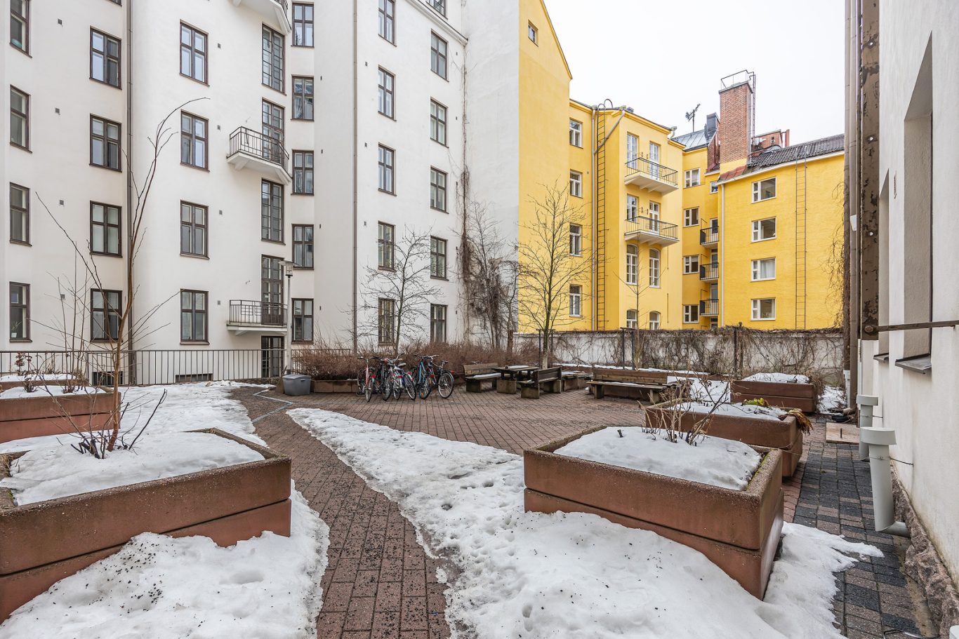 Asunnossa suuret ikkunat sisäpihalle, erillinen kylpyhuone ja wc, pyykinpesukoneelle on myös oma tila.