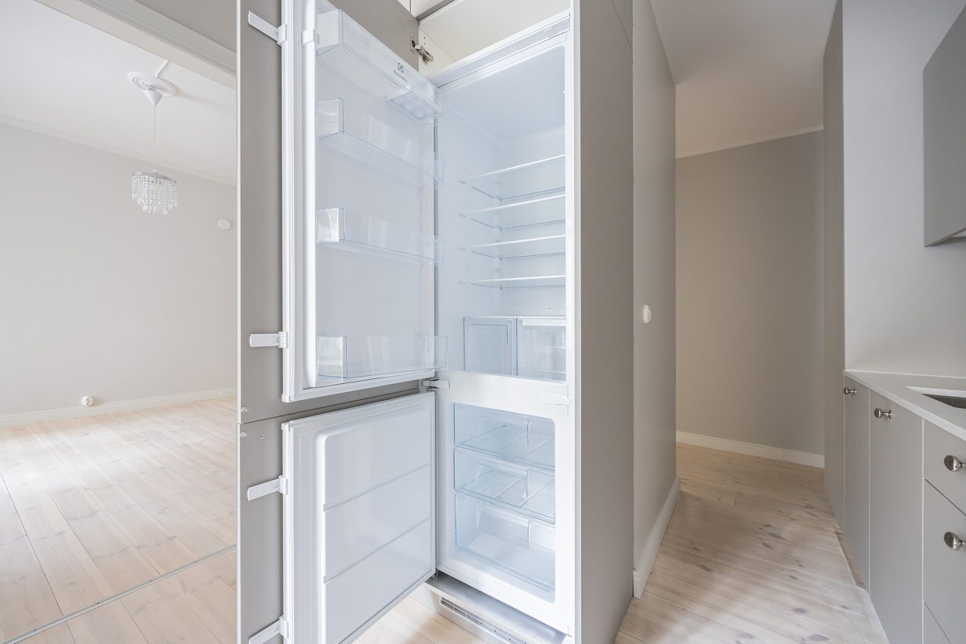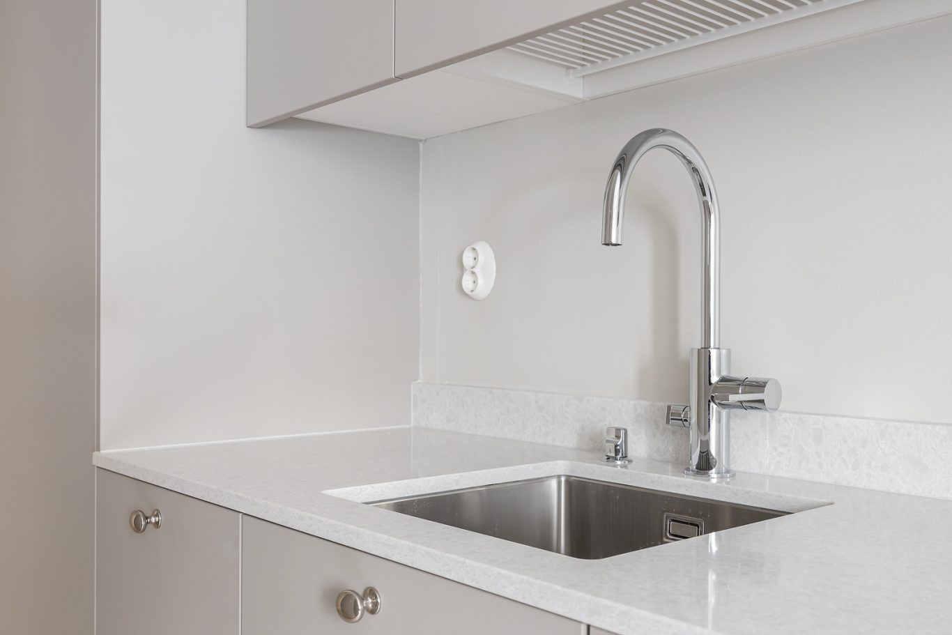 Upea juuri uusittu Lilla Creationin suunnittelema ja HandyHandin toteuttama mittatilauskeittiö kvartsitasoin ja laadukkain kodinkonein. Avokeittiö ja ruokailutila avautuvat olohuoneeseen.