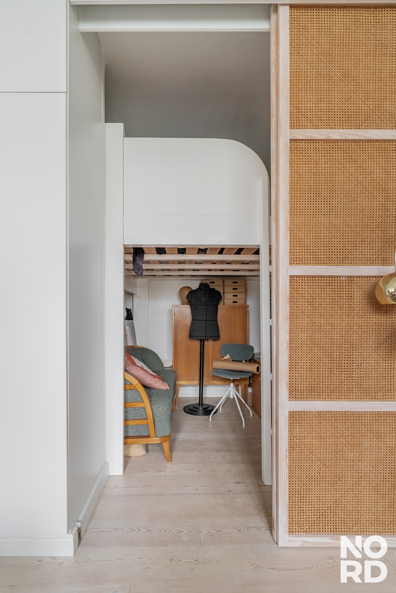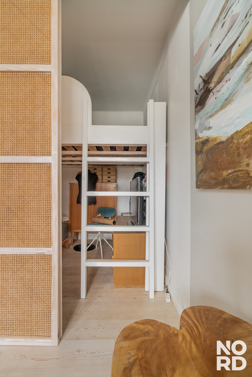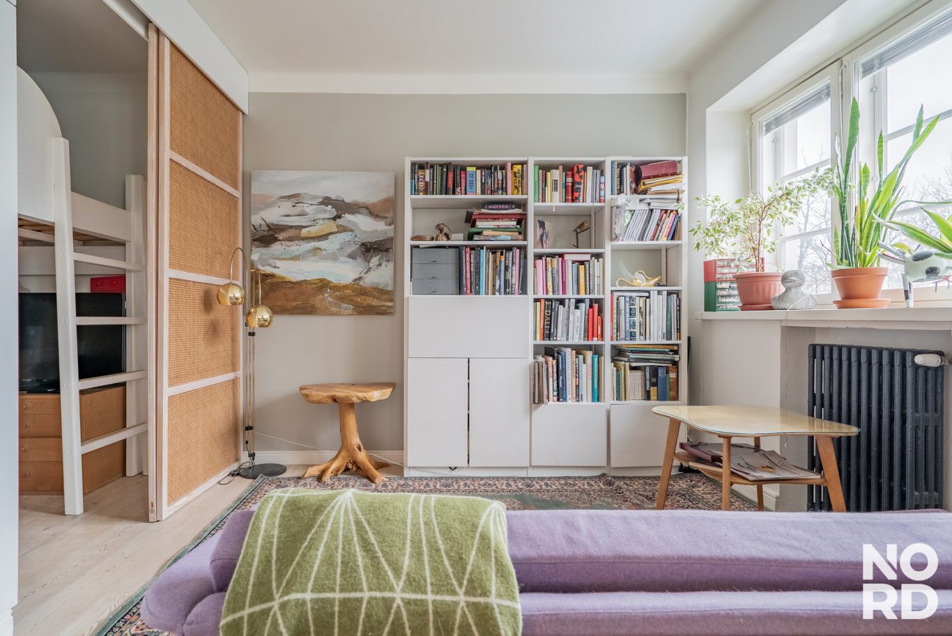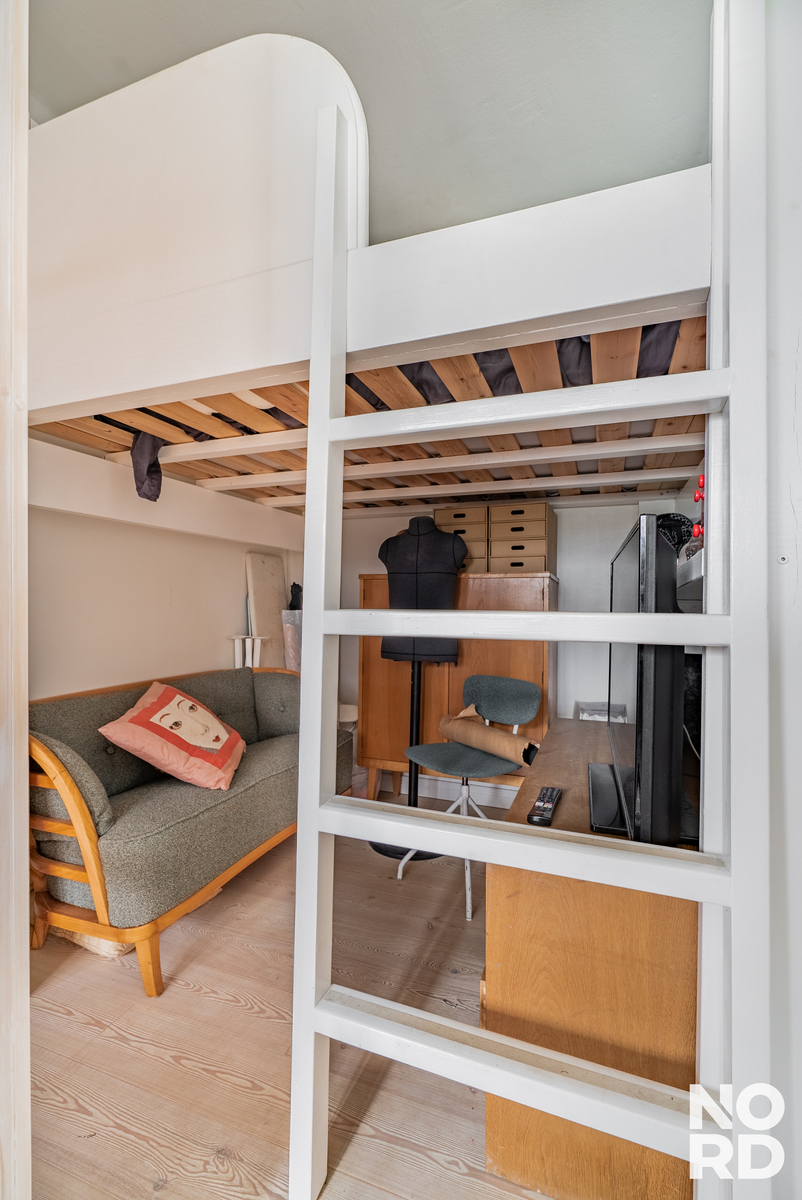 Asunnon avara olohuone ja makuualkovi muodostavat toimivan ja viihtyisän kokonaisuuden. Alkovi on erotettu liukuovilla. Toimiva avokeittiö ja kylpyhuone edustaa linjasaneerauksen myötä nykyaikaista ja siistiä ilmettä.