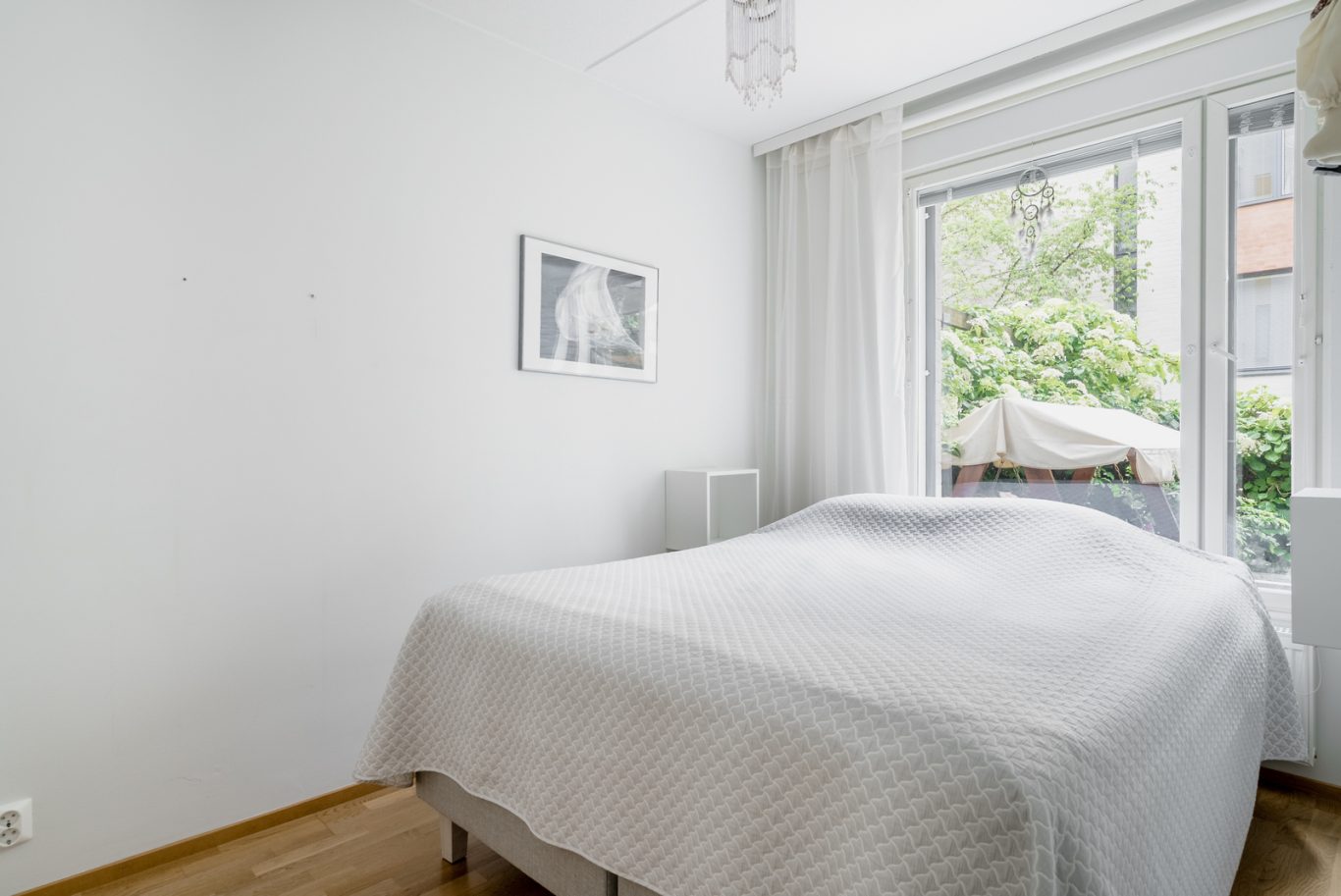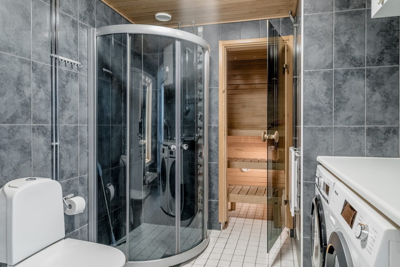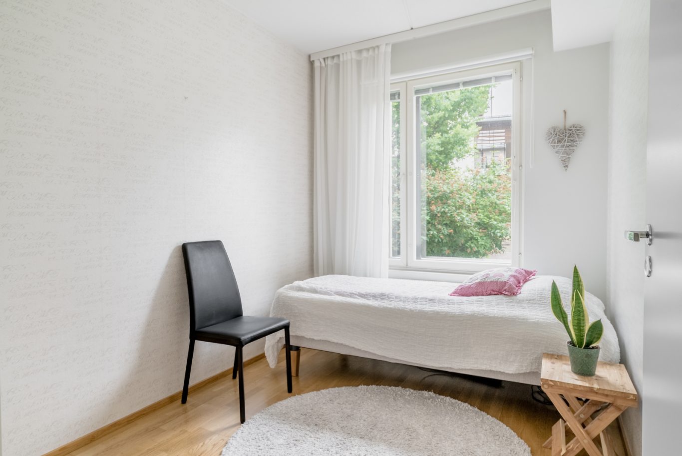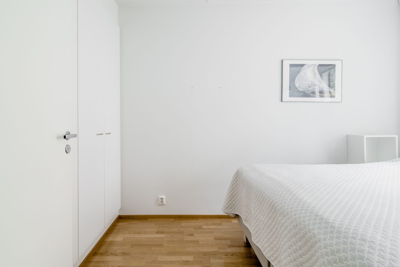 Asunnossa on iso kylpyhuone saunalla. Tilaan mahtuu hyvin pyykinpesukone ja kuivausrumpu, ja näiden päällä on runsaasti laskutilaa. Käytävän varrella on myös asunnon toinen makuuhuone, josta on näkymät vehreälle kävelykadulle. Iso vaatehuone muuntuu vaivatta vaikka työhuoneeksi juuri tätä funktiota nykyiset asukkaat ovat hyödyntäneet.