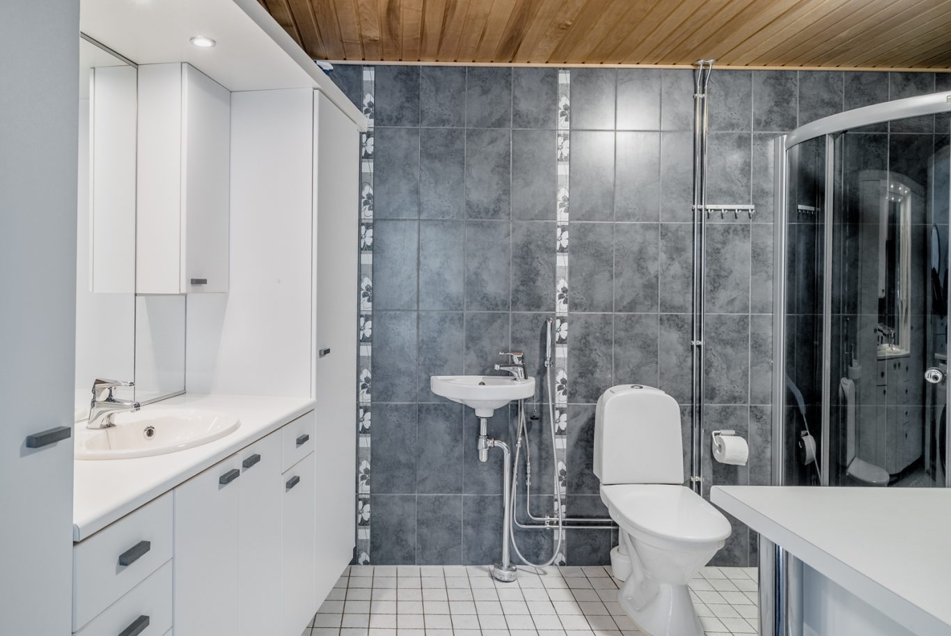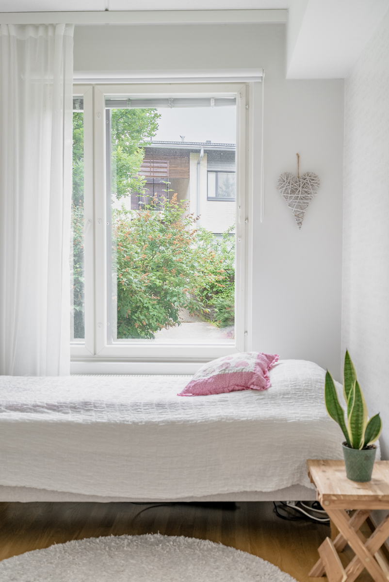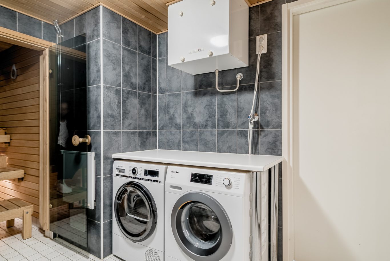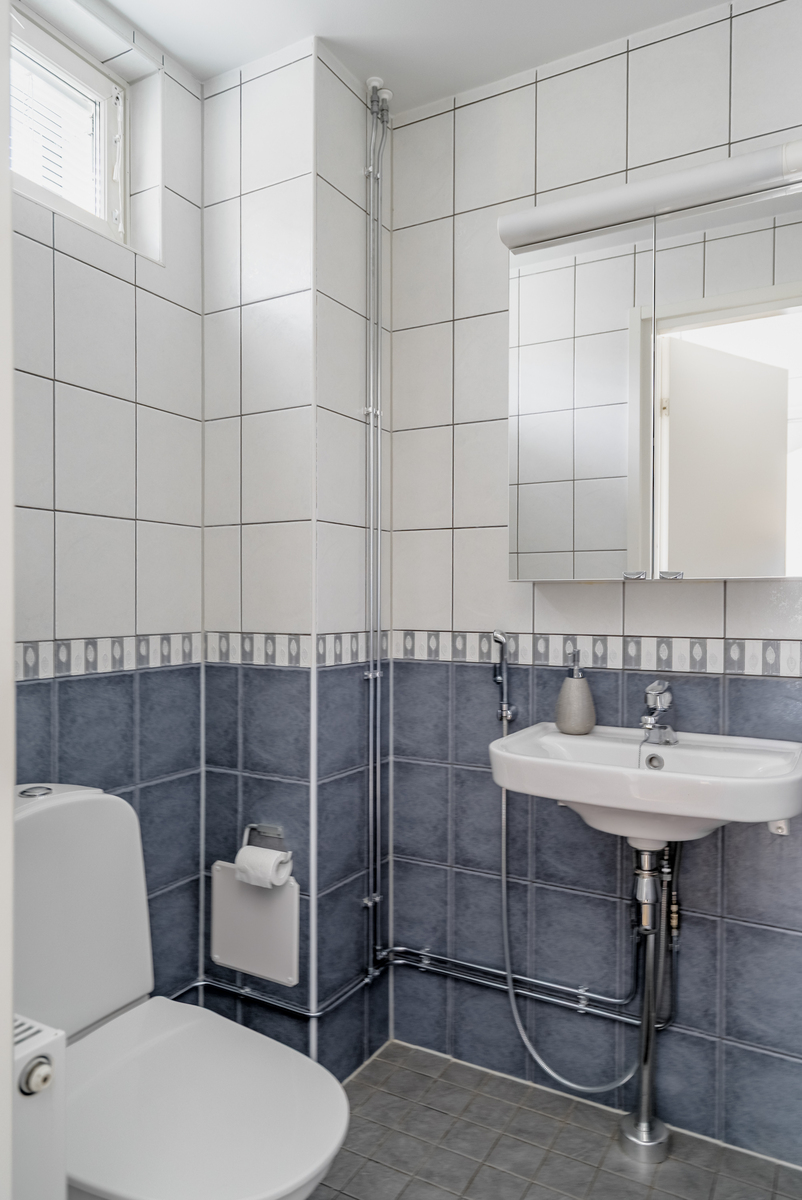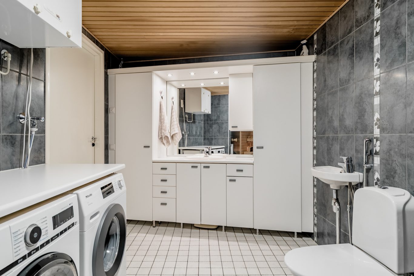 Asunnossa on iso kylpyhuone saunalla. Tilaan mahtuu hyvin pyykinpesukone ja kuivausrumpu, ja näiden päällä on runsaasti laskutilaa. Käytävän varrella on myös asunnon toinen makuuhuone, josta on näkymät vehreälle kävelykadulle. Iso vaatehuone muuntuu vaivatta vaikka työhuoneeksi juuri tätä funktiota nykyiset asukkaat ovat hyödyntäneet.