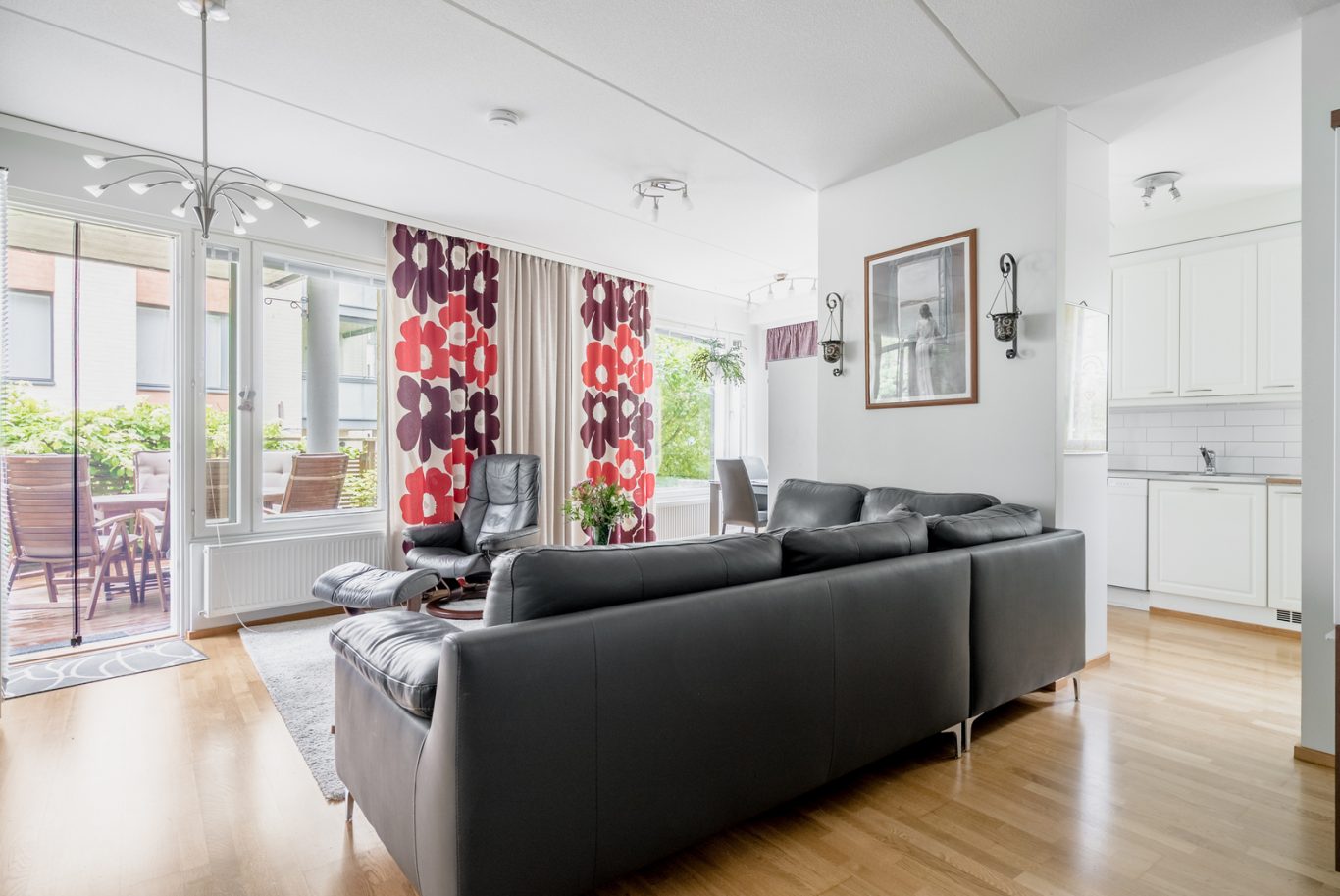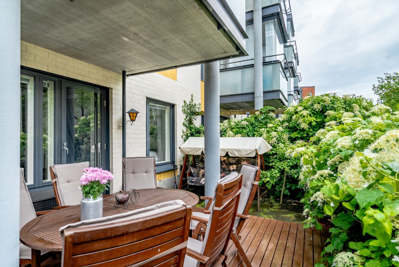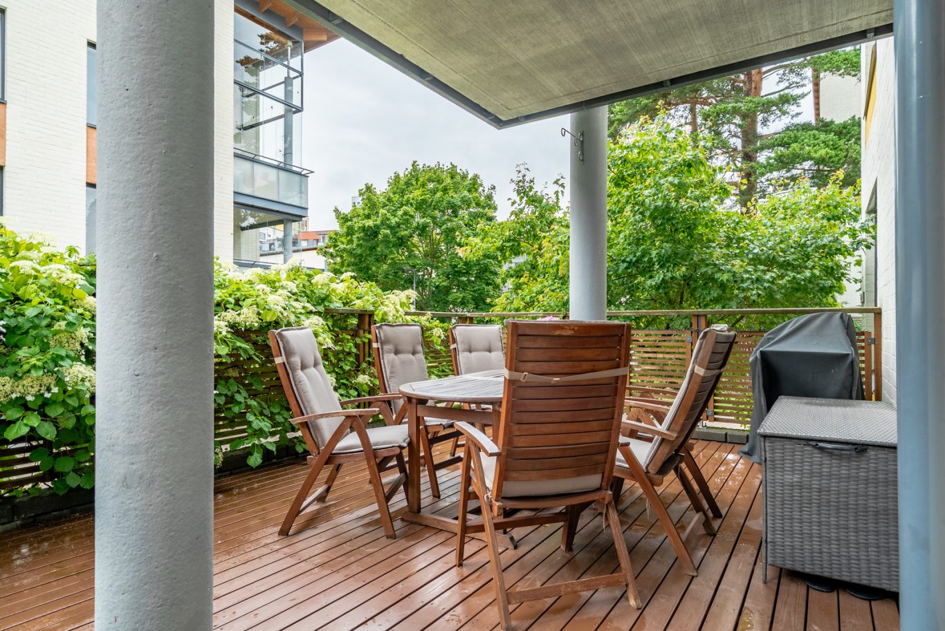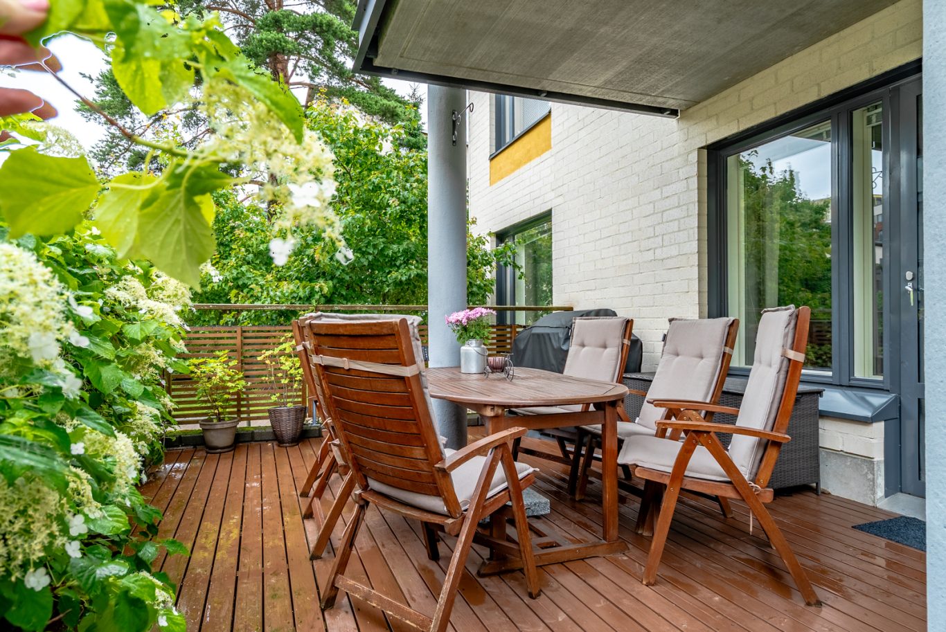 Tilavan olohuoneen ja tilavan keittiön erottaa seinä, mutta tilat yhdistyvät toisiinsa sujuvasti. Olohuoneesta on käynti asunnon jättikokoiselle terassille, jossa voi nauttia päiväunista omassa pihakeinussa. Terassi luo asuntoon kokonaisen lisäosan, ja siellä on tilaa koko perheelle tai ystäville.