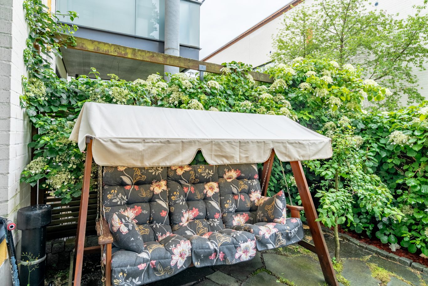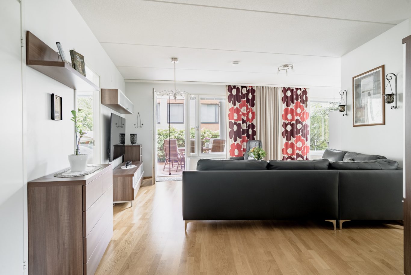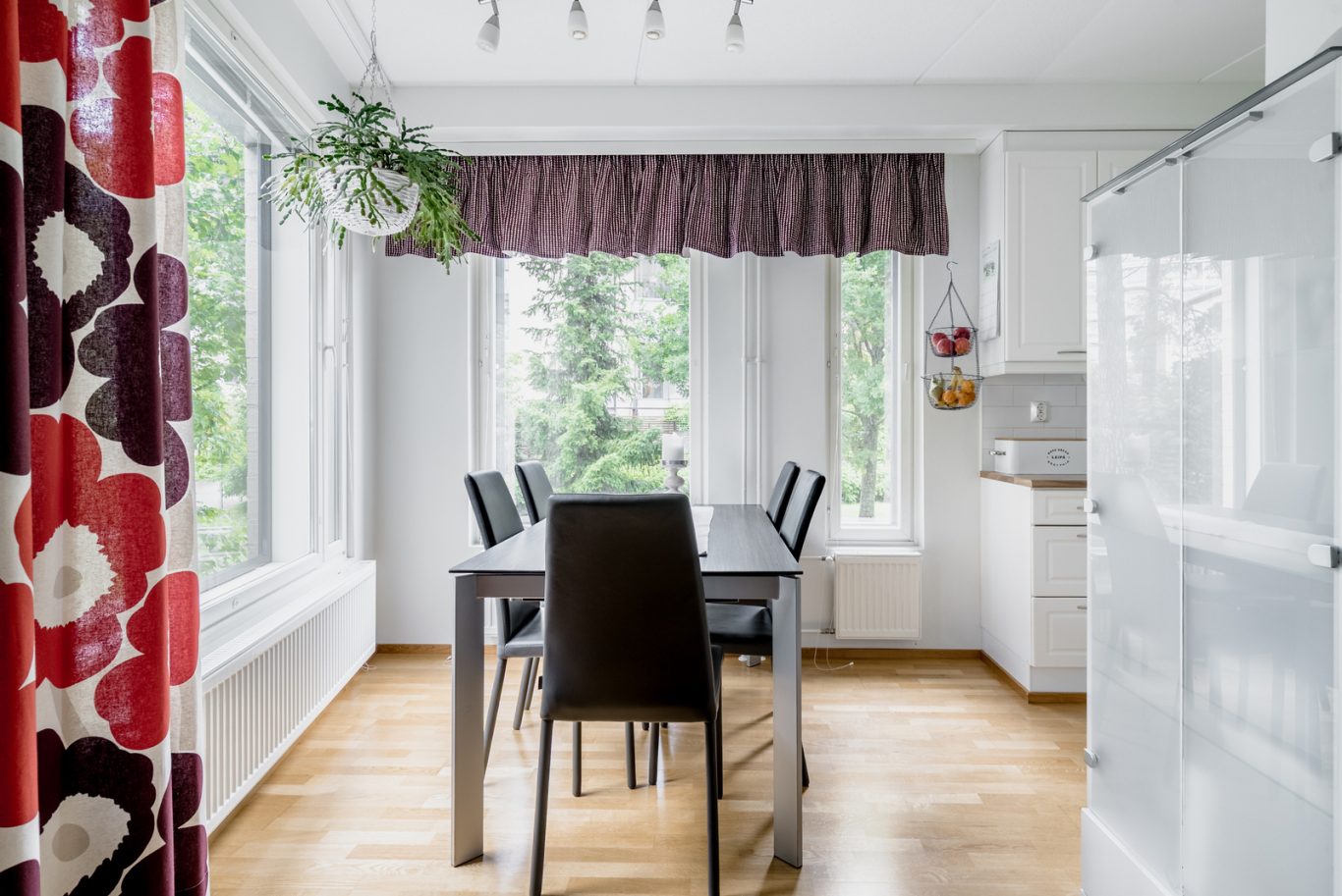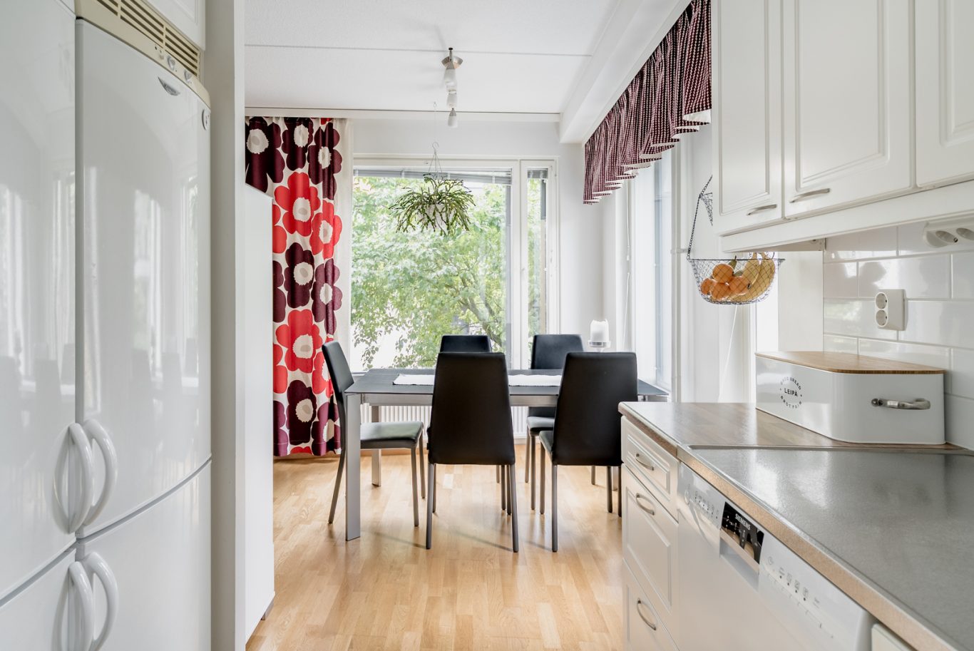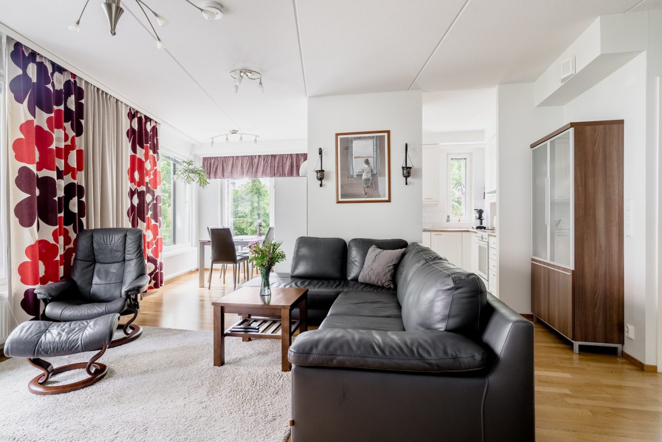 Tilavan olohuoneen ja tilavan keittiön erottaa seinä, mutta tilat yhdistyvät toisiinsa sujuvasti. Olohuoneesta on käynti asunnon jättikokoiselle terassille, jossa voi nauttia päiväunista omassa pihakeinussa. Terassi luo asuntoon kokonaisen lisäosan, ja siellä on tilaa koko perheelle tai ystäville.