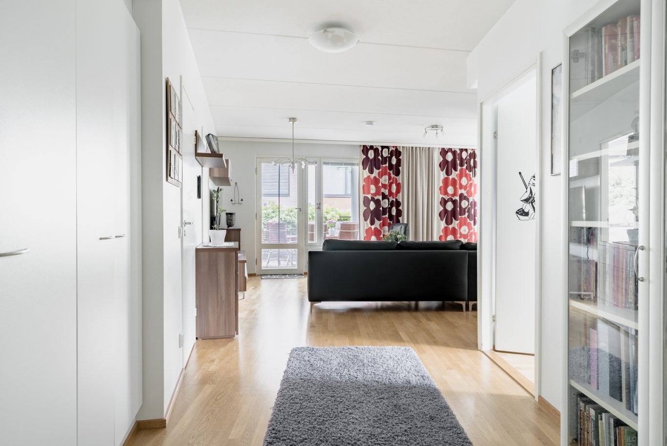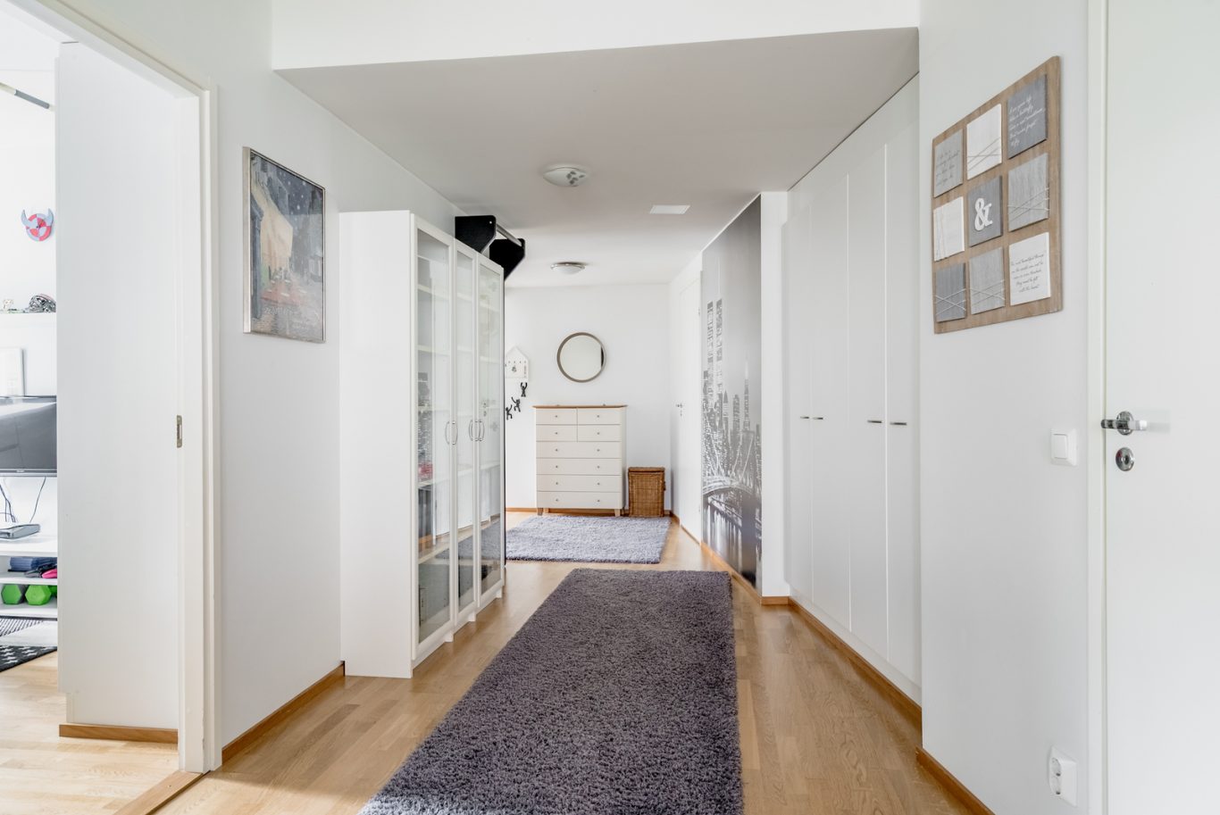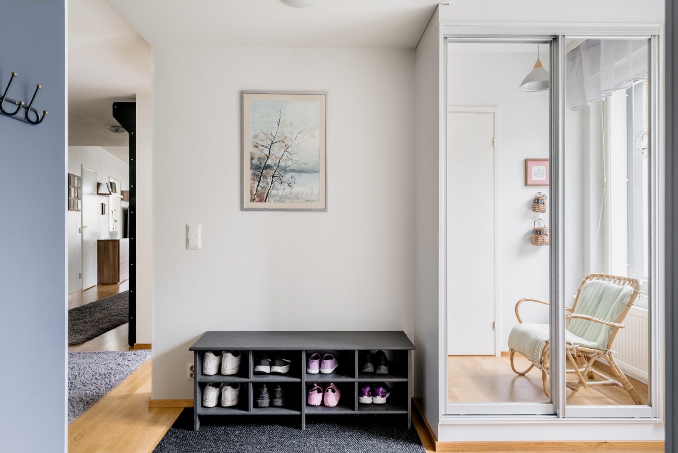 Tilavasta eteisestä avautuu ikkuna kauniille Pomeranssikujalle, ja eteisessä on myös asunnon toinen wc. Asunnon arkkitehtuuri on normaalista poikkeava, mikä tuo kodille omanlaista luonnetta. Pitkän käytävän alusta löytyy ensimmäinen makuuhuone, josta löytyy säilytystilaa.
