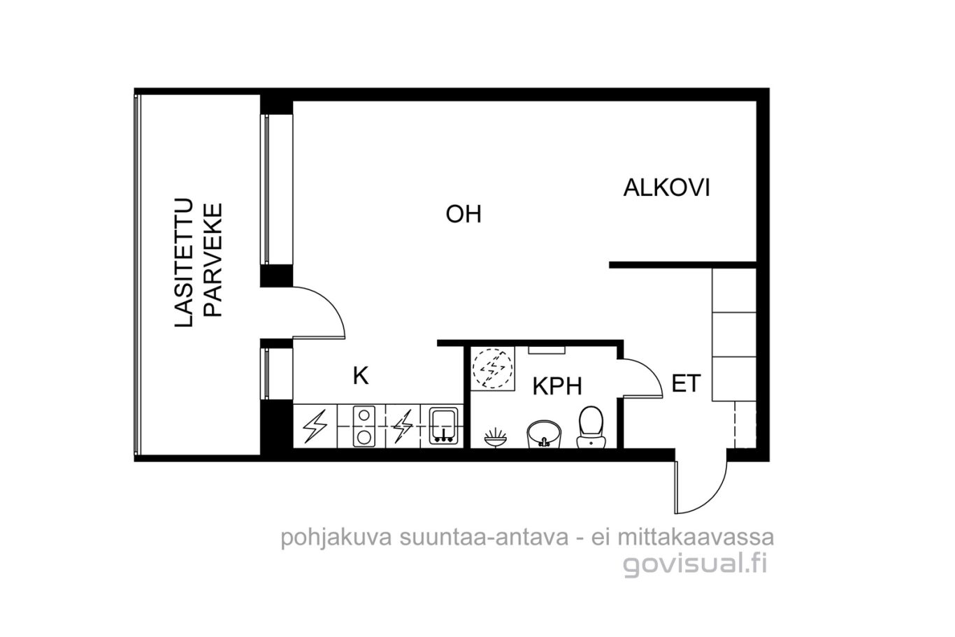 | Huoneistoselitelmä | 1h, avokeittiö, alkovi, kph,parveke |