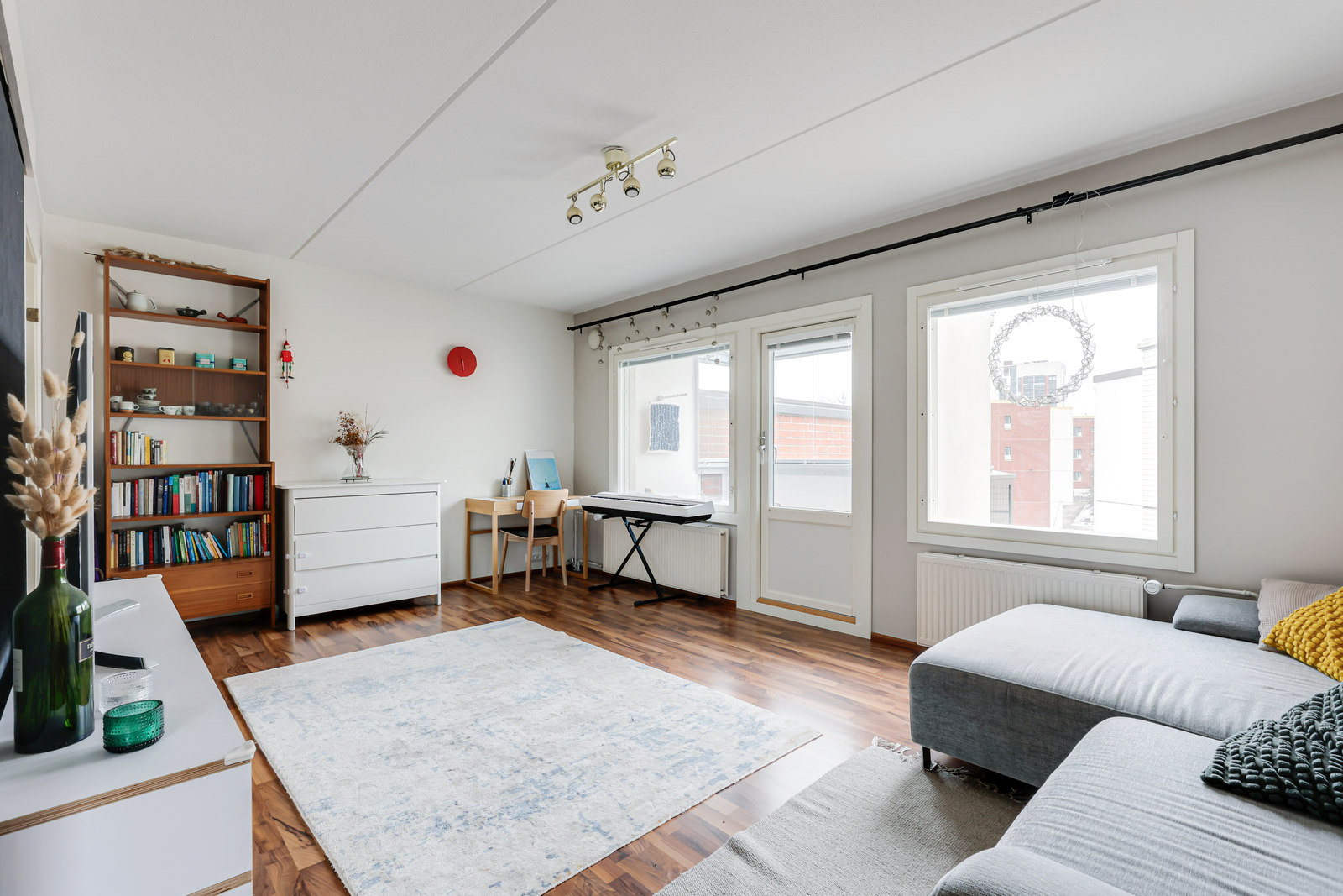 Ylimmän kerroksen kulmahuoneisto rauhallisella mutta keskeisellä sijainnilla!