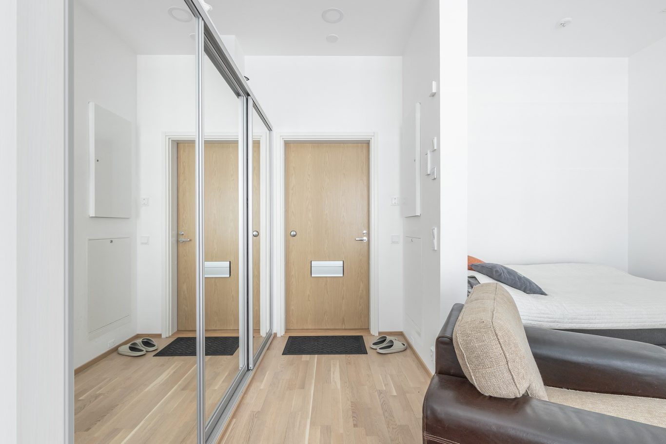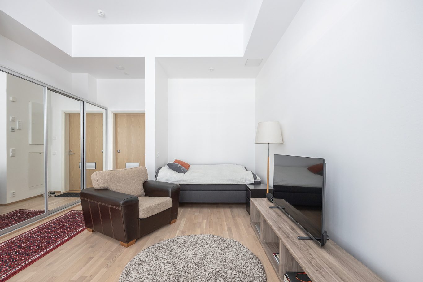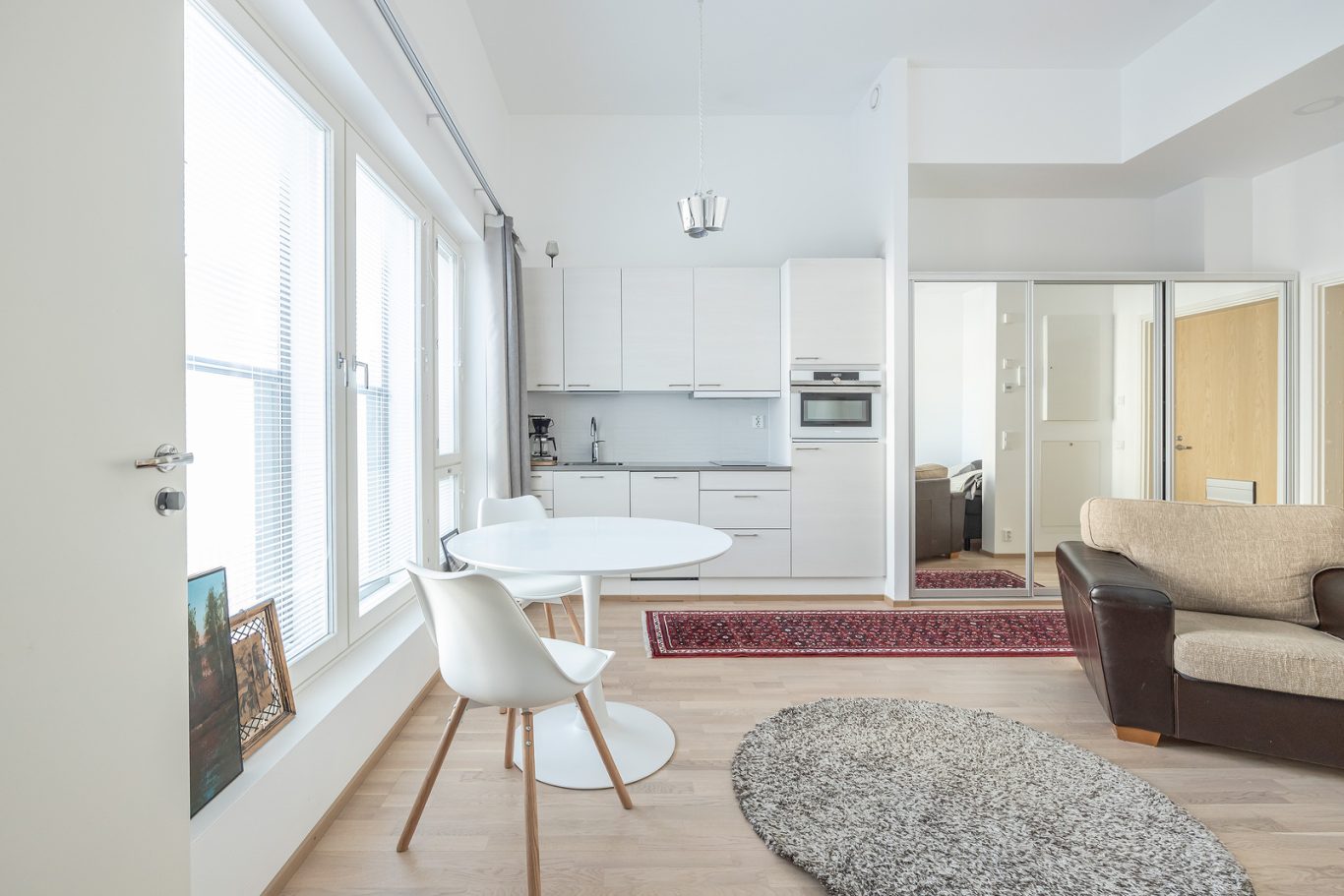 Tehokkaassa pohjaratkaisussa on korkea olohuone avokeittiöllä ja makuualkovilla. Tyylikäs keittiö modernein kodinkonein. Hyvän kokoinen kaunis kylpyhuone. Peiliovikomeroita. Olohuoneen ikkuna on avattavilla tuplalasiovilla. Vesikiertoinen lattialämmitys.