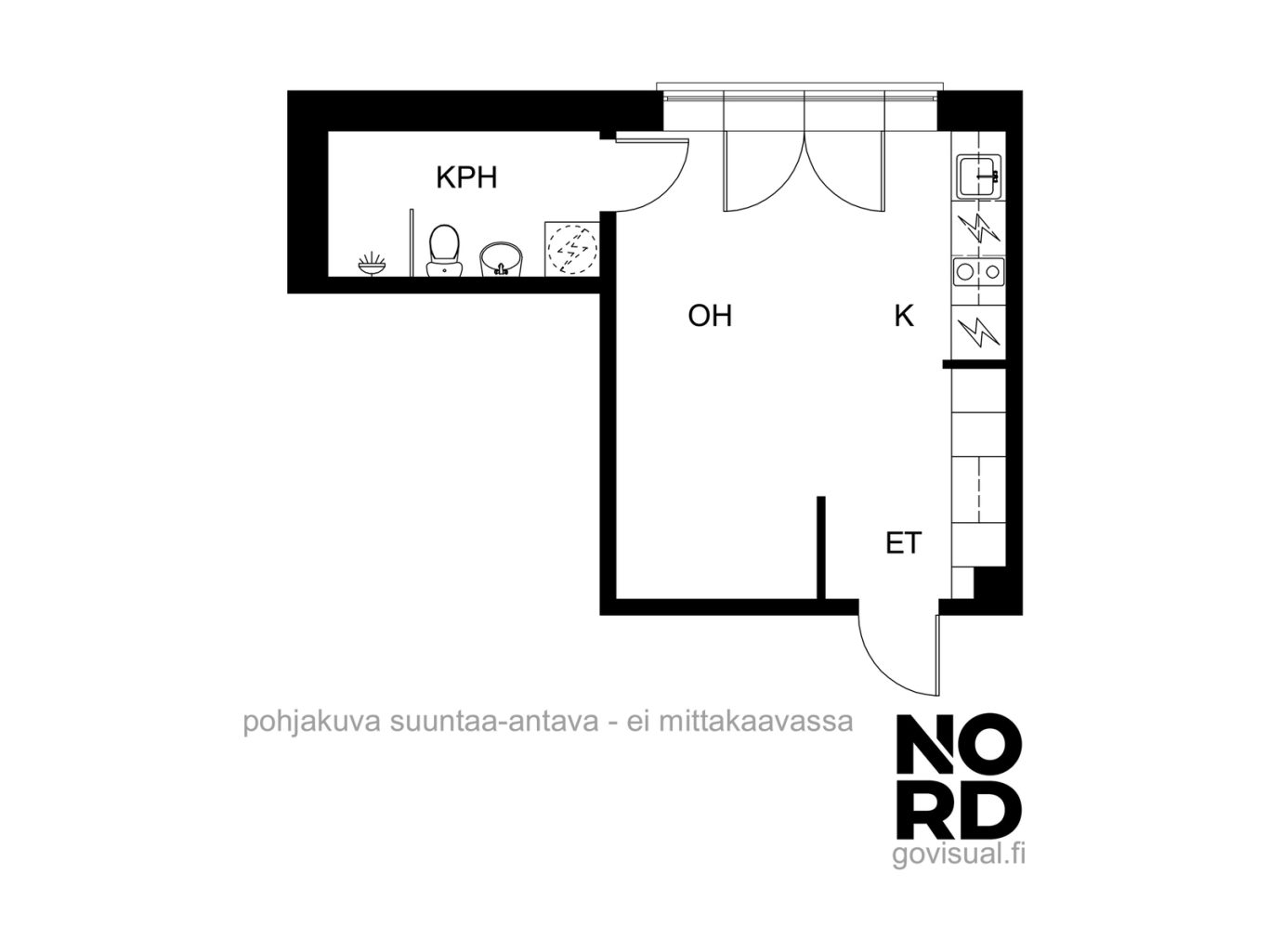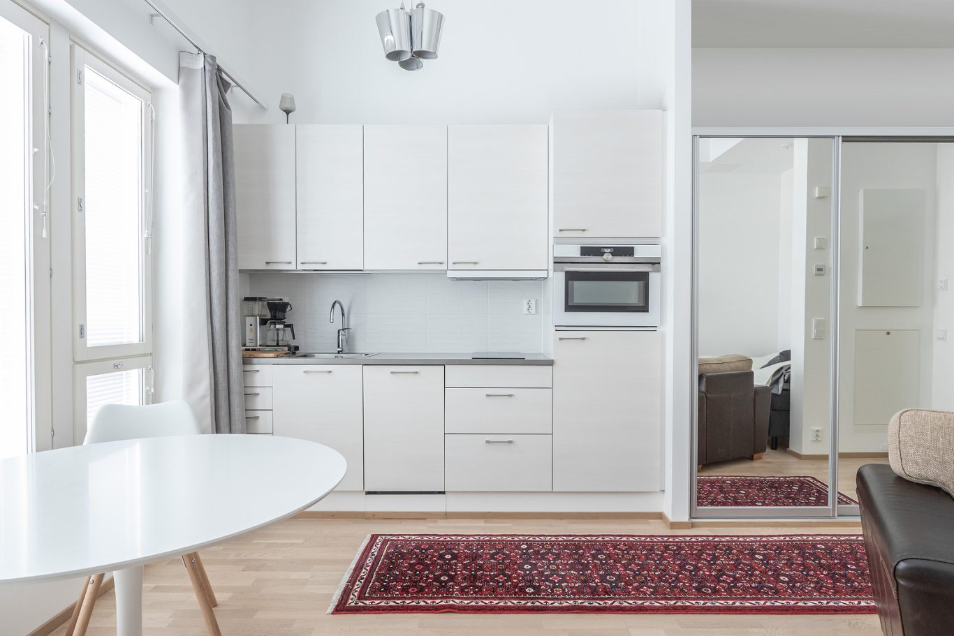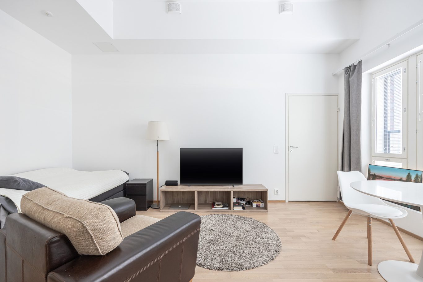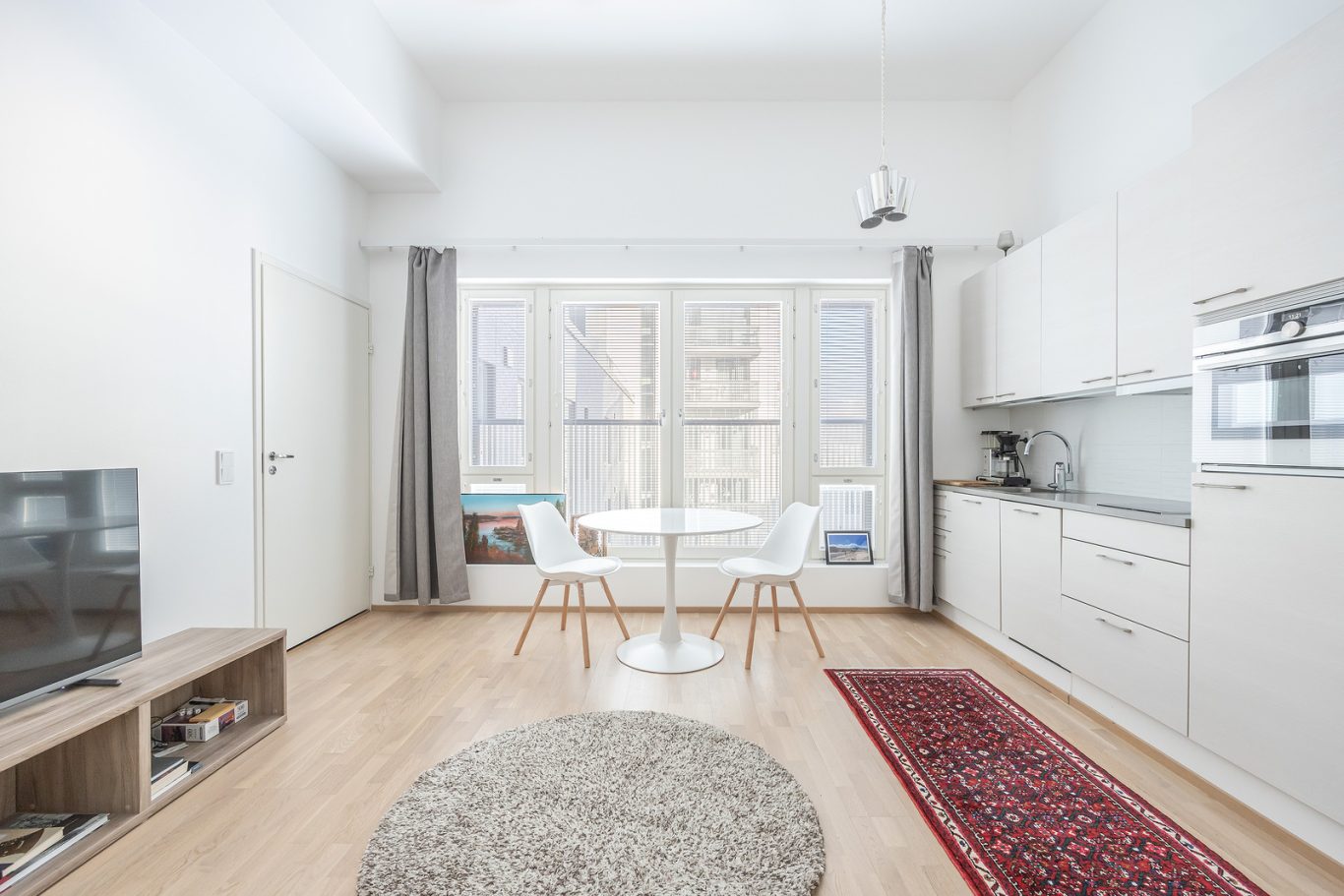 Tehokkaassa pohjaratkaisussa on korkea olohuone avokeittiöllä ja makuualkovilla. Tyylikäs keittiö modernein kodinkonein. Hyvän kokoinen kaunis kylpyhuone. Peiliovikomeroita. Olohuoneen ikkuna on avattavilla tuplalasiovilla. Vesikiertoinen lattialämmitys.
