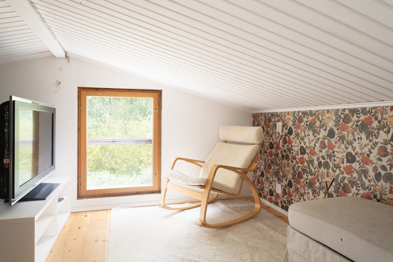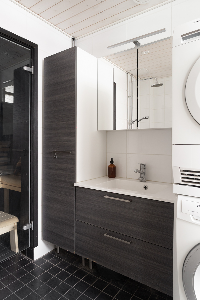 | Tilojen kuvaus | Yläkerran lattia: lauta, seinät: maalattu, katto: puupaneeli Eteinen: laattalattia, lattialämmitys (sähkö) Takkahuone: lattia: parketti, seinät: maalattu Vaatehuone: muovimatto |