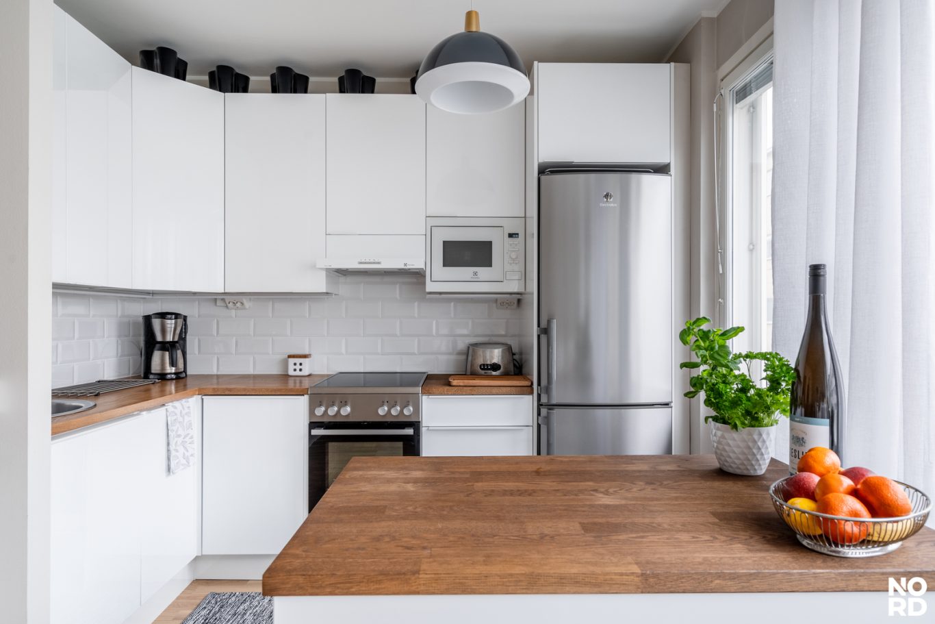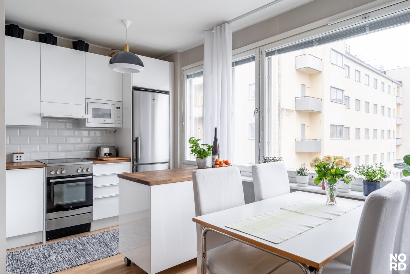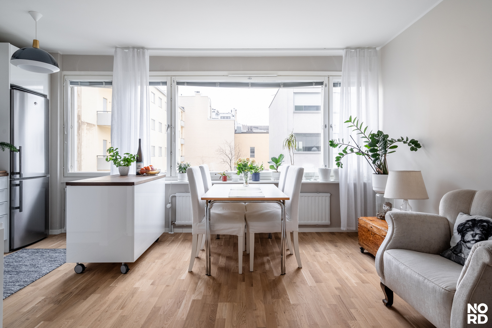 jolloin kaikki pinnatja ratkaisut on päivitetty nykyaikaisiksi. Olohuoneen suuretikkunattuovattilaan runsaasti luonnonvaloa, ja avokeittiötä rajaa käytännöllinen taso, joka tekee tilasta sekä toimivan että viihtyisän.