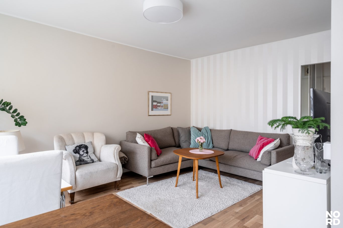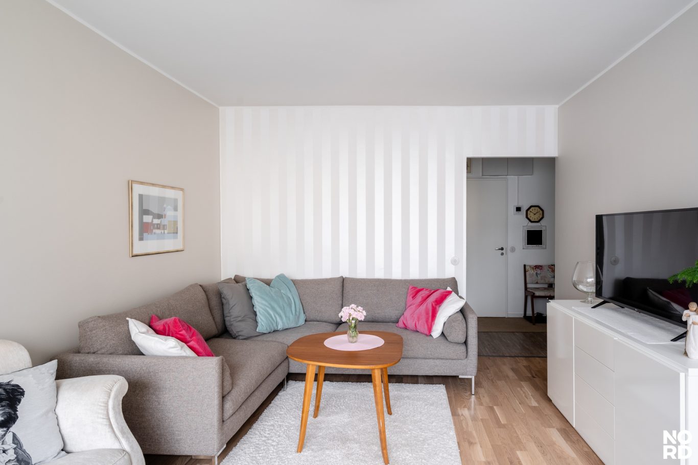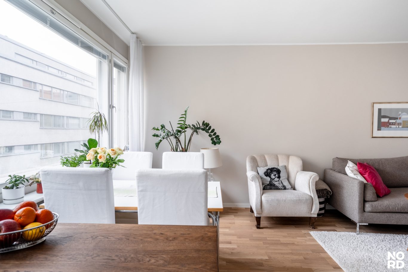 jolloin kaikki pinnatja ratkaisut on päivitetty nykyaikaisiksi. Olohuoneen suuretikkunattuovattilaan runsaasti luonnonvaloa, ja avokeittiötä rajaa käytännöllinen taso, joka tekee tilasta sekä toimivan että viihtyisän.