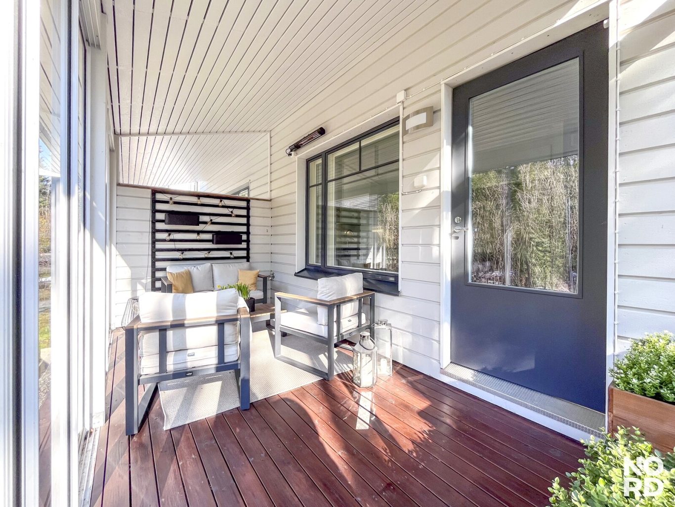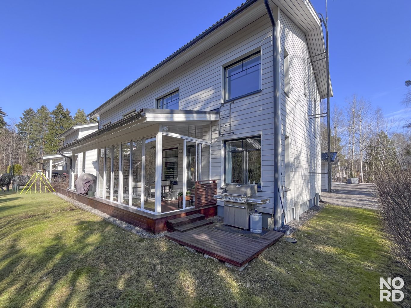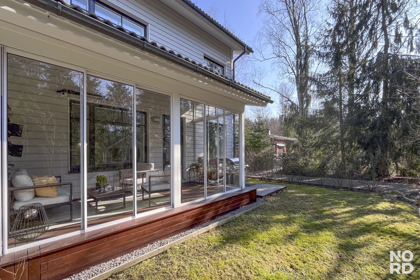 Olohuoneesta käynti lasitetulle terassille ja aurinkoiselle etelä-länsipihalle, jossa nautit grillaamisesta ja mukavasta yhdessäolosta, aurinko paistaa aamusta iltaan omalle pihalle.