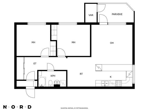 Huoneistossa on toimiva pohjaratkaisu. Keittiössä runsaasti kaappeja ja tilaa ruokaryhmälle. Olohuoneesta käynti parvekkeelle. Makuuhuoneet ovat hyvin kokoisia.