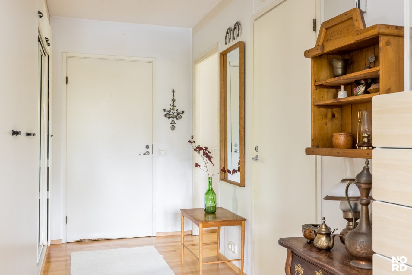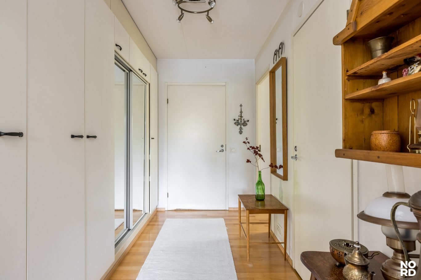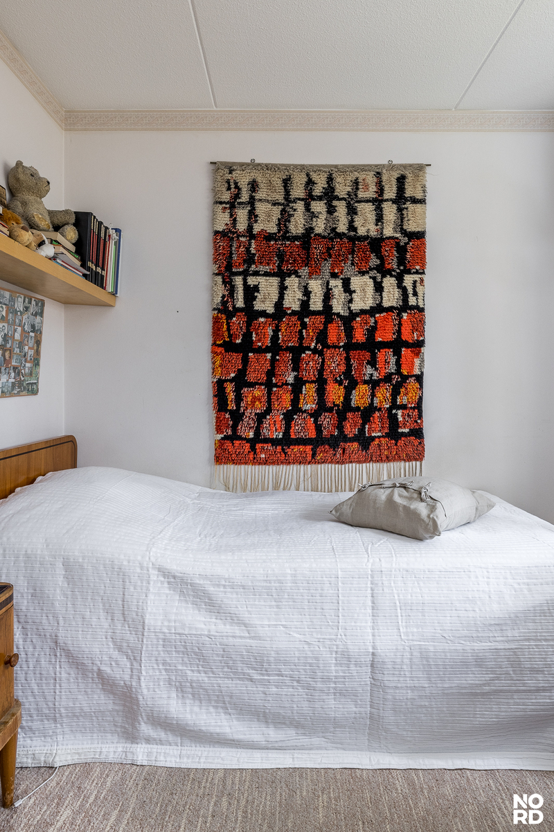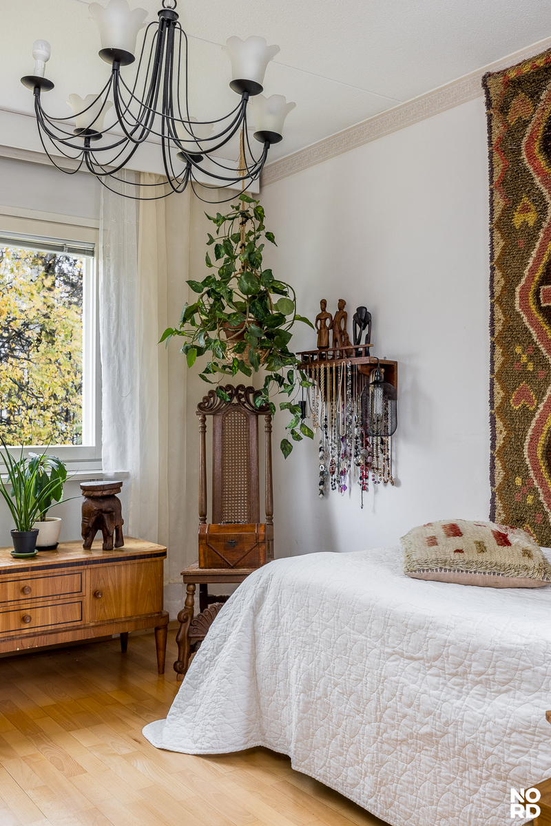 Tilavia makuuhuoneita on kaksi ja molemmista on vehreä näkymä lähimetsään. Ensimmäisessä makuuhuoneessa on koko seinän levyinen kaapisto. Päätymaakuuhuoneessa on peräti kaksi ikkunaa vastakkaisilla seinillä, joten se on helppo tuulettaa helteelläkin! Tämä koti sopii hyvin myös kimppa-asumiseen tai kahden sukupolven käyttöön, sillä makuuhuoneet ovat erillään toisistaan ja muut kodin toiminnot ovat tasapuolisesti molempien saatavilla. Eteinen on avara ja leveän liukuovikaapiston ansiosta omaa hyvät säilytystilat.