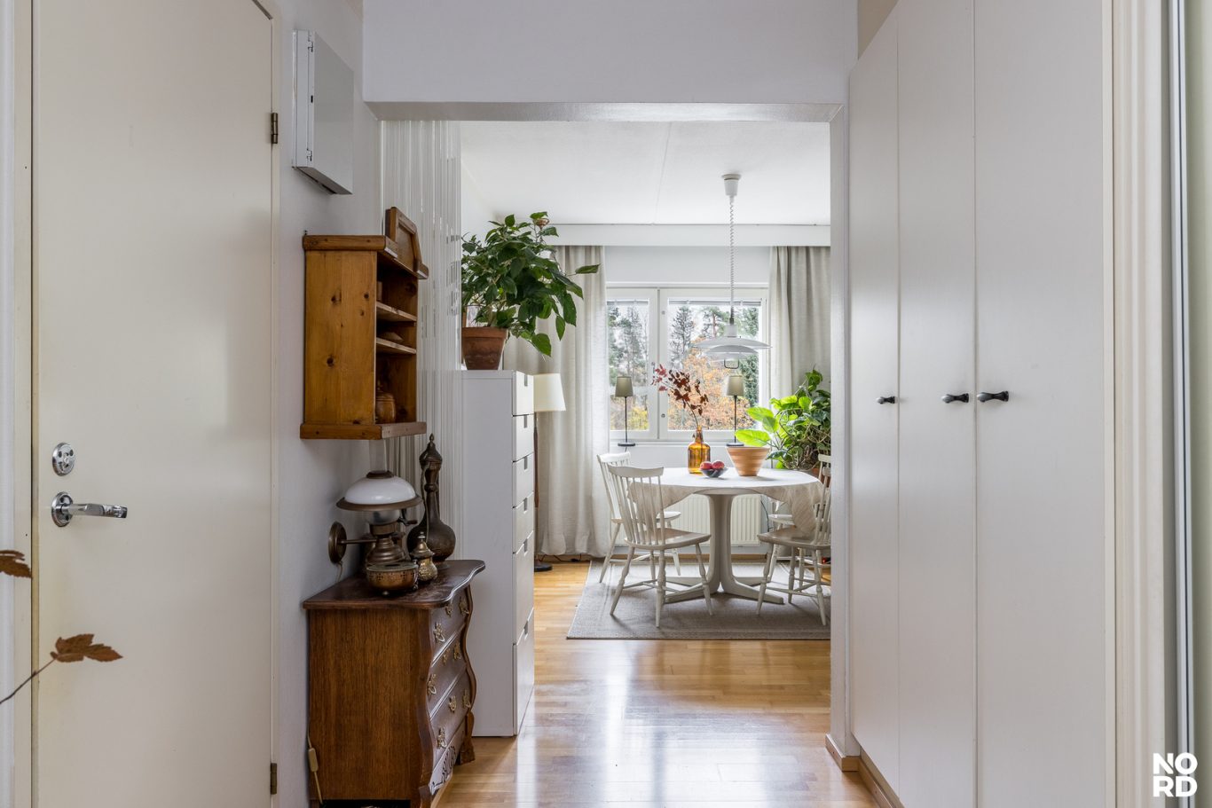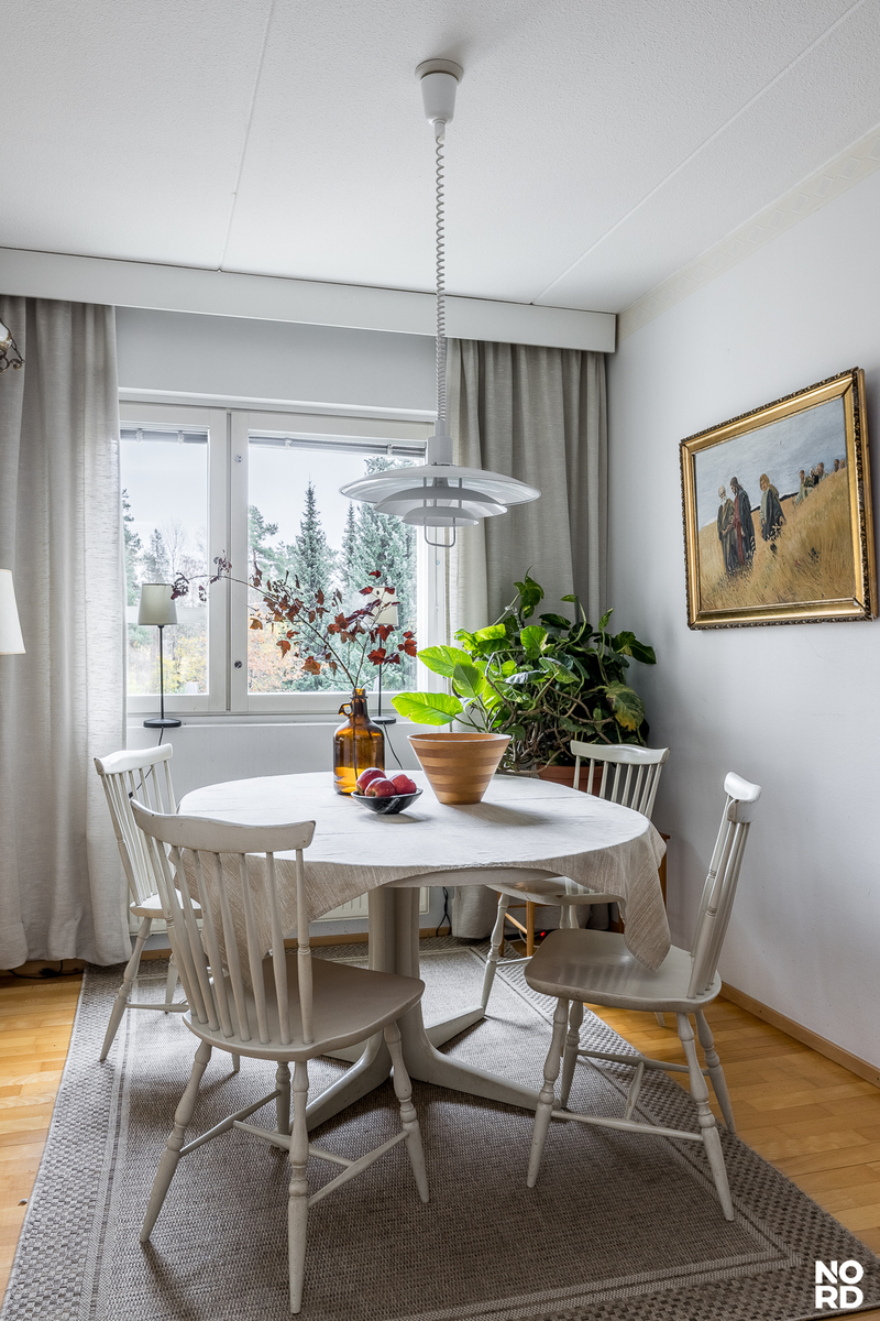 Kodin sydän on keittiön ja olohuoneen välissä oleva valoisa ruokailutila, johon mahtuu pöydän ympärille koolle isokin seurue. Olohuone on todella tilava ja siinäkin on päätysijainnin ansiosta ikkuna kahteen suuntaan, sekä olohuoneen jatkeena eteläparveke. Vaalea keittiö on erillinen, joten kotityöt pysyvät vapaa-ajalla poissa silmistä. Keittiössä on hyvin sekä säilytys, että laskutilaa. Kylpyhuone on myös sävyiltään vaalea ja toiminnoiltaan selkeä, suihkua varten on suihkukaappi, joten koko huone ei samalla kastu!