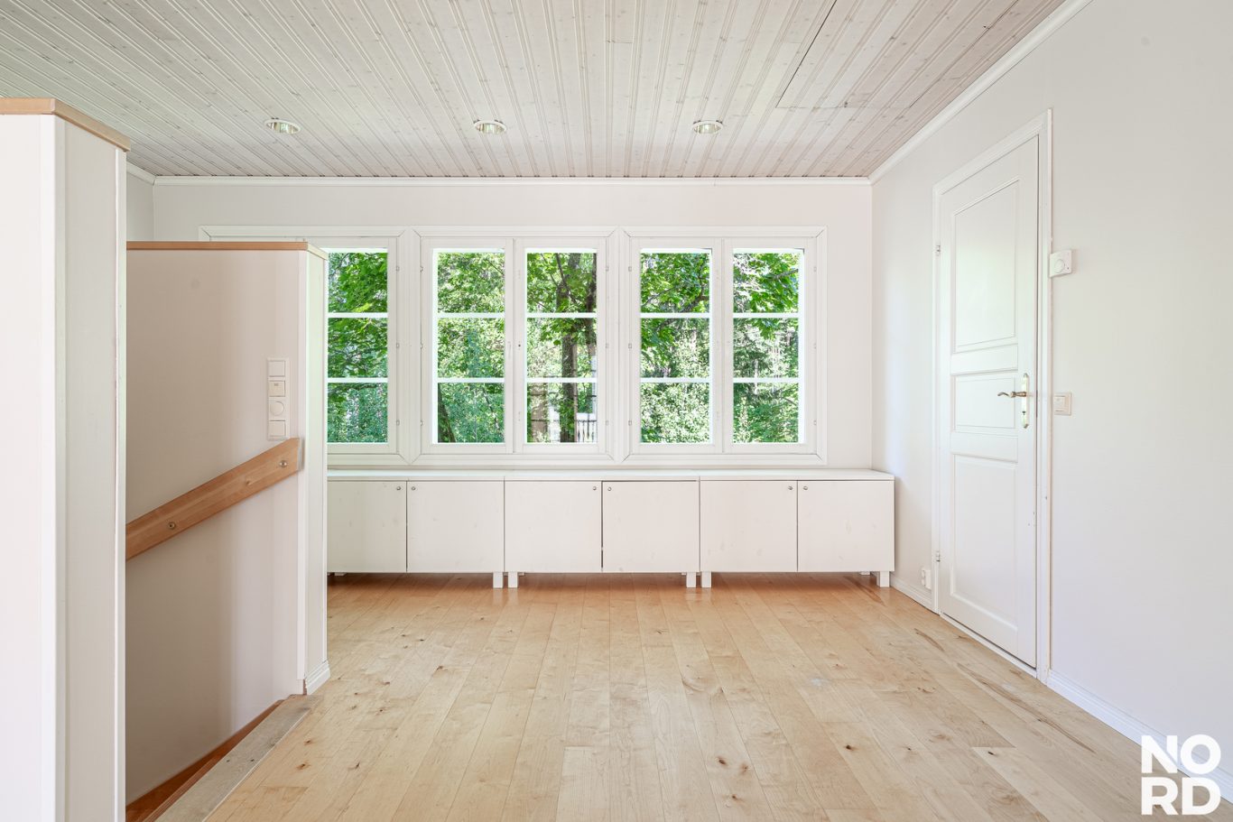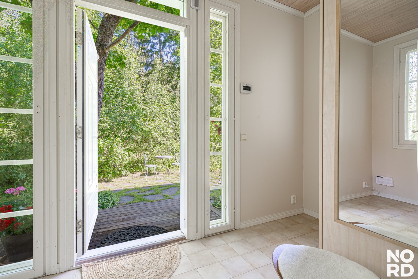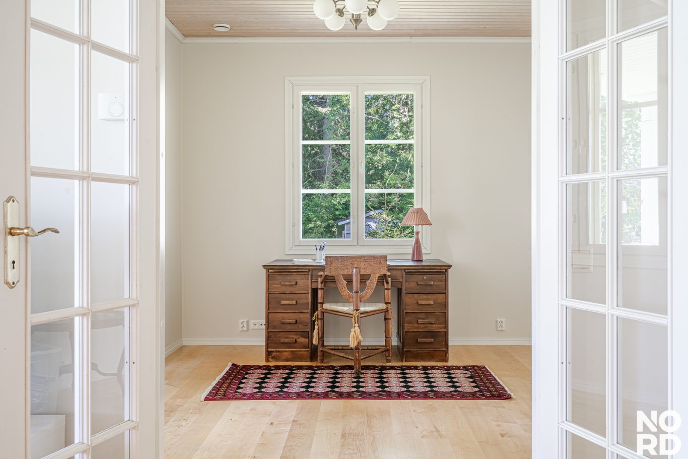 Olohuoneen keskiössä on tyylikäs varaava takka. Olohuoneesta on käynti kirjastohuoneeseen, joka on mitoiltaan reilun kokoinen makuuhuone. Ruokailutilaan mahtuu ruokailuryhmä isojakin perhejuhlia varten. Keittiössä on tilaa niin kokkailulle, arkiruokailuille kuin säilytyksellekin ilman ahtauden tunnetta. Sisäänkäyntikerroksessa on lisäksi hyvin vaatteiden säilytystilaa, erinomainen kodinhoitohuone kurasuihkulla ja uloskäynnillä sekä taidokkaalla tyylillä ja ammattilaisten toimesta 2025 remontoitu sauna- ja pesuhuone, joiden materiaalivalinnat ovat laadukkaita ja työn jälki eksaktia.