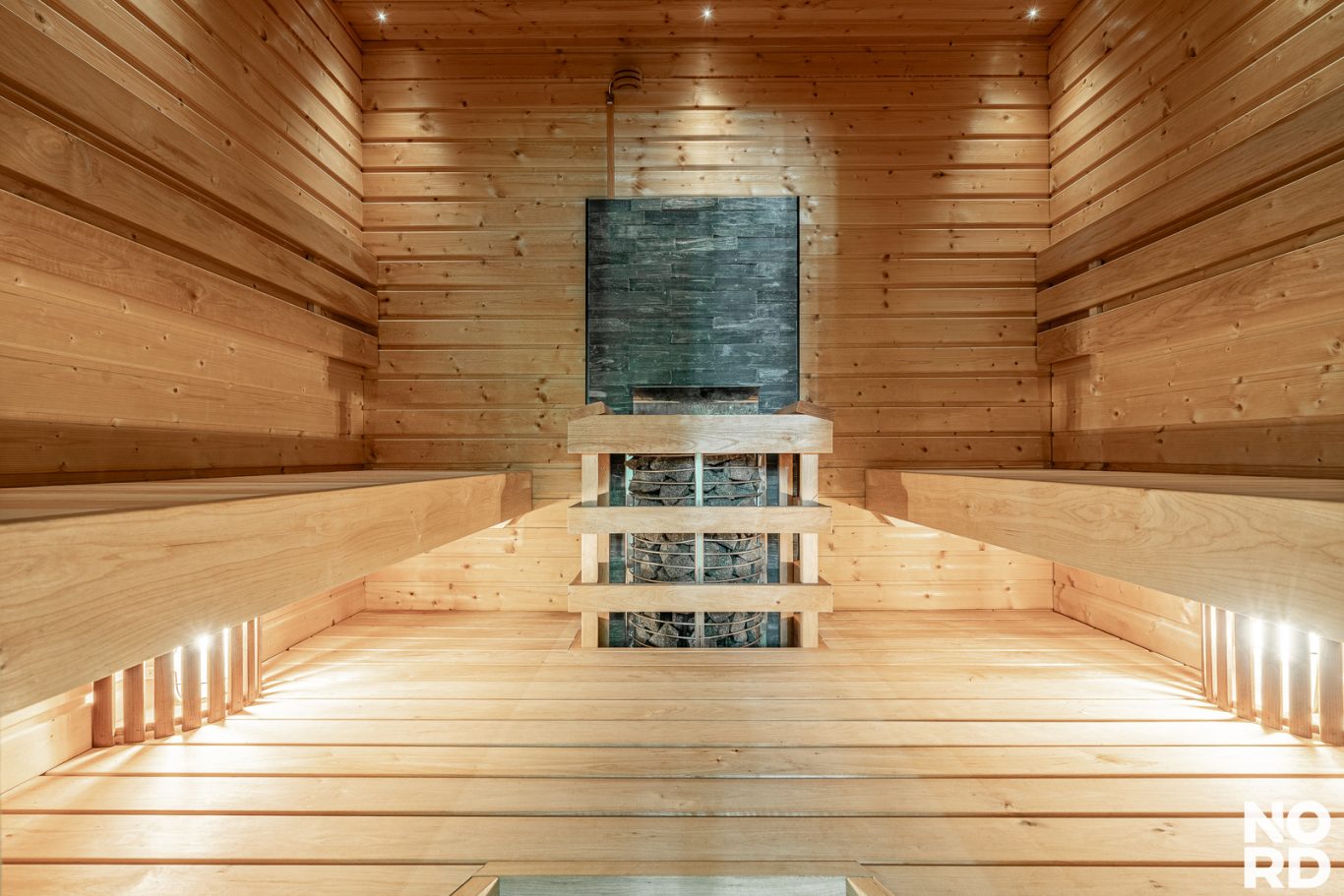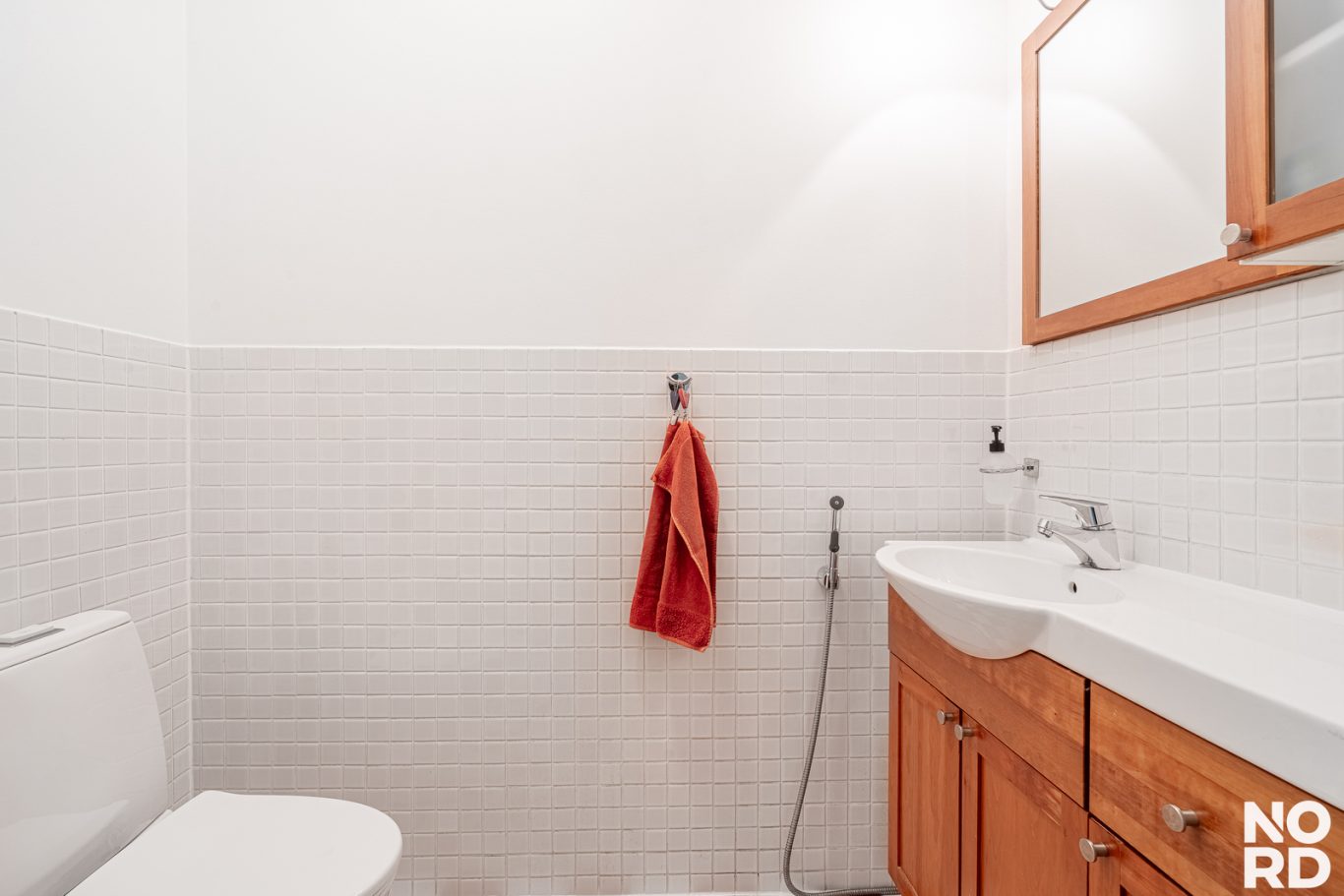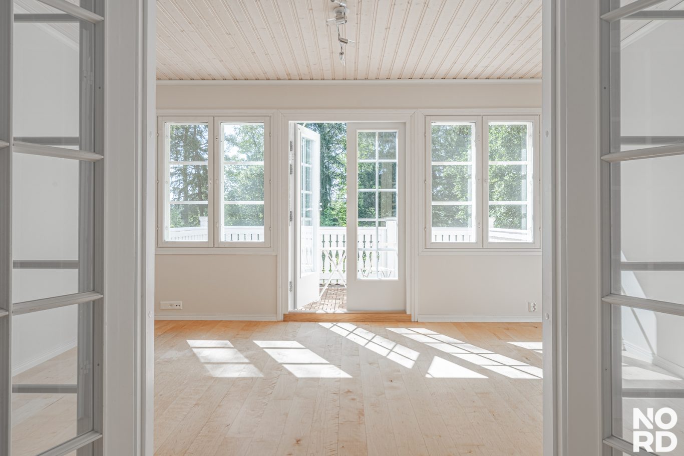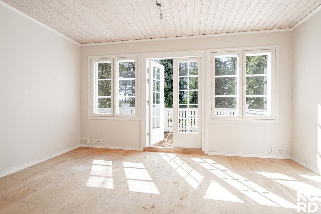Olohuoneen keskiössä on tyylikäs varaava takka. Olohuoneesta on käynti kirjastohuoneeseen, joka on mitoiltaan reilun kokoinen makuuhuone. Ruokailutilaan mahtuu ruokailuryhmä isojakin perhejuhlia varten. Keittiössä on tilaa niin kokkailulle, arkiruokailuille kuin säilytyksellekin ilman ahtauden tunnetta. Sisäänkäyntikerroksessa on lisäksi hyvin vaatteiden säilytystilaa, erinomainen kodinhoitohuone kurasuihkulla ja uloskäynnillä sekä taidokkaalla tyylillä ja ammattilaisten toimesta 2025 remontoitu sauna- ja pesuhuone, joiden materiaalivalinnat ovat laadukkaita ja työn jälki eksaktia.