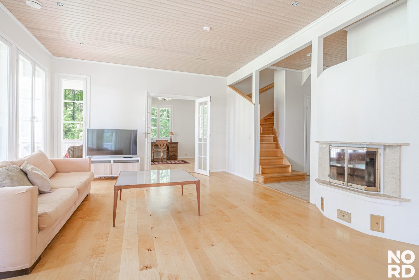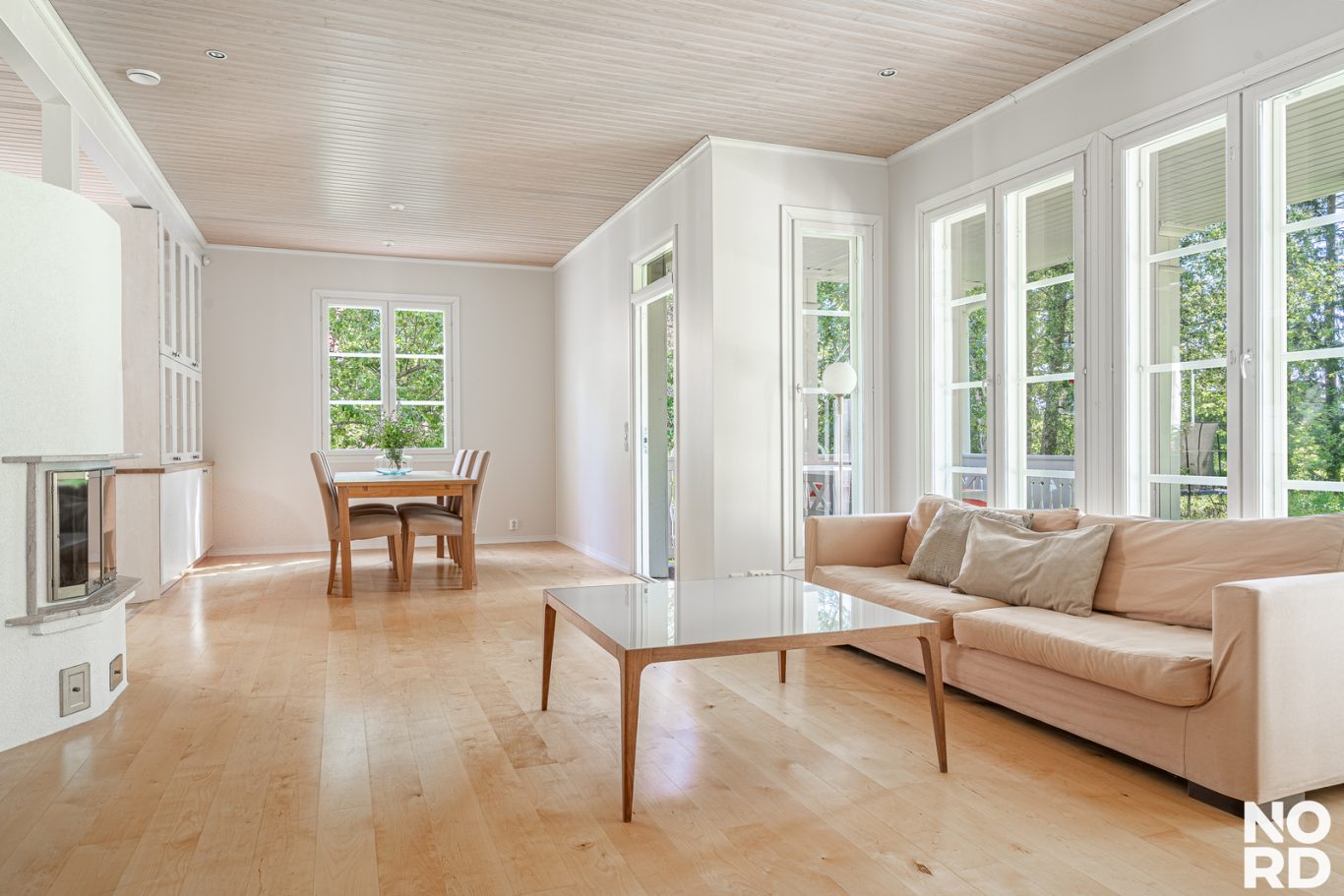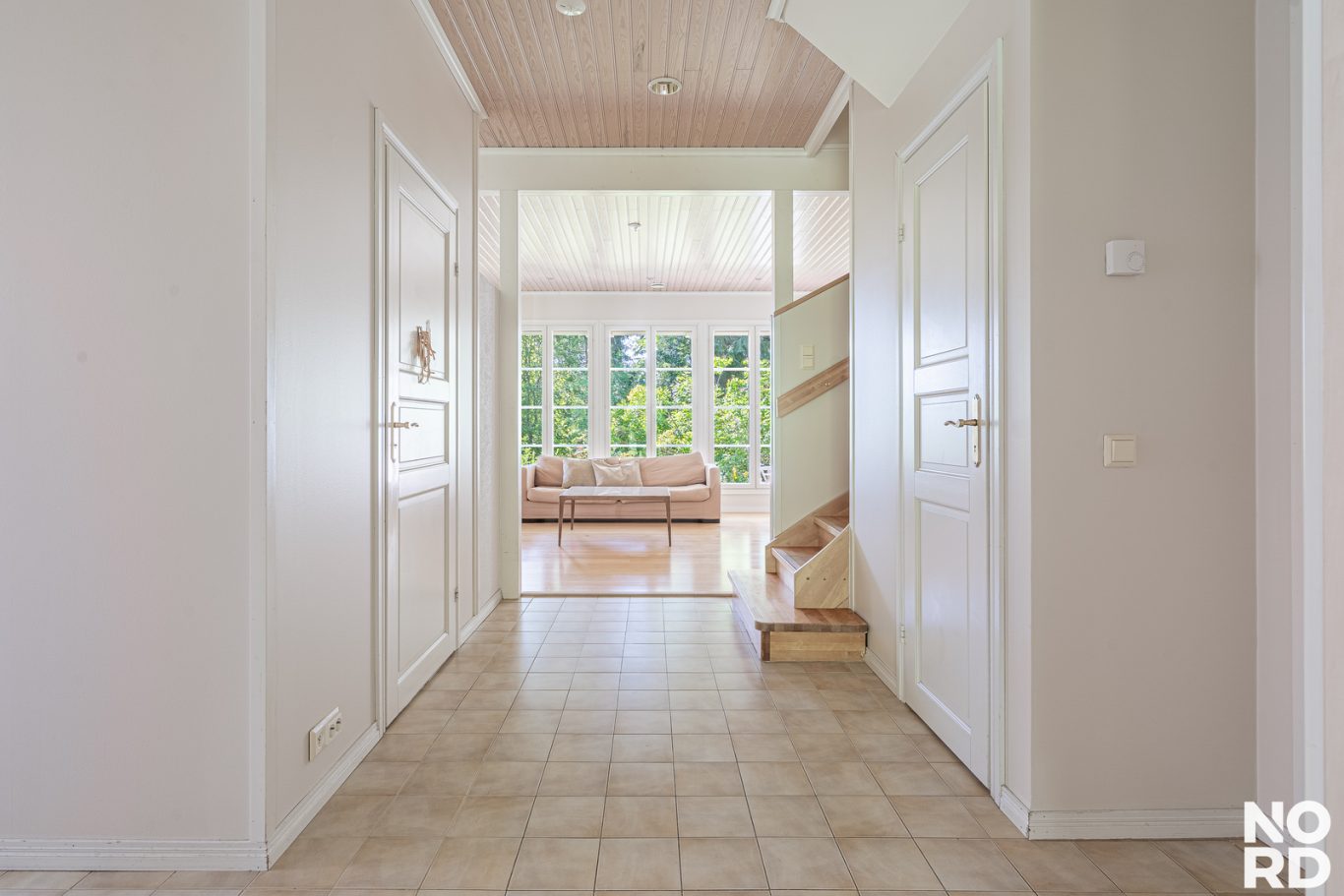 Talo on rakennettu ison aktiivisen perheen käytännön tarpeisiin tyylistä tinkimättä. Olohuone-ruokailutila-keittiö on yhtenäistä tilaa, jossa on paljon ikkunoita kauniilla vihernäkymillä puutarhaan. Tila on luonnonvalon valaisema ympärivuotisesti.