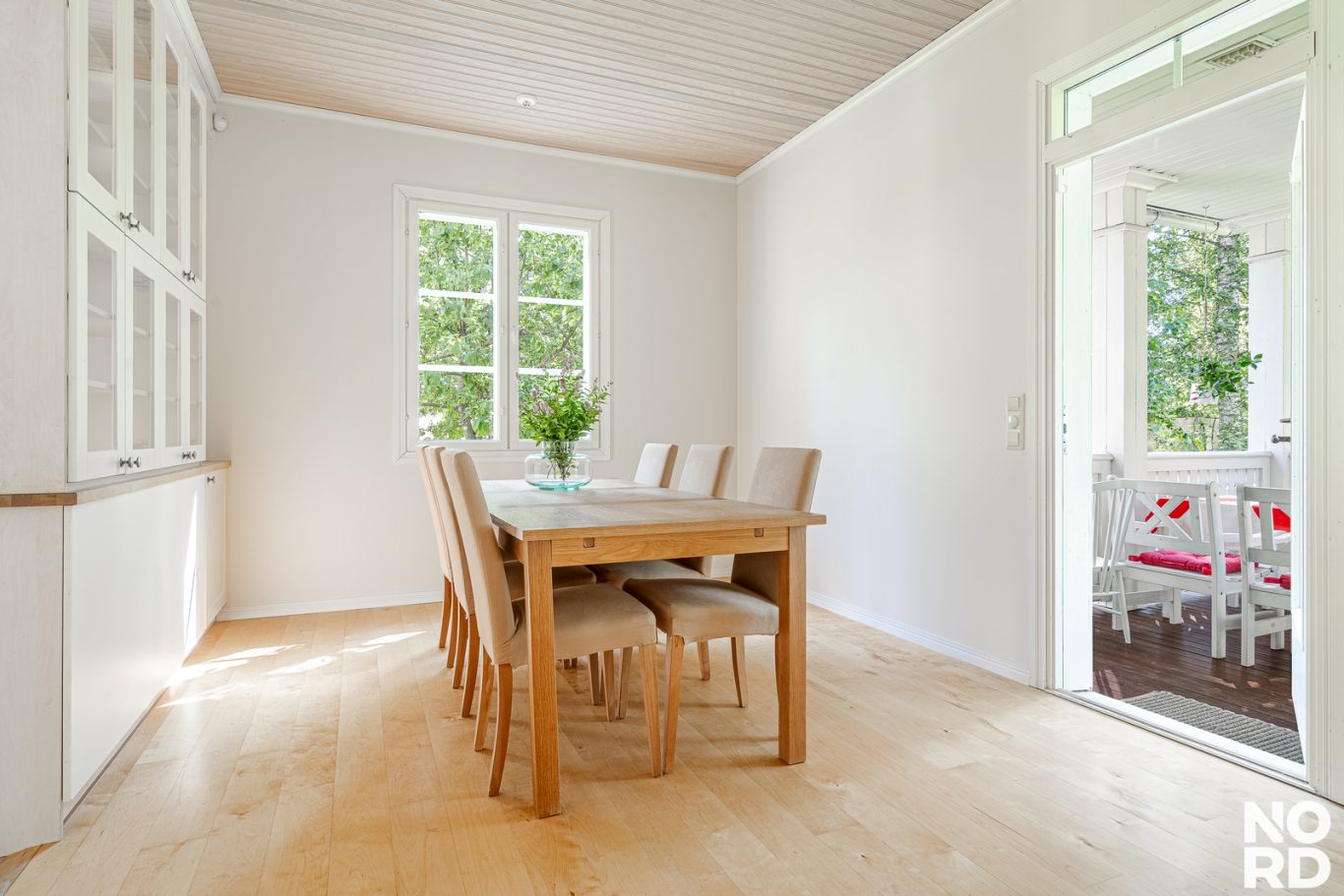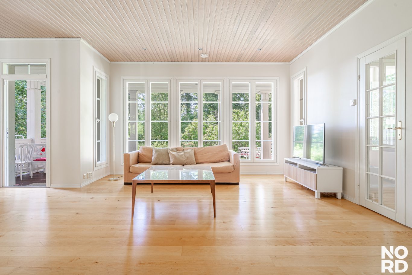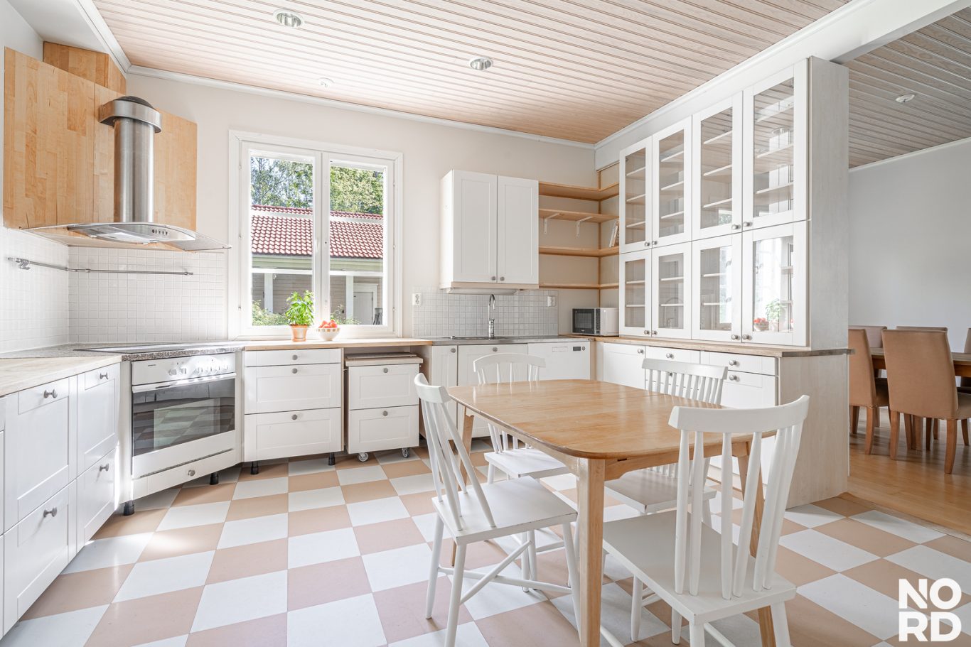 Talo on rakennettu ison aktiivisen perheen käytännön tarpeisiin tyylistä tinkimättä. Olohuone-ruokailutila-keittiö on yhtenäistä tilaa, jossa on paljon ikkunoita kauniilla vihernäkymillä puutarhaan. Tila on luonnonvalon valaisema ympärivuotisesti.
