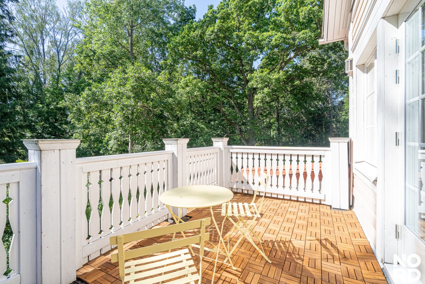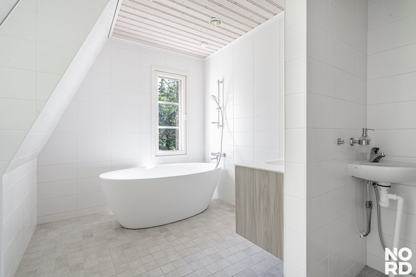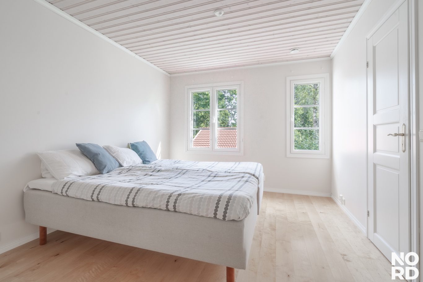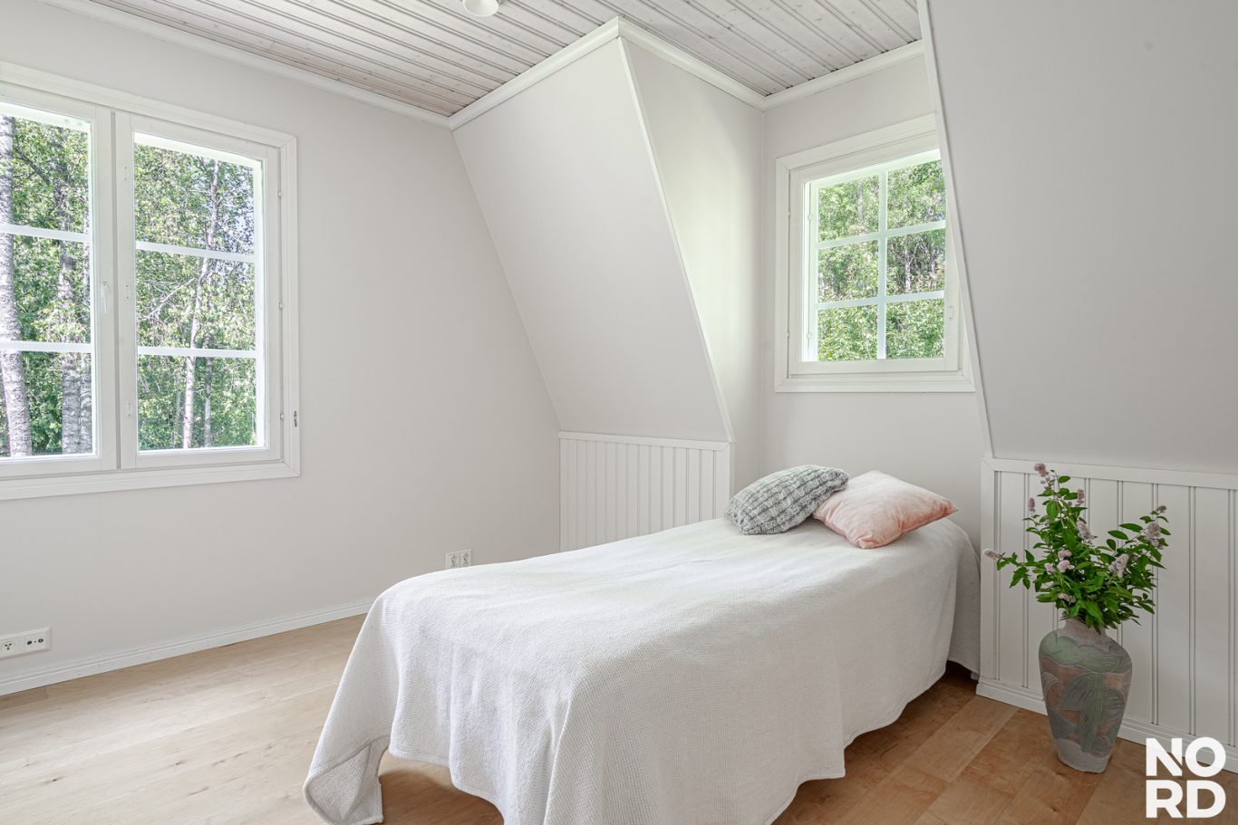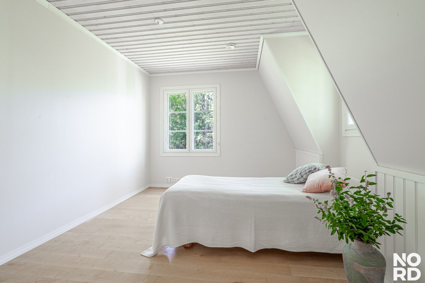 Yläkerrassa on kolme tilavaa makuuhuonetta sekä parvekkeellinen ja ateljeemainen työhuone, joka voi olla myös makuuhuone. Oleskeluaulaan mahtuu hyvin sohvakalusto. Spa-henkisessä kylpyhuoneessa on kylpyamme ja wc-tila. Yläkerrassa on myös vaatesäilytystilaa.