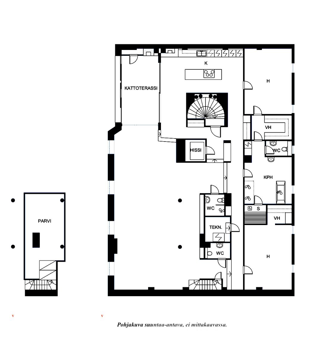 | Huoneistoselitelmä | 3h+k+2kph+2wc+s+khh+parvi+terassi |