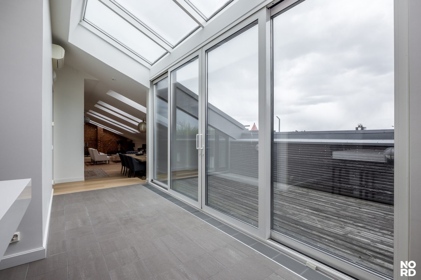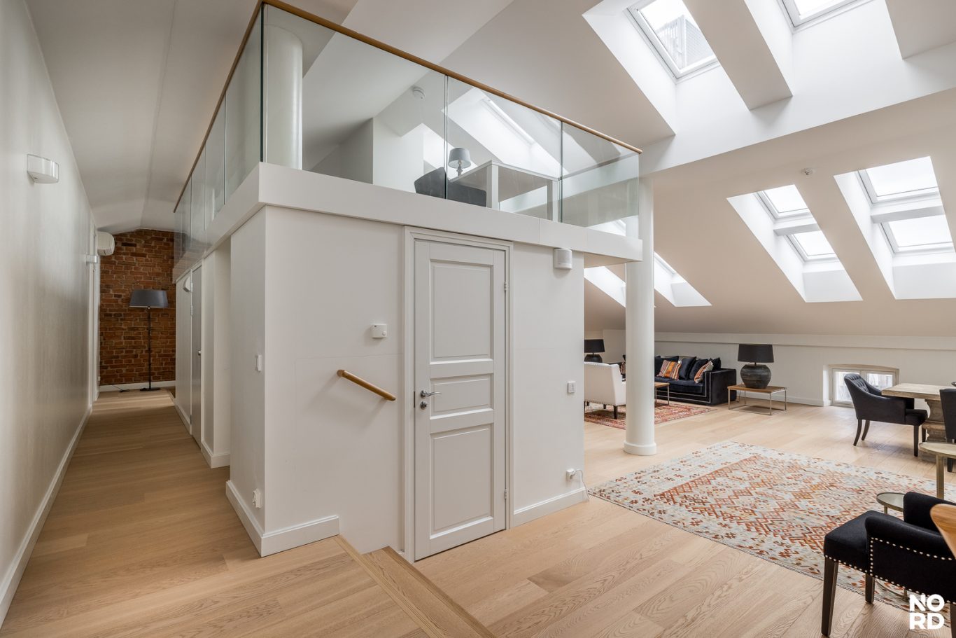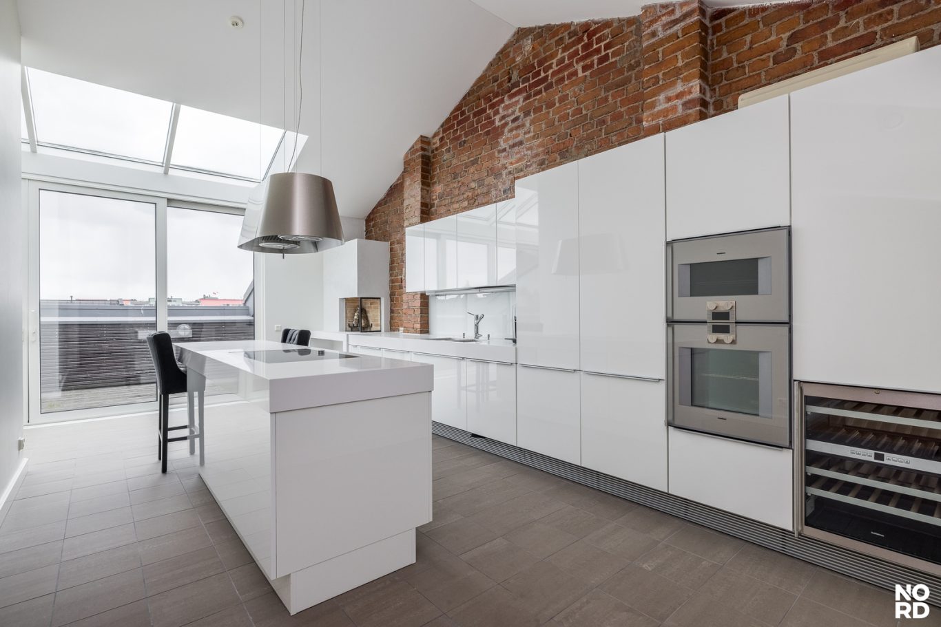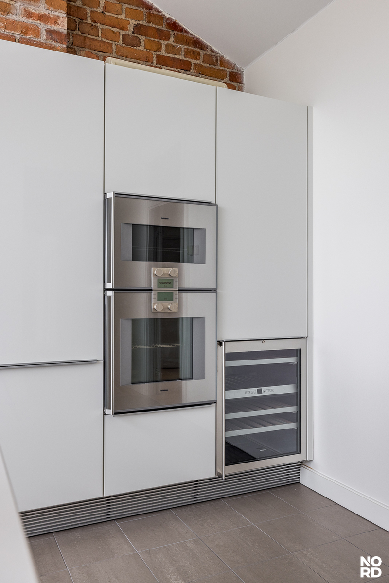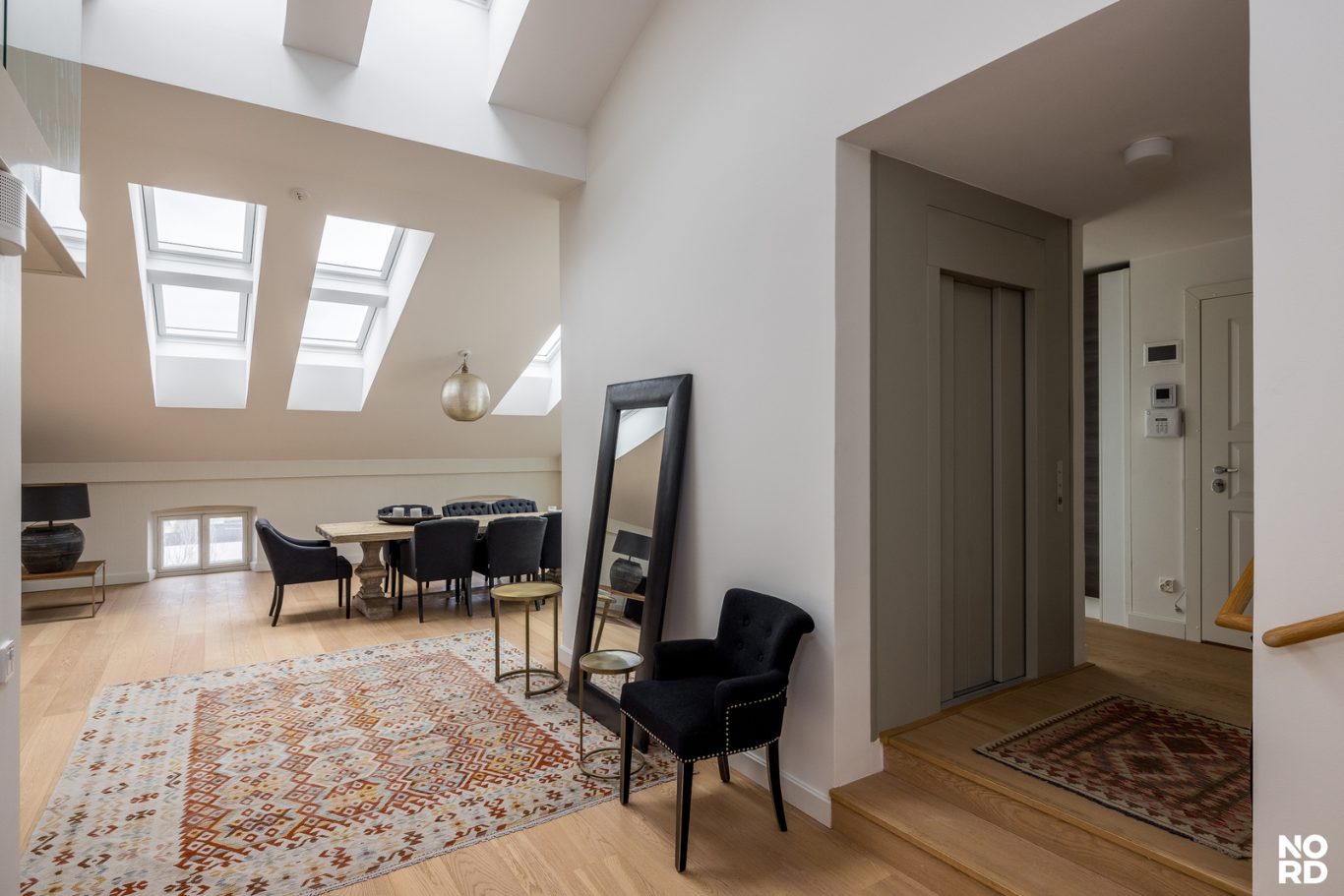 Hissillä pääsee suoraan huoneistoon omalla avaimella, mikä takaa yksityisyyden ja turvallisuuden. Sisään astuttaessa avautuu vaikuttava, avara olohuone, jossa yhdistyvät oleskelu- ja ruokailutilat saumattomasti. Tilasta on käynti avoparvekkeelle sekä tyylikkääseen Poggenpohlin keittiöön, josta löytyvät Gaggenaun huippuluokan kodinkoneet, avotakka sekä suora käynti kesäkäyttöön suunnitellulle terassille. Terassilla on myös oma ulkotakka.