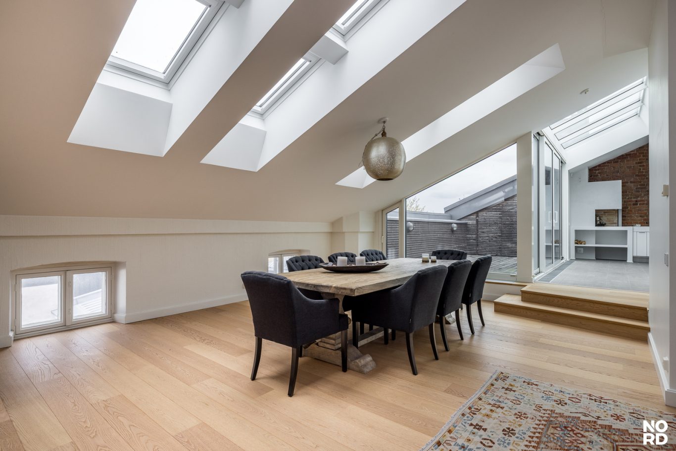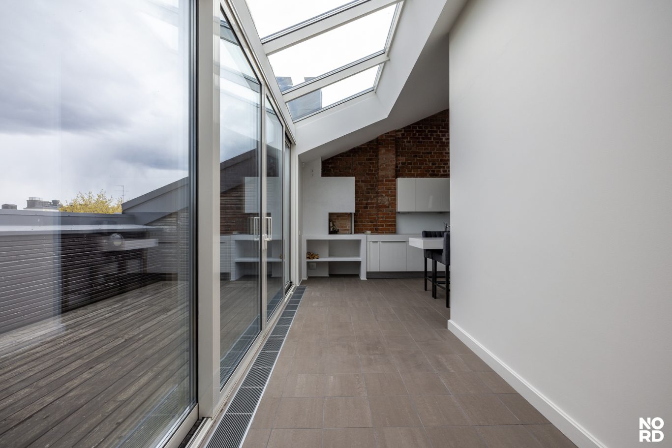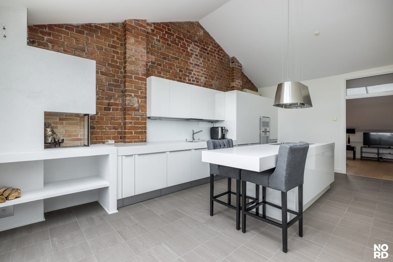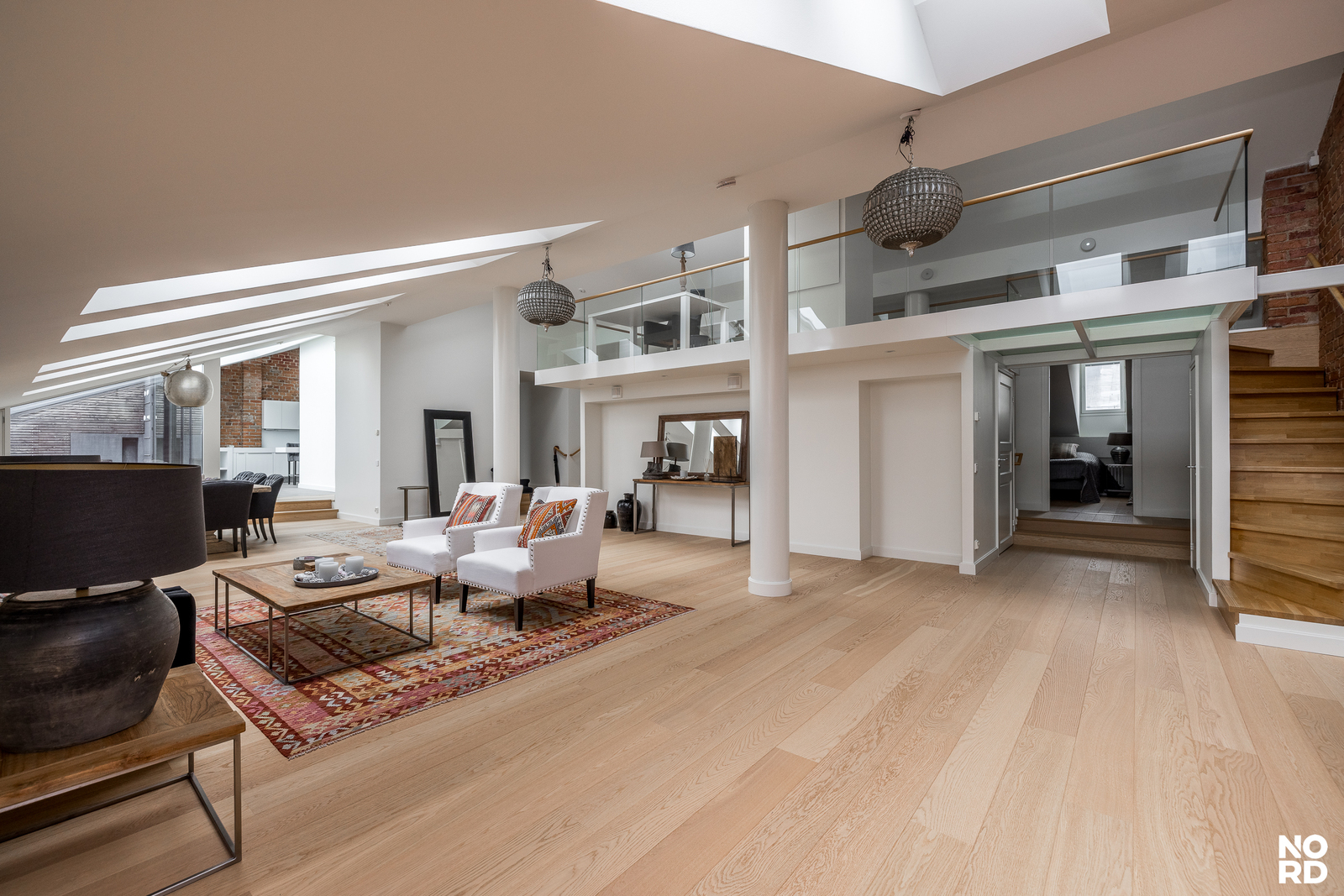 Hissillä pääsee suoraan huoneistoon omalla avaimella, mikä takaa yksityisyyden ja turvallisuuden. Sisään astuttaessa avautuu vaikuttava, avara olohuone, jossa yhdistyvät oleskelu- ja ruokailutilat saumattomasti. Tilasta on käynti avoparvekkeelle sekä tyylikkääseen Poggenpohlin keittiöön, josta löytyvät Gaggenaun huippuluokan kodinkoneet, avotakka sekä suora käynti kesäkäyttöön suunnitellulle terassille. Terassilla on myös oma ulkotakka.