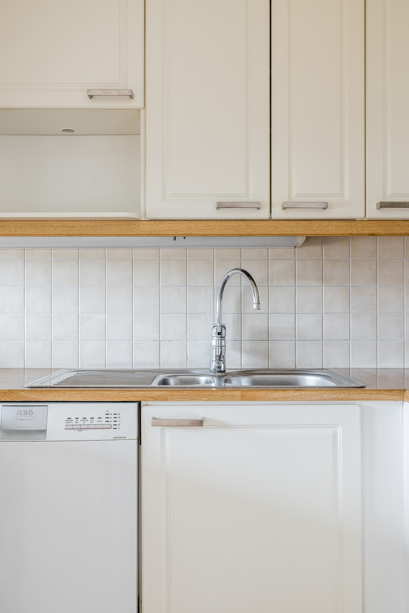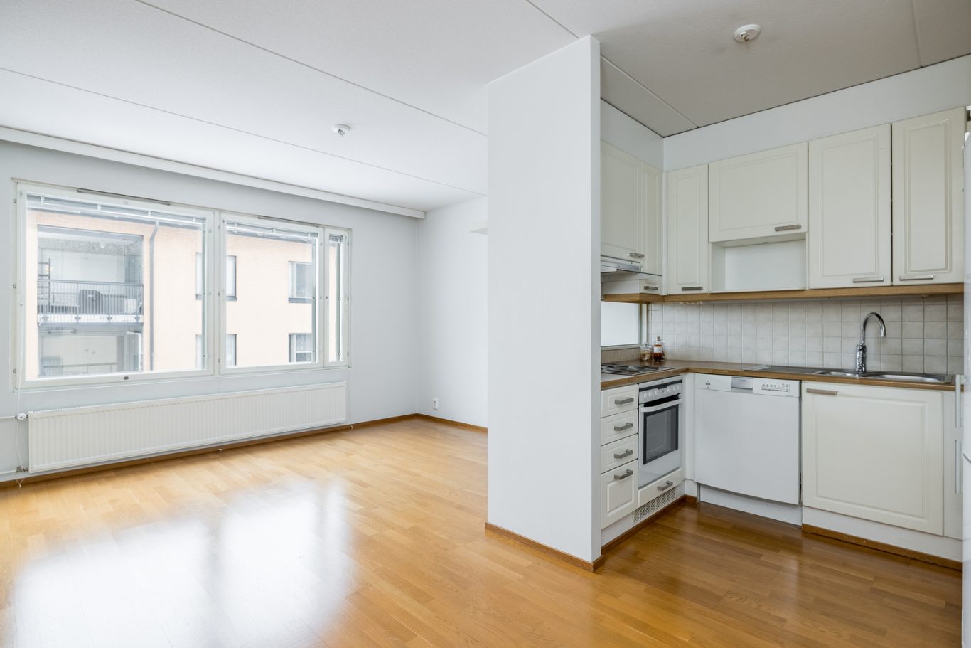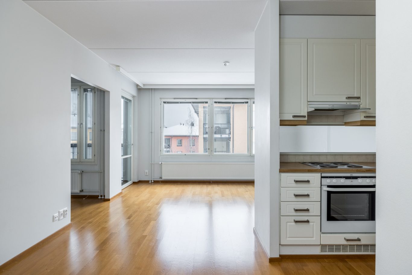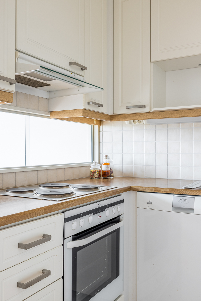 Tämä skandinaavisin sävyin toteutettu koti on täysin muuttovalmis. Tilava olohuoneen ja ruokailutilan yhdistelmä on tämän asunnon keskipiste ja sieltä löytyy reilusti oleskelutilaa. Täältä on käynti mukavankokoiselle lasitetulle parvekkeelle avarilla näkymillä. Olohuoneeseen yhdistyy vaaleansävyinen, kattavasti varusteltu keittiö, jossa on runsaasti kaappi- sekä laskutilaa ja sen edustalla on paikka ruokailuryhmälle.