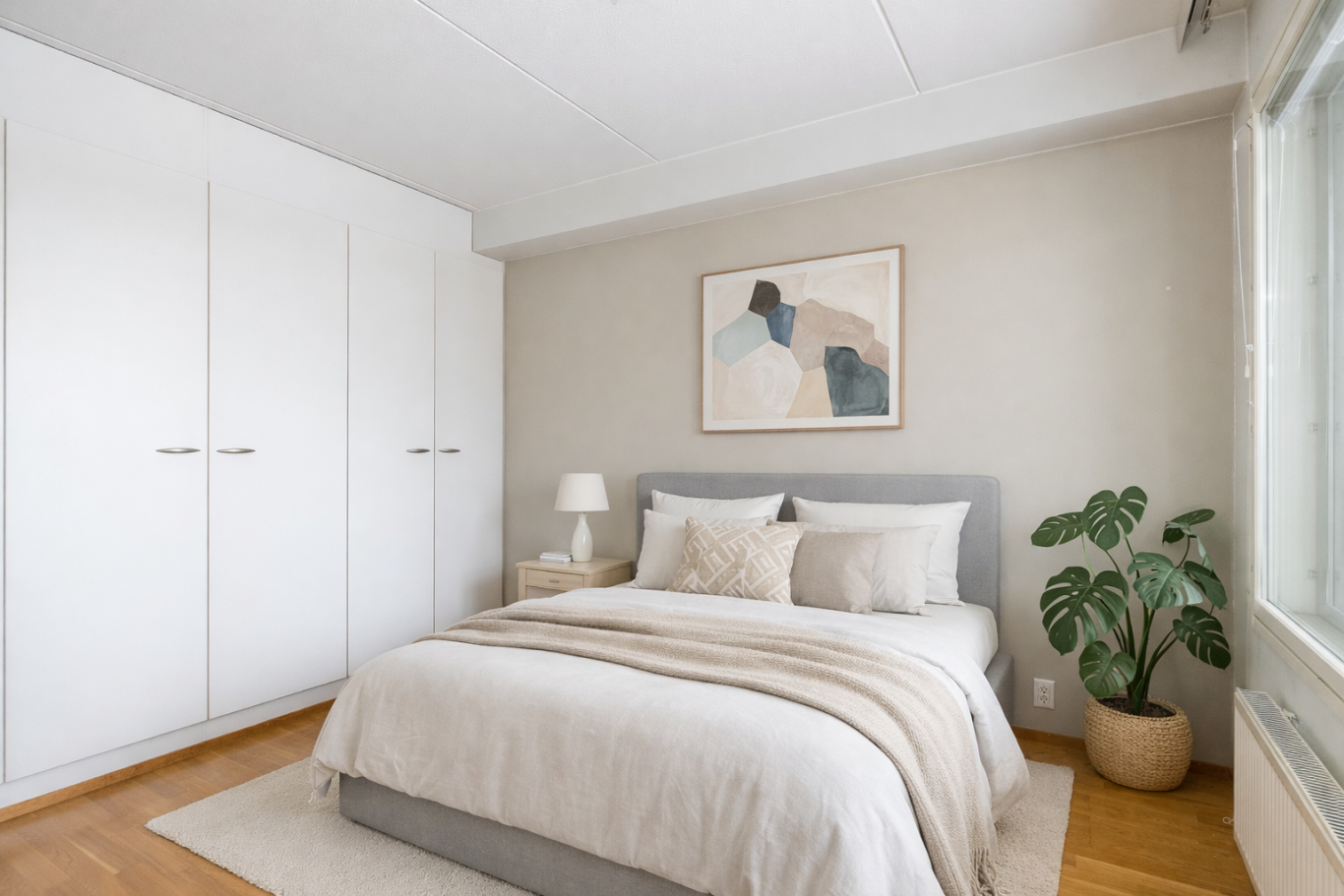 Makuuhuoneessa on tilaa suuremmallekin sängylle sekä esimerkiksi työpisteelle. Säilytystilaa löytyy reippaasti makuuhuoneen sekä eteisen kiinteistä kaapeista. Kokonaisuuden kruunaa tyylikkäästi toteutettu tilava kylpyhuone omalla saunalla!