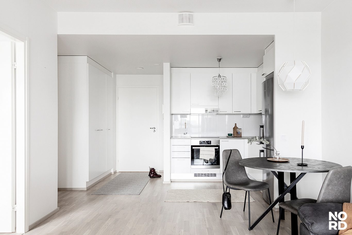 | Tilojen kuvaus | Eteisessä on käytännölliset kaapistot, joka tarjoaa runsaasti säilytystilaa. Lattiamateriaalina toimii parketti, ja seinät ovat maalatut. Selkeälinjainen tila toivottaa tervetulleeksi kotiin. |