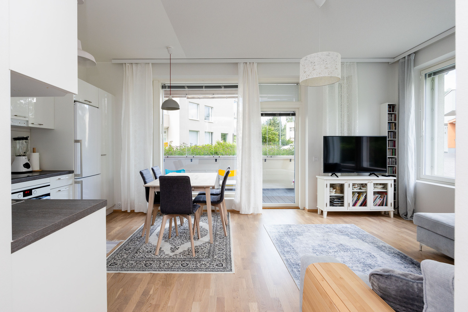 Olohuoneeseen mahtuu helposti reilun kokoinen sohvaryhmä pöytineen, ja keittiössä on tilaa myös suuremmalle ruokapöydälle tuoleineen, silti asumisen väljyyttä riittää niin arkeen kuin juhlaan.
