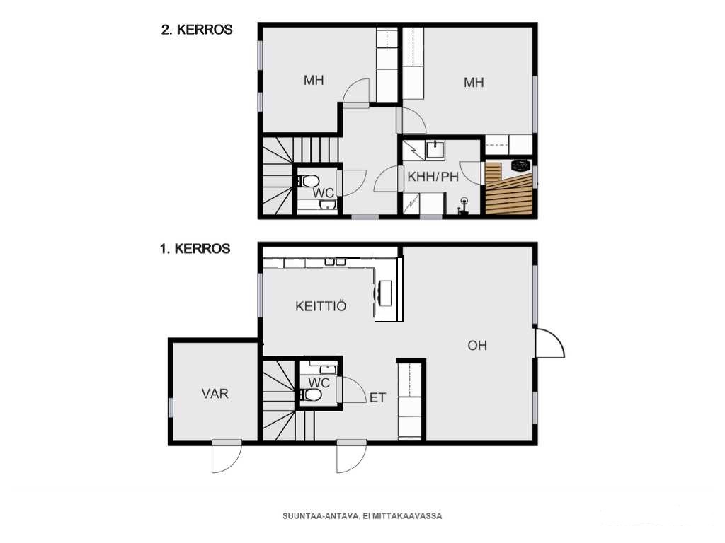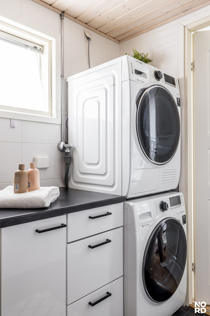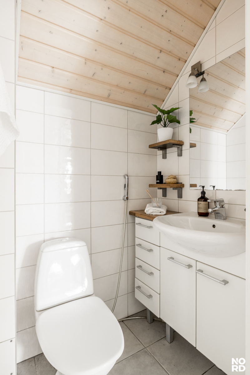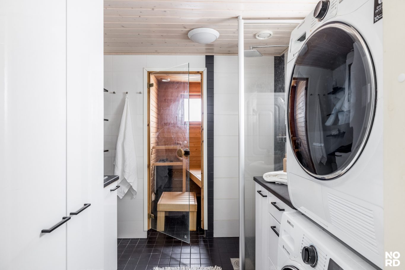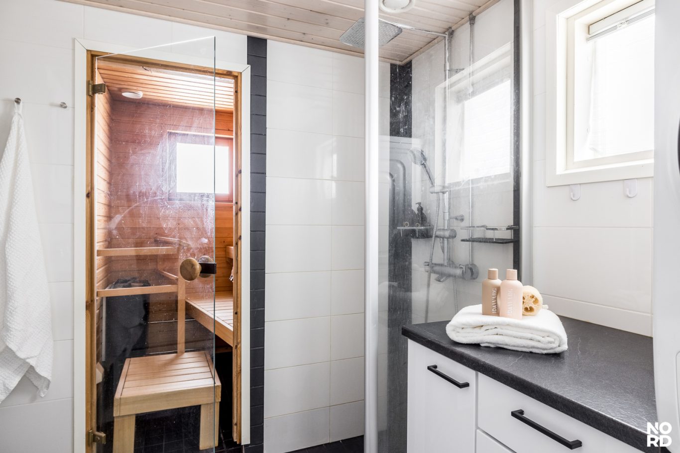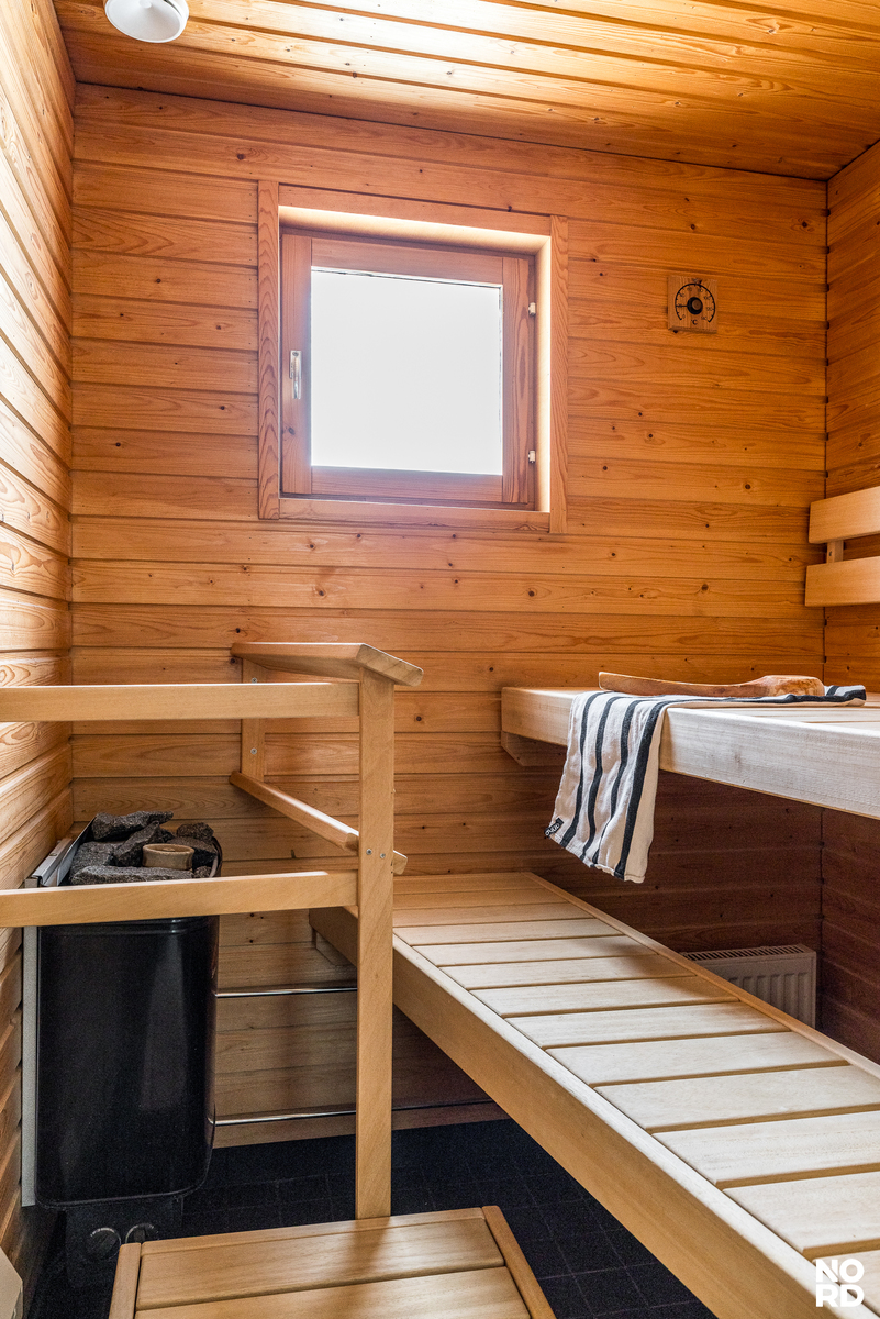 Kaksi makuuhuonetta, ikkunallinen sauna ja tyylikäs remontoitu kylpyhuone kodinhoitotiloineen ovat yläkerrassa, molemmissa kerroksissa on myös erillisvessa. Helteestä kotiin saapuessasi voit hengähtää helpotuksesta jo ovella, sillä viilentävä ilmalämpöpumppu pelastaa yöunesi, vaikka pihasi nauttii auringonpaisteesta aamupäivästä pitkälle iltaan.