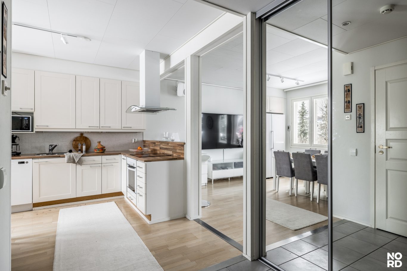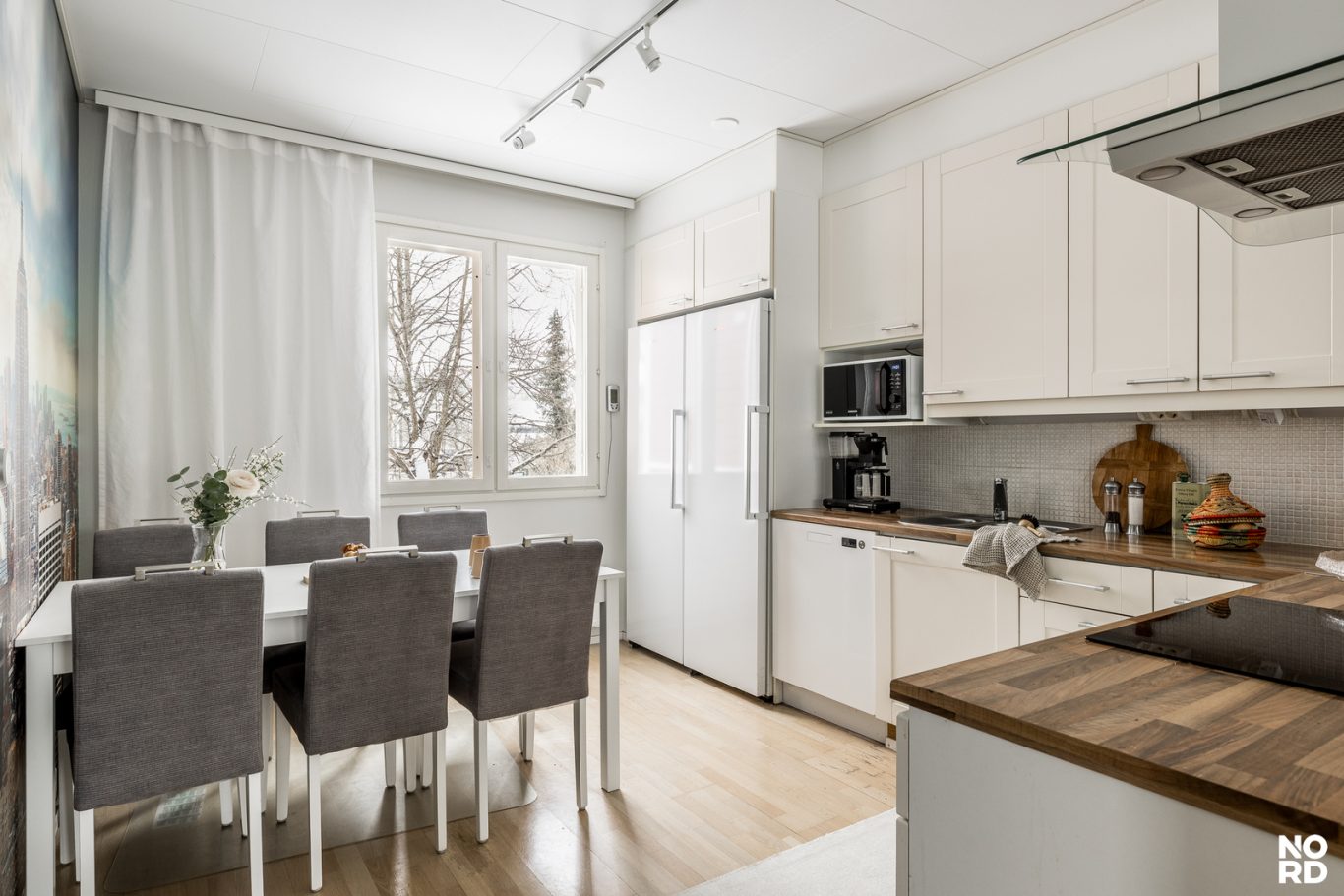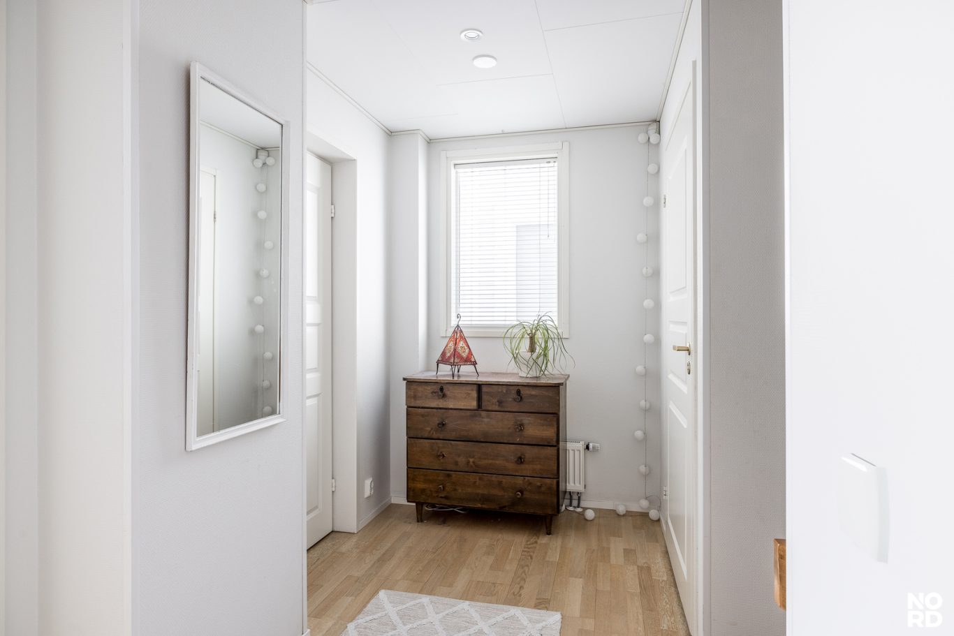 | Tehdyt korjaukset | Parketit on hiottu 2018, seiniä maalattu, yläeteiseen asennettu led-spotit, olohuoneen led-valaistus 2018. Taloyhtiö remontoi kylpyhuoneen ja saunan lattian sekä olohuoneen sisäkaton 2018. Samasssa yhtydessä uusittiin Kylpyhuoneen kaappien ovet ja taso. Ilmalämpöpumppu 2019. |