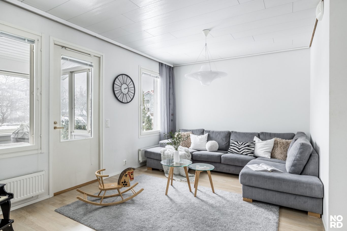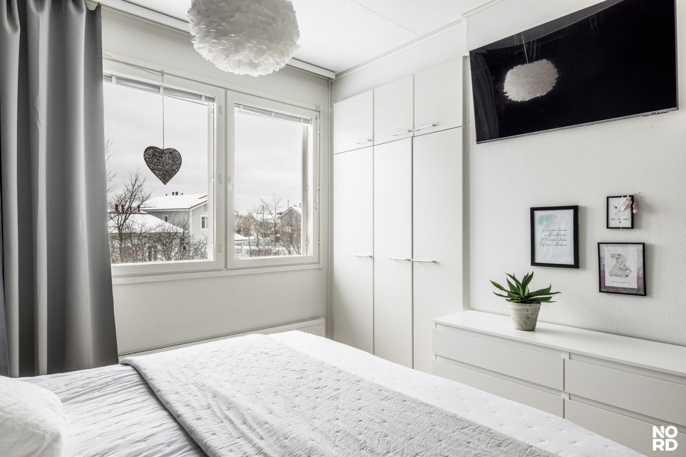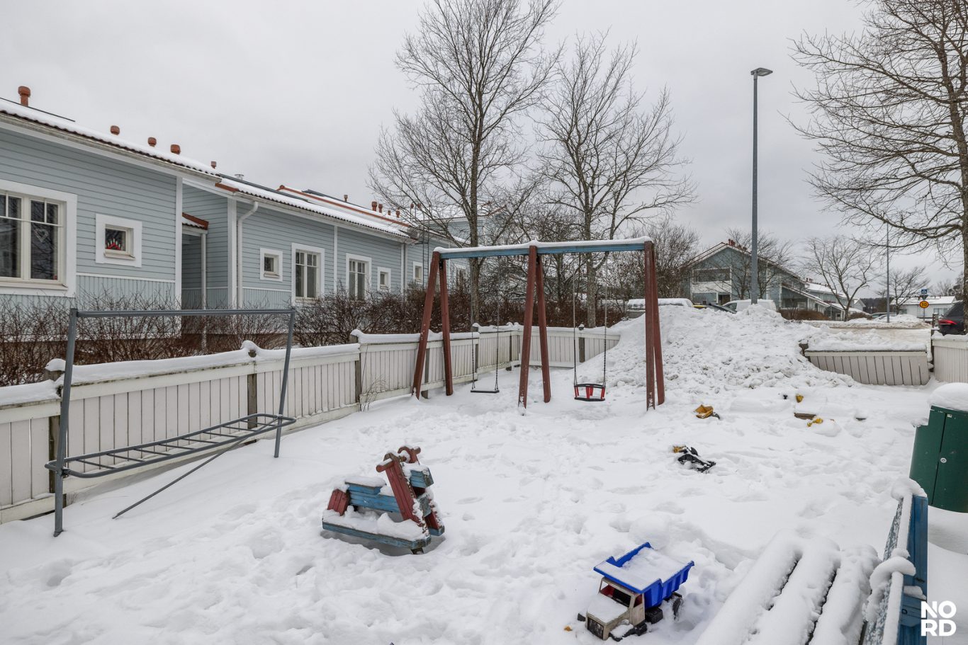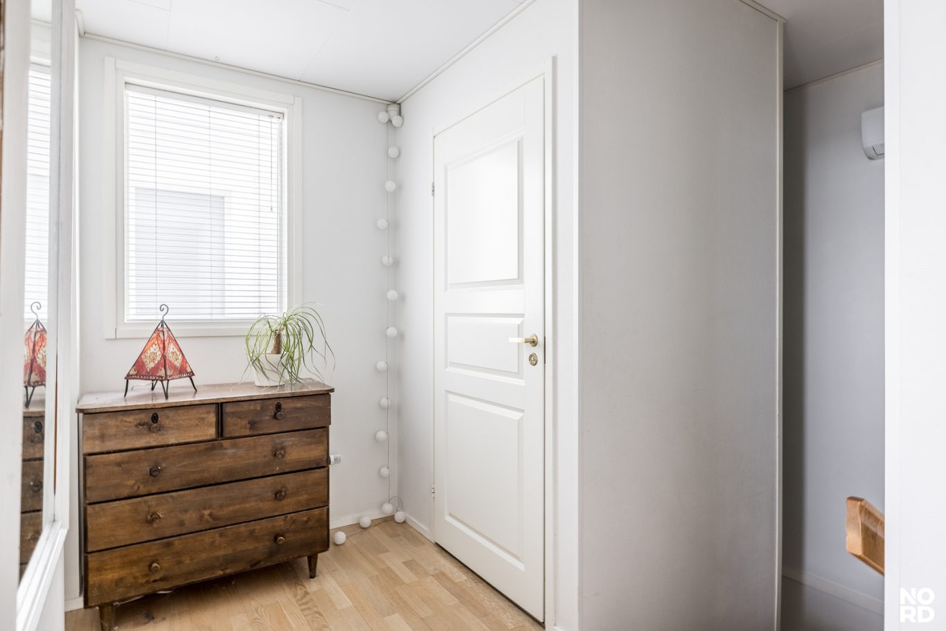 Kodissa on hyvin säilytystilaa, sisäänkäynnin yhteydessä on oma ulkovarasto ja kaksi sähköistettyä autopaikkaakin sijaitsevat kätevästi lähellä kotiovea. Hyvin hoidettu maalämpöyhtiö sijaitsee omalla tontilaan kätevästi kylän alkupäässä, lähellä palveluja ja yhteyksiä. Kodilla on oiva mikrosijainti rauhallisesti korttelin keskellä niin, ettei ympärillä ole autoliikennettä, pihan näkymänä on viihtyisä sisäpiha leikkipaikkoineen ja takana kulkeva kävelytie tuo avaruutta ympärille. Lyhyt kävelymatka koululle kulkee turvallisesti ylittämättä yhtään autotietä. Tämän rivin suosio on siis helppo ymmärtää!